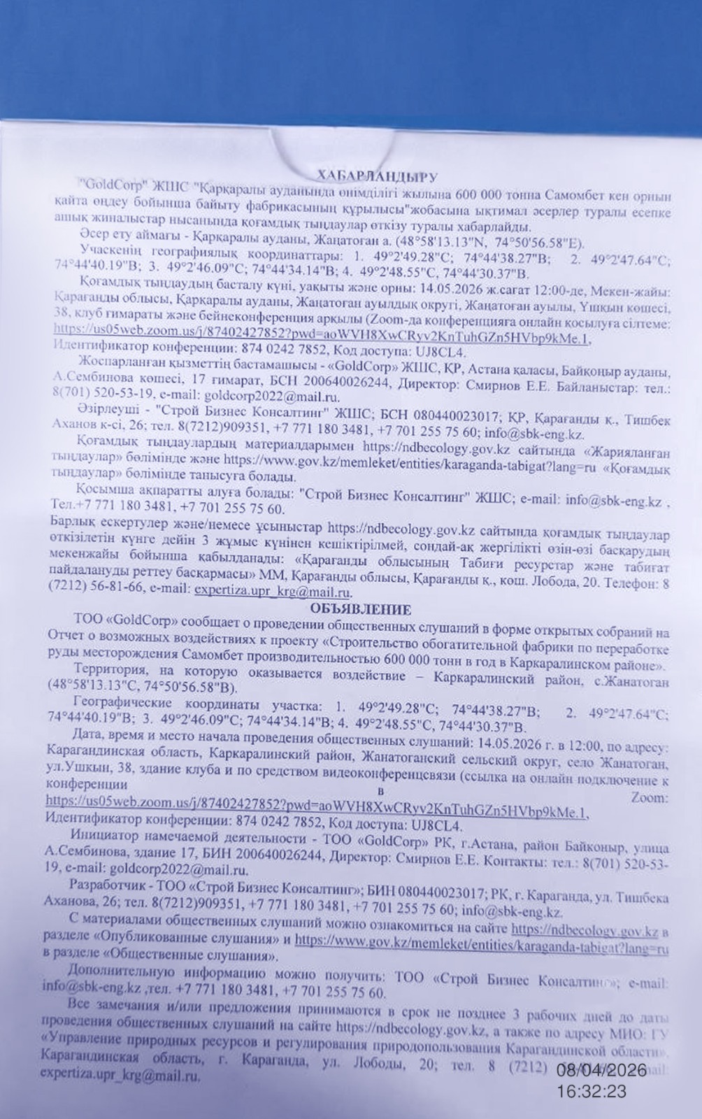 3. Общественные слушания организованны: Управление природных ресурсов и регулирования природопользования Карагандинской области, expertiza.upr_krg@mail.ru,