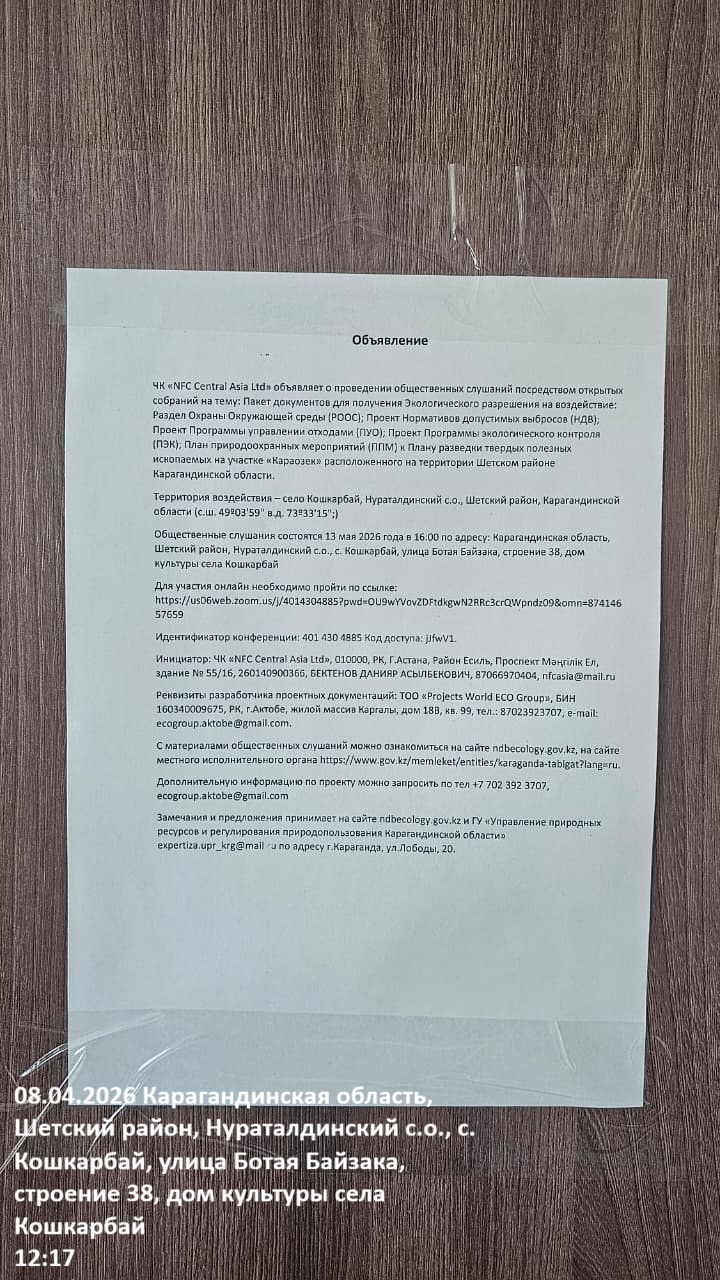3. Общественные слушания организованны: Управление природных ресурсов и регулирования природопользования Карагандинской области, expertiza.upr_krg@mail.ru,