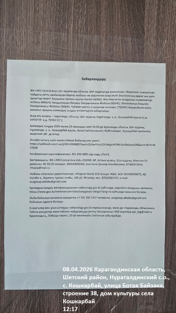 По проекту: ЧК «NFC Central Asia Ltd» Пакет документов для получения Экологического разрешения на воздействие: Раздел Охраны Окружающей среды (РООС); Проект Нормативов допустимых выбросов (НДВ); Проект Программы управлении отходами (ПУО); Проект Программы экологического контроля (ПЭК); План природоохранных мероприятий (ППМ) к Плану разведки твердых полезных ископаемых на участке «Караозек» расположенного на территории Шетском районе Карагандинской области.