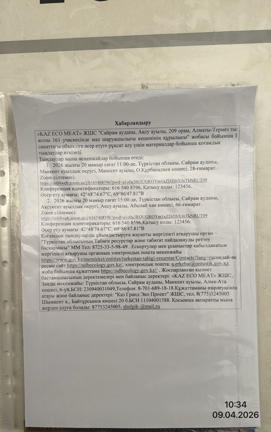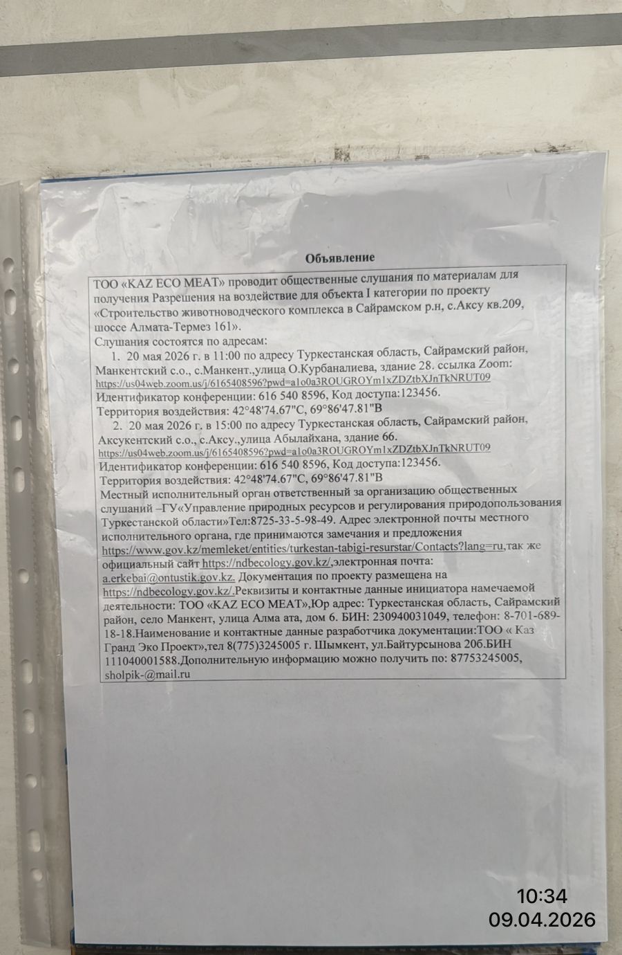 3. Общественные слушания организованны: Управление природных ресурсов и регулирования природопользования Туркестанской области, a.erkebai@ontustik.gov.kz,