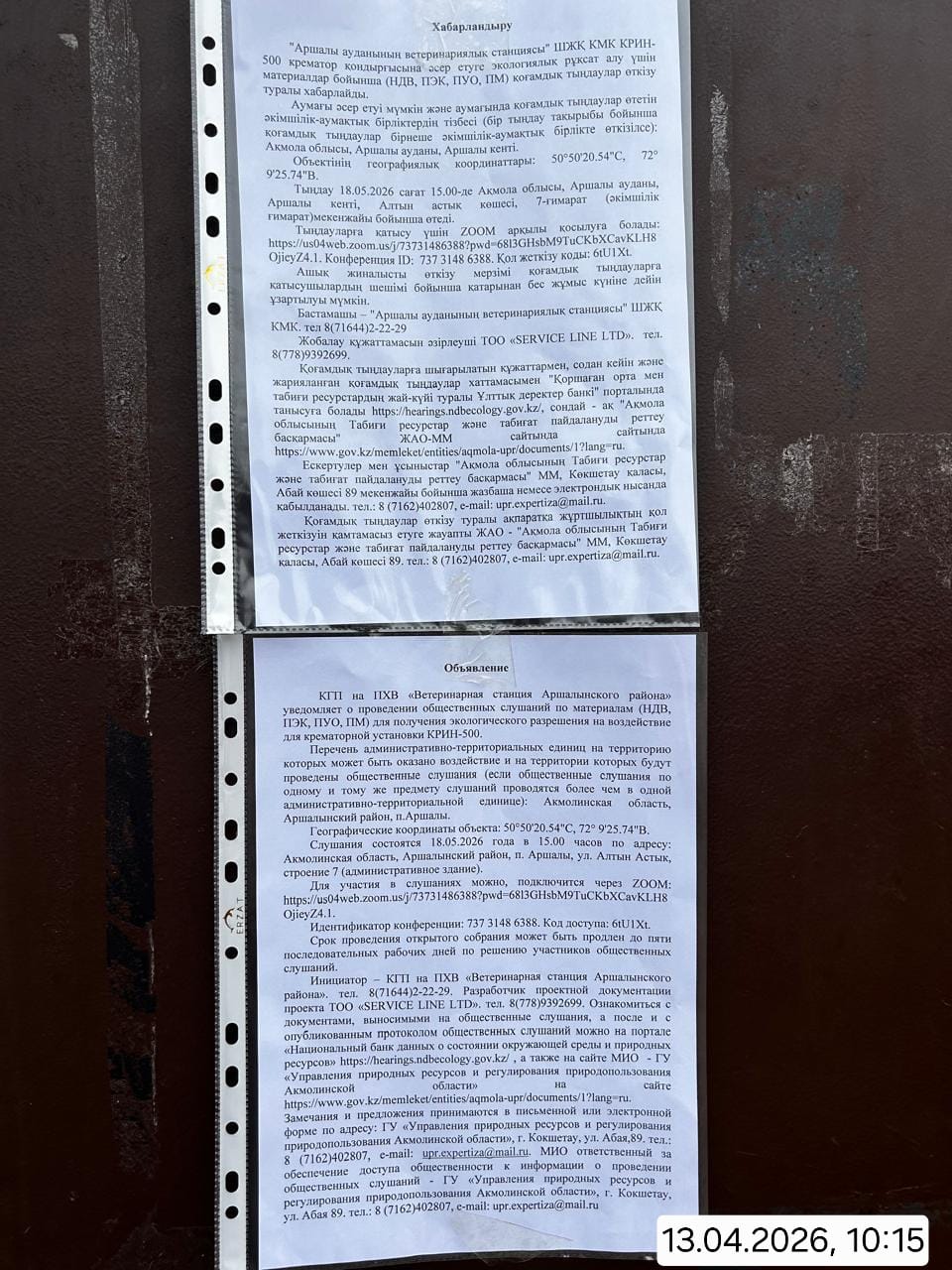 3. Общественные слушания организованны: Управление природных ресурсов и регулирования природопользования Акмолинской области, expeco@mail.ru,