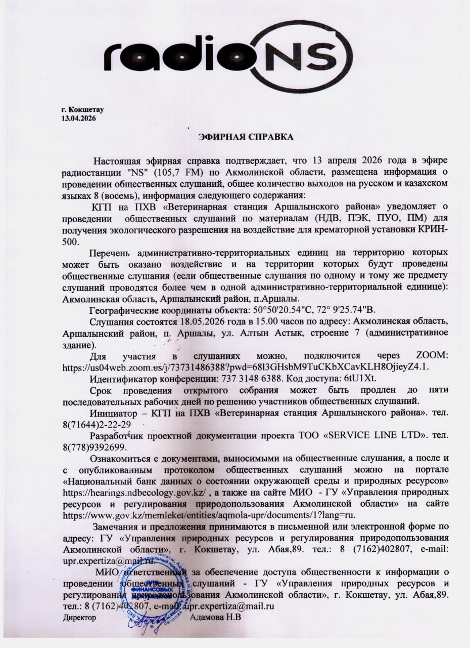 4. Повестка дня общественных слушаний: КГП на ПХВ «Ветеринарная станция Аршалынского района» является действующим предприятием и расположена в Акмолинской области, Аршалынский район, п. Аршалы, ул. Алтын Астык, строение 7. Основным видом деятельности является оказание ветеринарных услуг. КГП на ПХВ «Ветеринарная станция Аршалынского района» разрабатывает проект НДВ в связи с окончанием разрешением на эмиссию в окружающую среду на крематорную установку КРИН-500. Крематор КРИН-500 расположен в Акмолинской области, Аршалынский район, п. Аршалы, ул. Алтын Астык, строение 7. Ближайшая жилая зона находится на расстоянии 550 метров в восточном направлении и 600 метров юго-восточном направлении от крематора КРИН-500. Крематор предназначен для термического уничтожения биологических отходов, медицинских отходов, уничтожения падежа домашней птицы на птицефабриках, животноводческих комплексах, ветеринарных клиниках, больницах и предприятиях переработки сельскохозяйственной продукции. Годовой объем сжигания отходов составляет 6,5 тонн или 0,182 тонн в сутки. Крематор работает 36 дней в году.