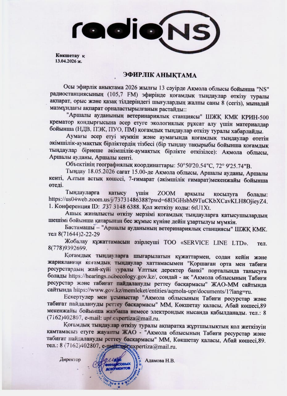 1.2. Место проведения: Акмолинская область, Aршалынский район, Аршалынская п.а., п.Аршалы, ул. Алтын Астык, строение 7 (административное здание). Для участия в слушаниях можно, подключится через ZOOM: https://us04web.zoom.us/j/73731486388?pwd=68l3GHsbM9TuCKbXCavKLH8OjieyZ4.1 Идентификатор конференции: 737 3148 6388. Код доступа: 6tU1Xt.