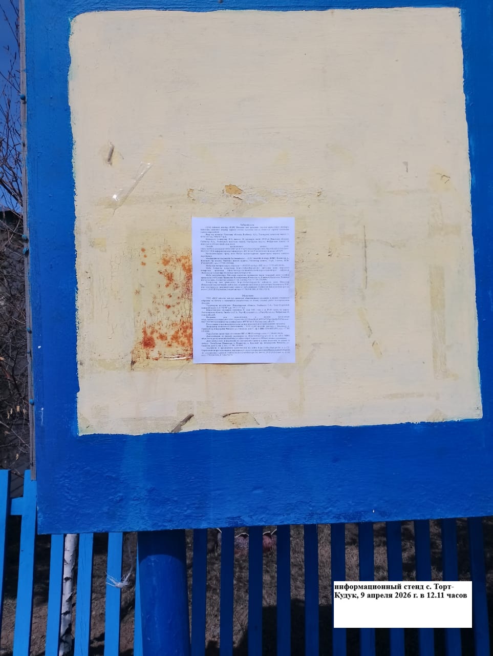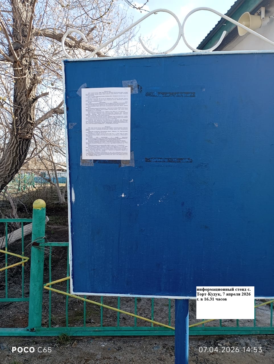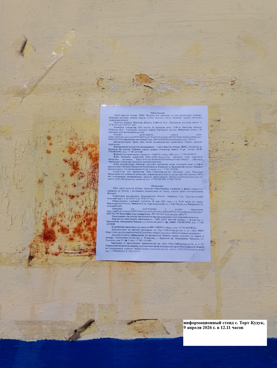 6.3. расположение мест, специально предназначенных для Размещения печатных объявлений (доски объявлений): Павлодарская область, Экибастуз Г.А., Торт-Кудукский с.о., с.Торт-Кудук, информационные стенды поселка