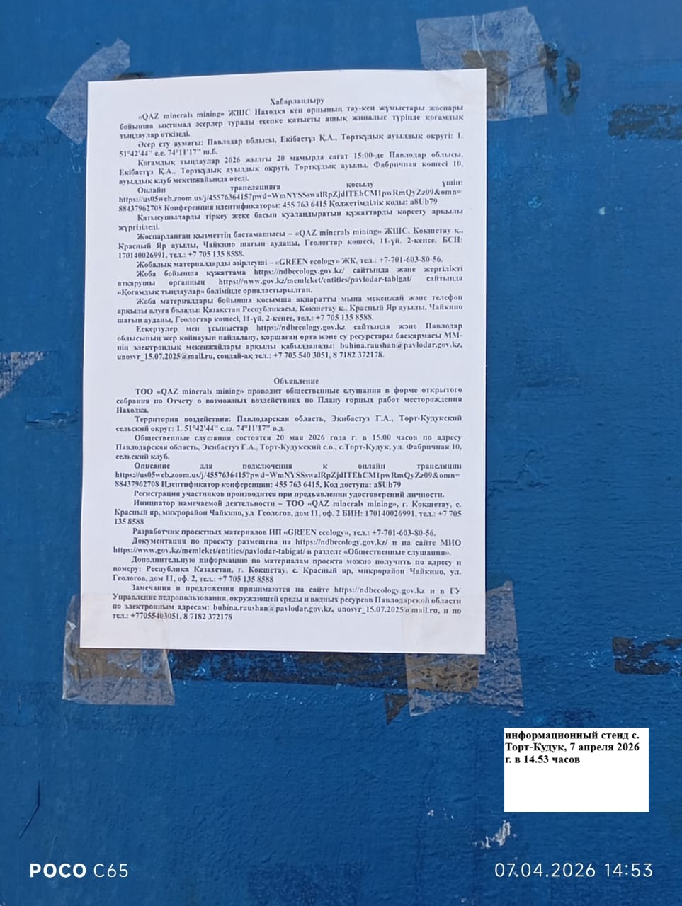3. Общественные слушания организованны: УПРАВЛЕНИЕ НЕДРОПОЛЬЗОВАНИЯ, ОКРУЖАЮЩЕЙ СРЕДЫ И ВОДНЫХ РЕСУРСОВ ПАВЛОДАРСКОЙ ОБЛАСТИ, buhina.raushan@pavlodar.gov.kz, unosvr_15.07.2025@mail.ru, +77055403051, 8 7182 372178,