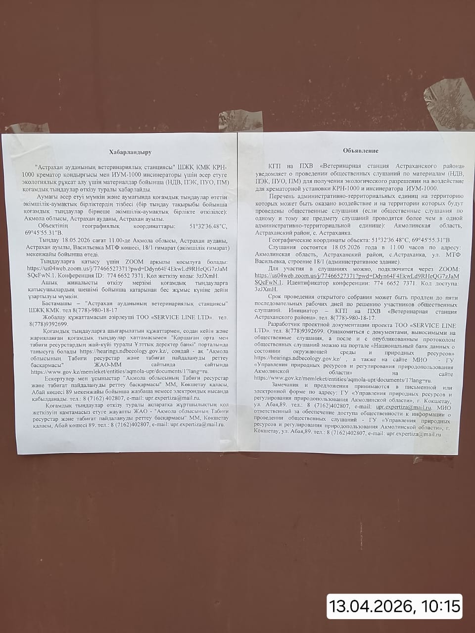 6. Объявление о проведении общественных слушаний на казахском и русском языках будет распространено следующими способами: