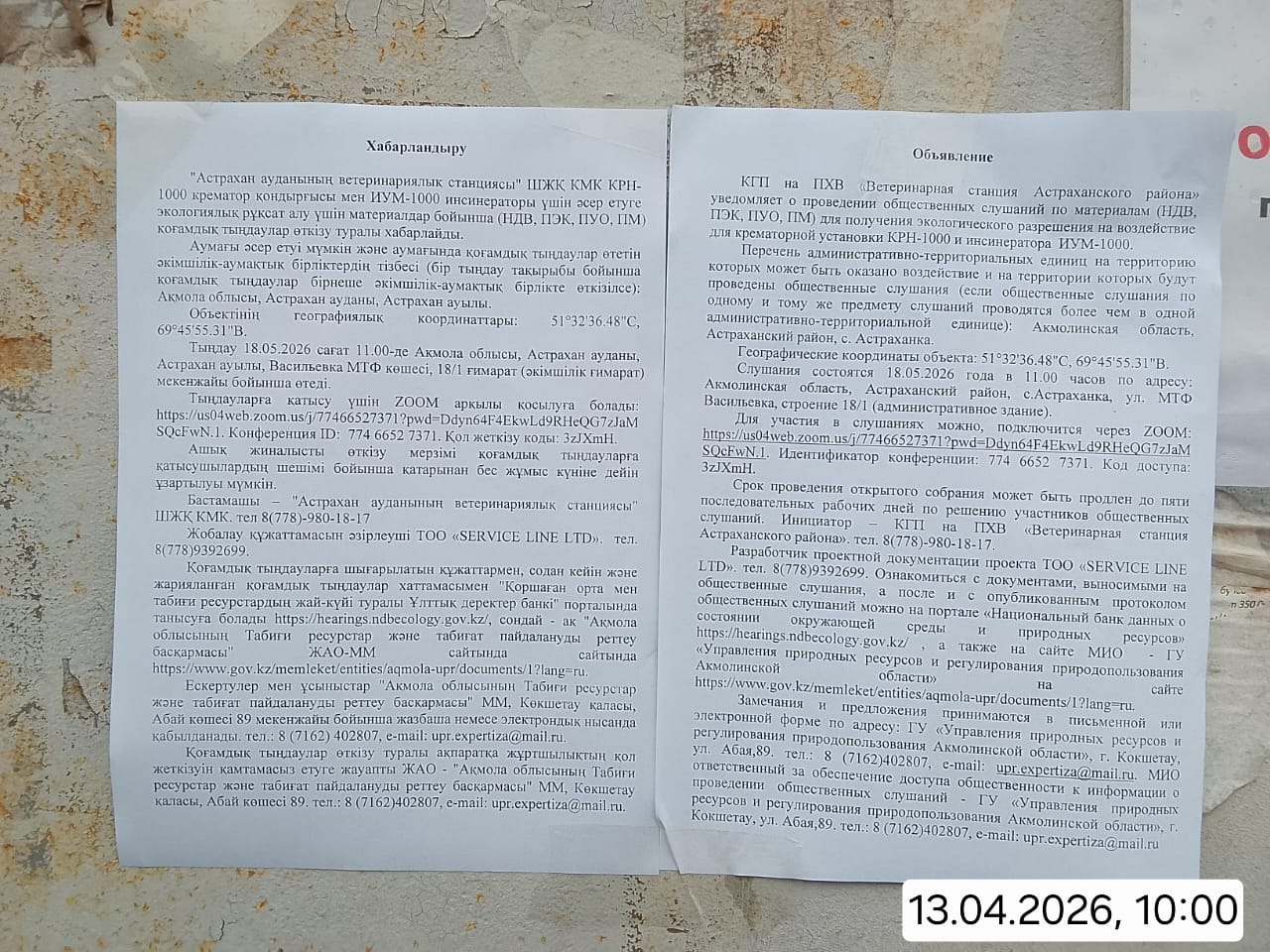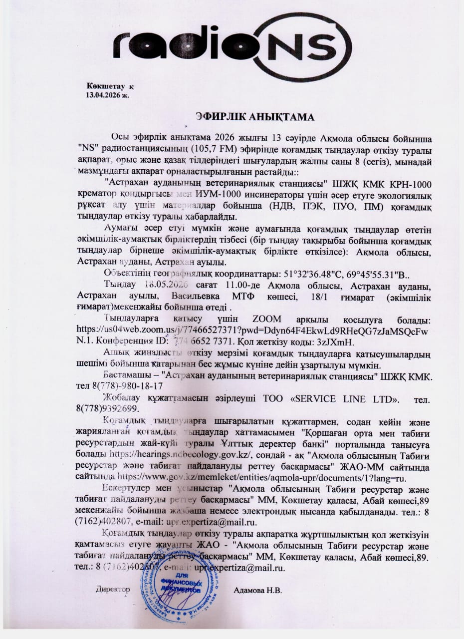 1.2. Место проведения: Акмолинская область, Астраханский район, Астраханский с.о., с.Астраханка, ул. МТФ Васильевка, строение 18/1 (административное здание). Для участия в слушаниях можно, подключится через ZOOM: https://us04web.zoom.us/j/77466527371?pwd=Ddyn64F4EkwLd9RHeQG7zJaMSQcFwN.1. Идентификатор конференции: 774 6652 7371. Код доступа: 3zJXmH.