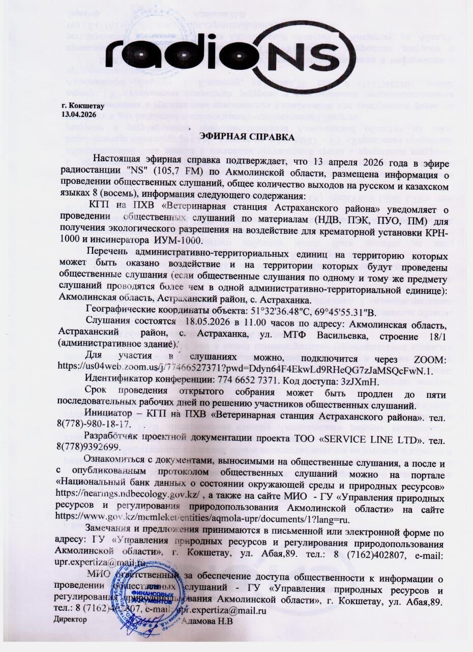 4. Повестка дня общественных слушаний: КГП на ПХВ «Ветеринарная станция Астраханского района» является действующим предприятием и расположена в Акмолинской области, Астраханский район, с. Астраханка, ул. МТФ Васлильевка, строение 18/1. Основным видом деятельности является оказание ветеринарных услуг. КГП на ПХВ «Ветеринарная станция Астраханского района» разрабатывает проектную документацию в связи с окончанием разрешением на эмиссию в окружающую среду для крематорной установки с камерой дожига КРН-1000 и автономный мобильный комплекс для термического уничтожения биоорганических отходов (инсинератор) ИУМ-1000. Крематорная установка с камерой дожига КРН-1000 и автономный мобильный комплекс для термического уничтожения биоорганических отходов (инсинератор) ИУМ-1000 расположены в Акмолинской области, Астраханский район, с. Астраханка, ул. МТФ Васлильевка, строение 18/1. Ближайшая жилая зона находится на расстоянии 450 метров в юго-западном направлении и 1100 метров восточном направлении от территории предприятия. Географические координаты объекта: 51°32'36.48"С, 69°45'55.31"В. Данный объект является существующим и другого выбора мест расположения не предусматривается. Крематоры – предназначены для утилизации биологических отходов (трупы птиц и животных) посредством сжигания, что является одним из наиболее простых и действенных способов обеспечения санитарной чистоты в местах их появления. Годовой объем сжигания отходов составляет 18,0 тонн или 0,48 тонн в сутки. Крематоры работают 30 дней в году.