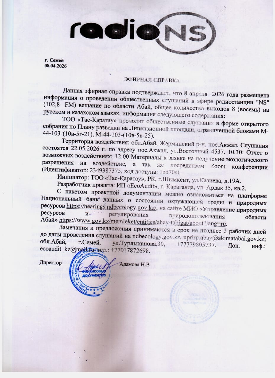 4. Повестка дня общественных слушаний: ТОО «Тас-Қаратау» предусматривает разведку твердых полезных ископаемых работ на площади Лиицензии № 3756-EL от 29.10.2025 г. Согласно п.2.3 Раздела 2 Приложения 1 к Экологическому кодексу Республики Казахстан от 2 января 2021 года № 400-VI ЗРК, разведка твердых полезных ископаемых с извлечением горной массы с перемещением почвы для целей оценки ресурсов твердых полезных ископаемых входит в перечень видов намечаемой деятельности и объектов, для которых проведение процедуры скрининга воздействий намечаемой деятельности является обязательным. В административном отношении площадь проектируемых работ расположена на территории Жарминского района области Абай. Районный центр – пос. Калбатау находится в 20 км к северо-востоку от проектируемой площади. Ближайшие населенные пункты: поселок Акжал – более 2,5 км. Период разведки: 2025-2028 гг. Проектирование: 2025 год Полевые работы поисковые маршруты: 2025 г. - 23 п.км топогеодезические работы: топогеодезическая съемка участков: 2026 г. – 4,6 км2 вынос в натуру пунктов съем 2026 г. 95 точек 2027 г. 25 точек электроразведка ВП-ДОЗ (сеть 200×50м): 2026 г. - 35 п.км Горные работы: проходка канав 2026 г. 600 м3 2027 г. 120 м3 проходка траншей 2026 г. 3500 м3 2027 г. 1000 м3 проходка шурфов 2026 г. 200 м3 2027 г. 20 м3 Буровые работы бурение колонковых скважин 2026 г. 1400 п.м 2027 г. 340 п.м геофизические исследования скважин 2026 г. 1400 п.м 2027 г. 340 п.м Отбор проб, в т.ч. геохимические пробы 2026 г. 450 проб 2027 г. 75 проб бороздовые пробы 2026 г. 250 проб 2027 г. 34 проб керновые пробы (с распилкой) 2026 г. 180 проб 2027 г. 30 проб для определения физических свойств 2026 г. 5 проб образцы на прозр. и полир. шлифы 2026 г. 10 проб Геологическое сопровождение полевых работ 2025 г. 2 отр/мес 2026 г. 6 отр/мес 2027 г. 6 отр/мес Обработка проб и аналитические работы Обработка проб керновых 2026 г. 180 проб 2027 г. 130 проб геохимических 2026 г. 450 проб 2027 г. 75 проб бороздовых пробы 2026 г. 250 проб 2027 г. 34 проб аналитические работы пробирный анализ 2026 г. 859 анализ 2027 г. 260 анализ химанализ 2026 г. 480 анализ 2027 г. 70 анализ внутренний контроль (5 %) 2026 г. 25 анализ 2027 г. 5 анализ внешний контроль (5 %) 2026 г. 25 анализ 2027 г. 5 анализ определение физико-механических свойств горных пород и руд 2026 г. 5 проб петрографическое исследование 2026 г. 10 шлиф Организация полевых работ Ликвидация полевых работ Трансп. грузов и персонала Временное строительство Текущая камеральная обр. Составление Отчета по результатам работ с подсчетом запасов: 2028 год Эмиссионные работы будут осуществляться с 2026 по 2027 гг., работы сезонные в теплый период, 180 дн/год. Полевой лагерь представлен вагончиками. Для обеспечения освещения полевого лагеря будет использоваться дизельная электростанция Предусматривается обустройство буровых площадок. Для промывочной жидкости предусмотрены отстойники, которые будут переноситься на каждую скважину. Отстойник будет изготовлен в виде герметичного металлического бака объемом 3-5м3. После окончания бурения скважины отстойник будет отсаживаться и чистая вода будет отливаться на устье скважин. А отсаженный материал в виде глины, суглинка, супеси будет заполняться в устье для заполнения отверстия скважин: Проектом поисковых работ намечается проходка шурфов вручную с последующей рекультивацией (обратная засыпка) механизированным способом Проходка канав и трашей, подготовка буровых площадок будут осуществляться одноков