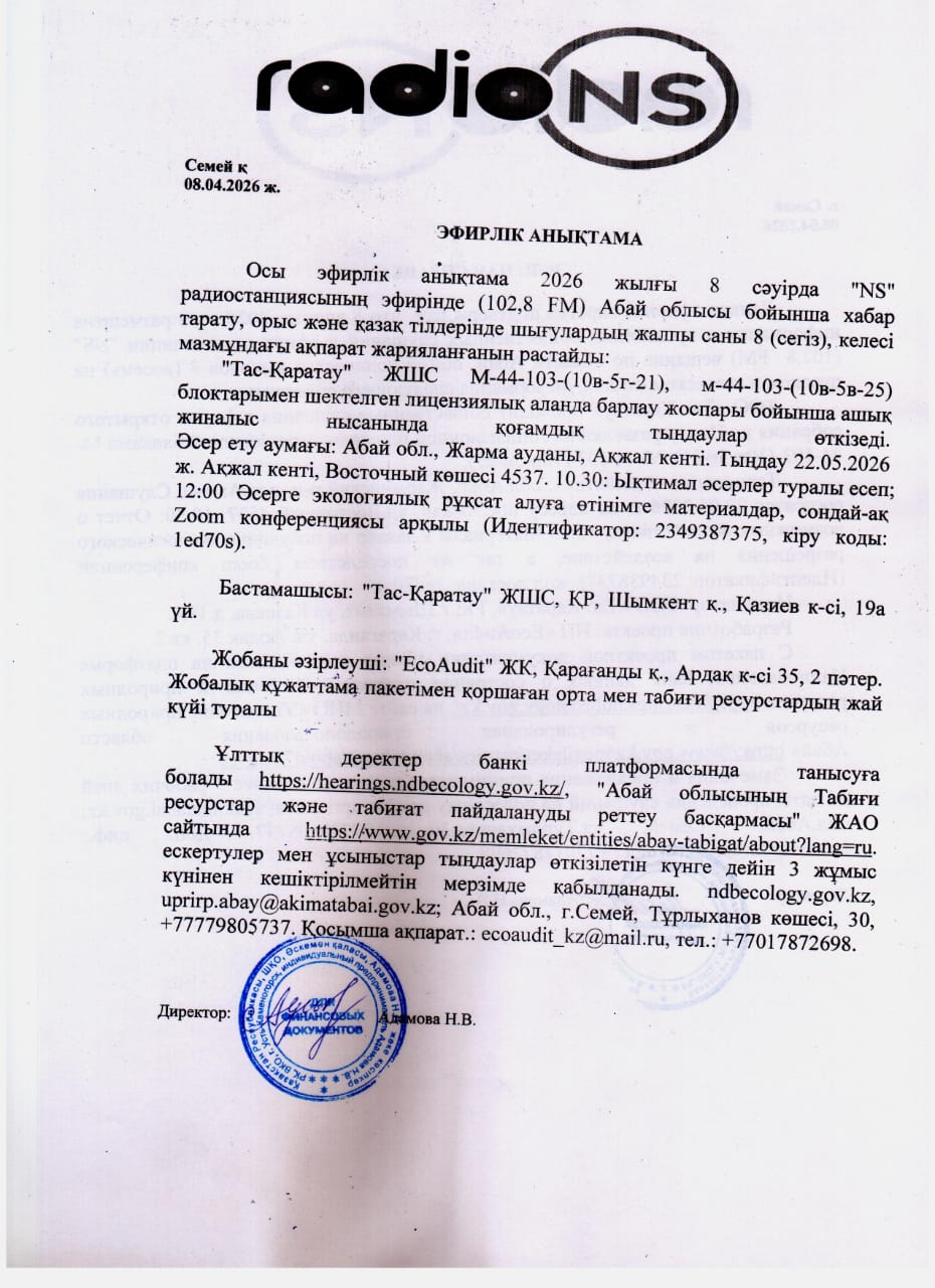3. Общественные слушания организованны: Главный специалист УПР и ПР область Абай, prirodnyye_resursy_obl.abay@mail.ru,