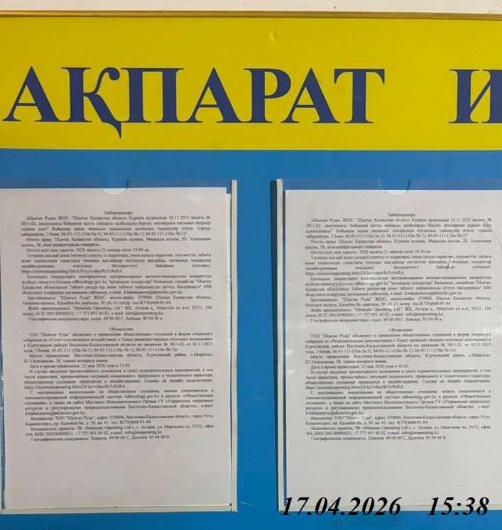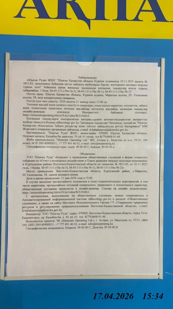 3. Общественные слушания организованны: Управление природных ресурсов и регулирования природопользования Восточно-Казахстанской области, d.babakanova@akimvko.gov.kz,
