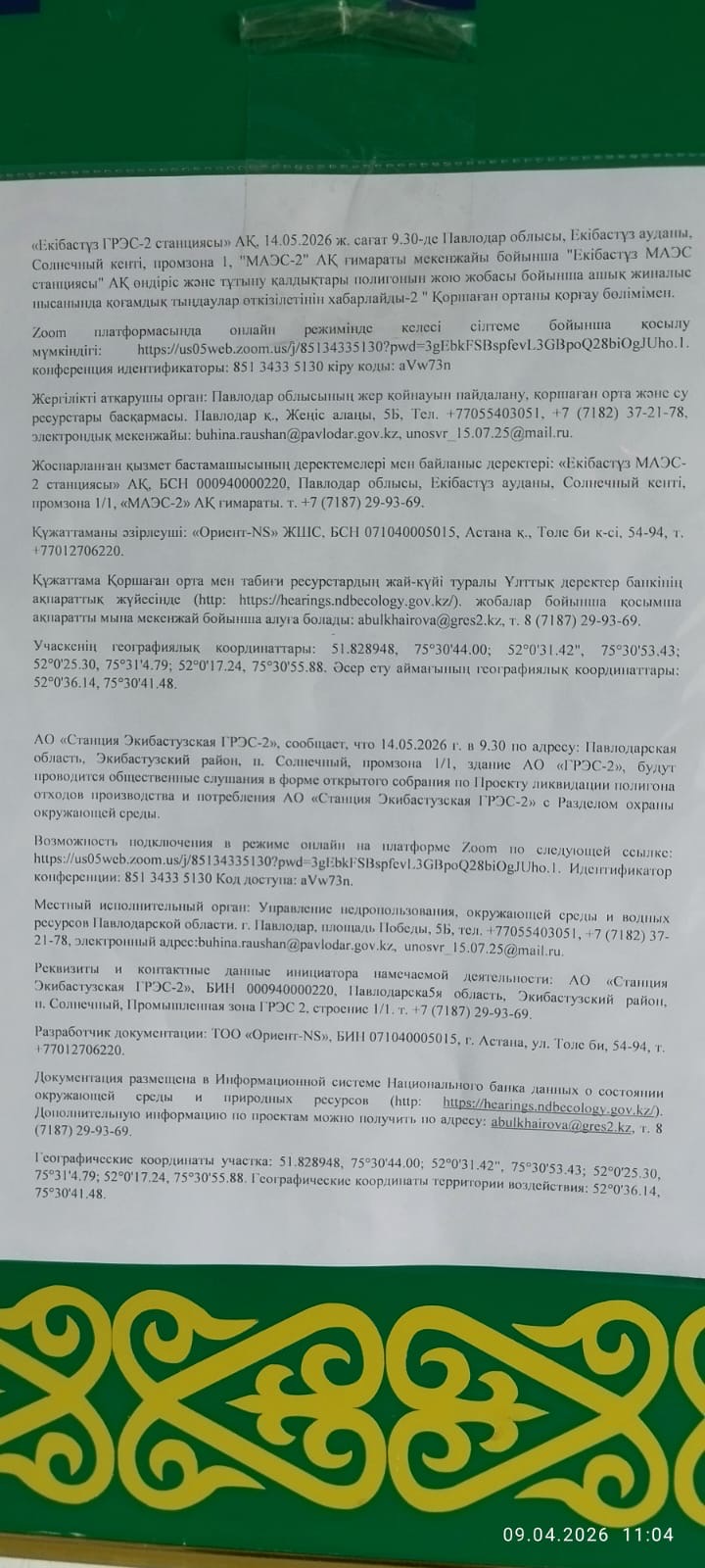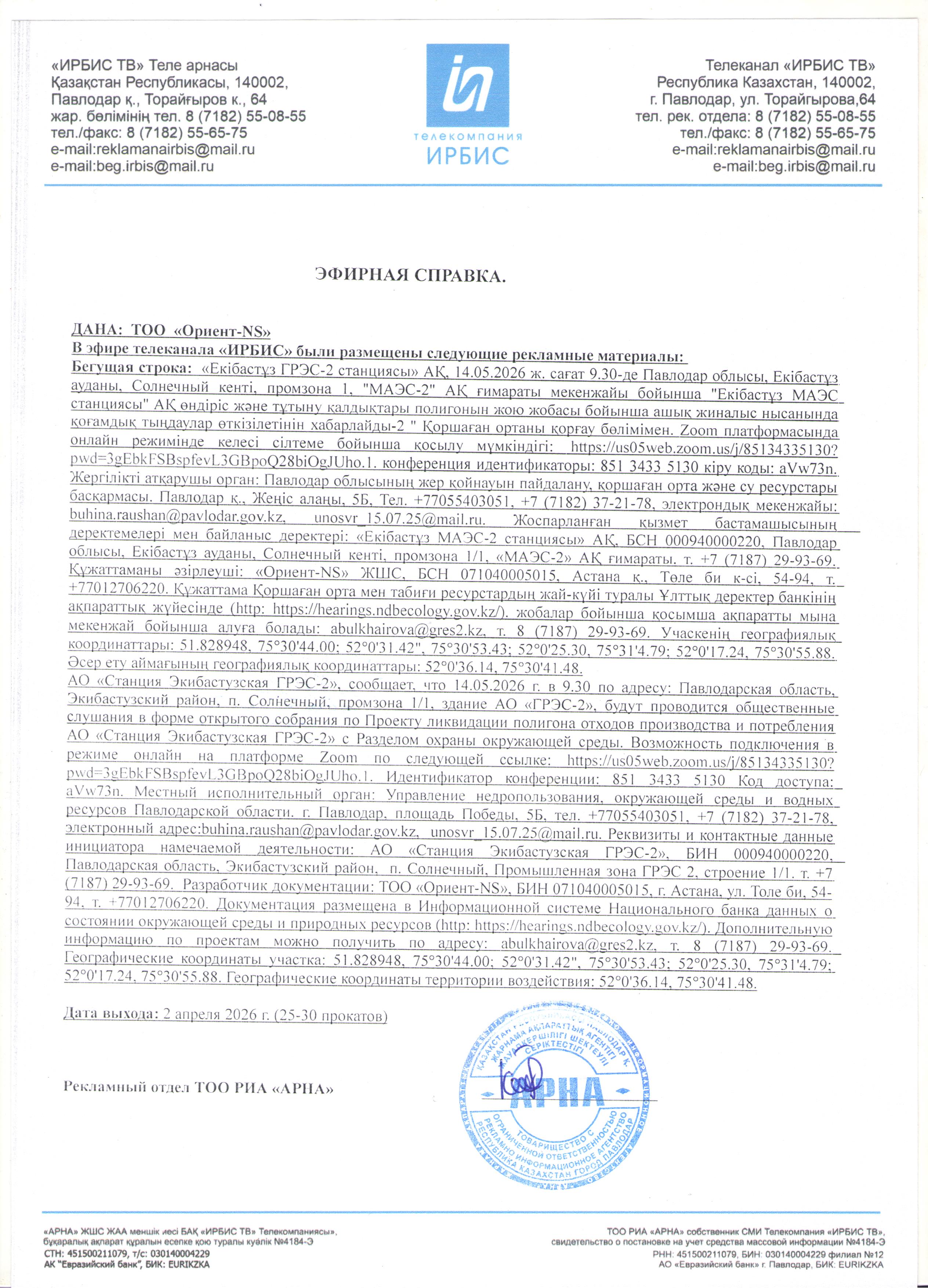 1.2. Место проведения: Павлодарская область, Экибастуз Г.А., Солнечная п.а., п.Солнечный, промышленная зона ГРЭС-2, строение 1/1, https://us05web.zoom.us/j/85134335130?pwd=3gEbkFSBspfevL3GBpoQ28biOgJUho.1