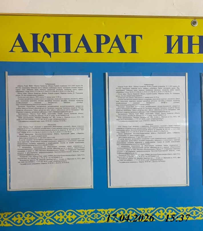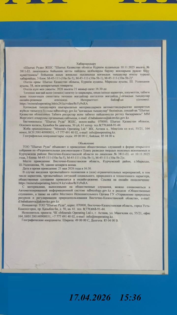 3. Общественные слушания организованны: Управление природных ресурсов и регулирования природопользования Восточно-Казахстанской области, d.babakanova@akimvko.gov.kz,