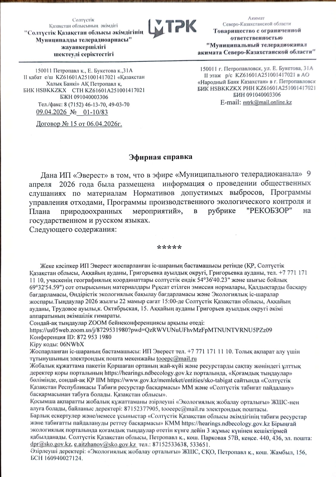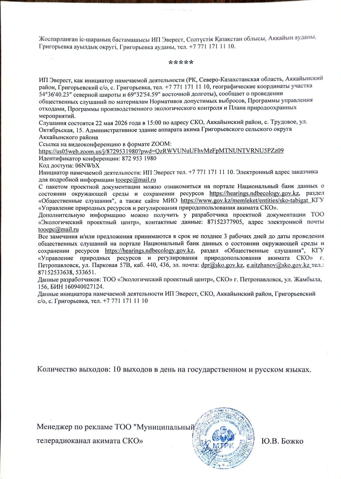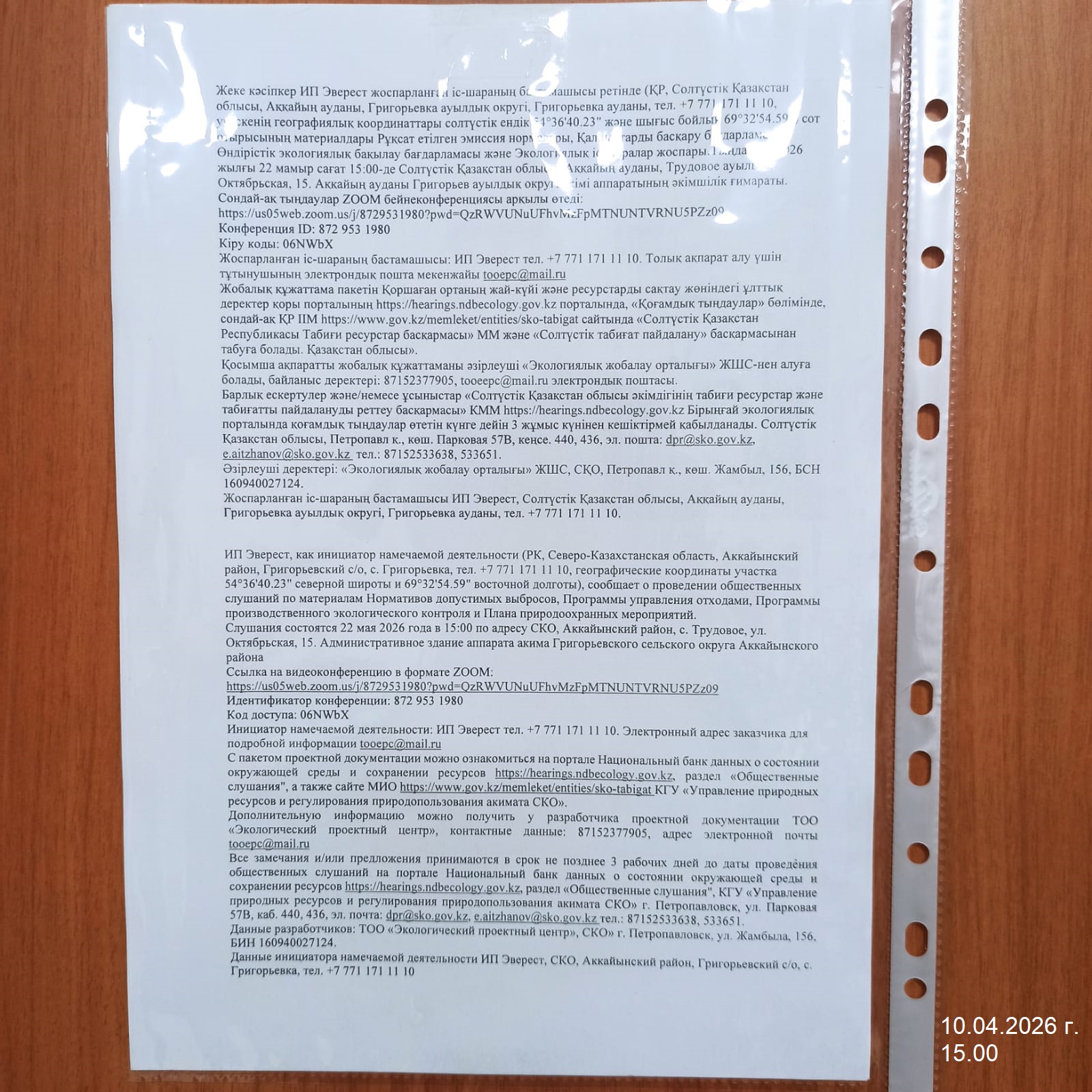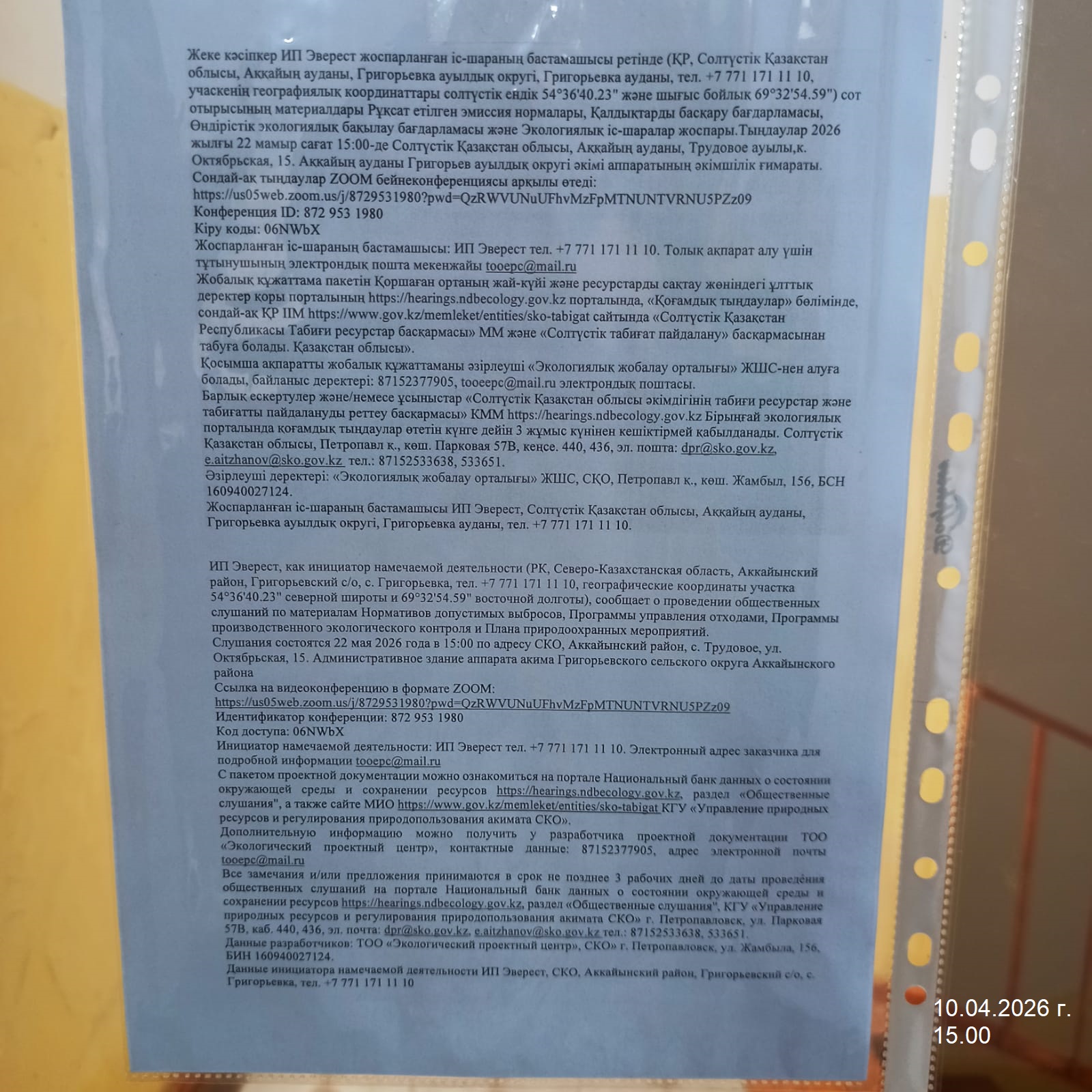 3. Общественные слушания организованны: Управление природных ресурсов и регулирования природопользования Северо-Казахстанской области, a.sapozhnikova@sko.gov.kz, dpr@sko.gov.kz. тел: 8 (7152) 53-36-38,
