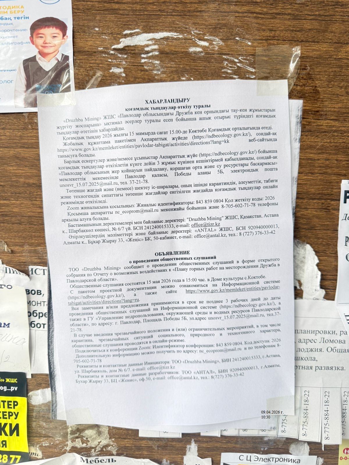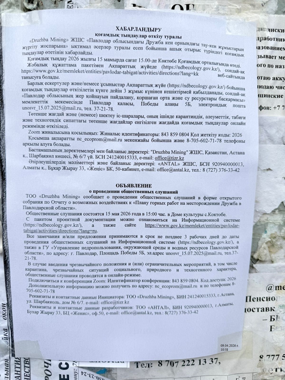 3. Общественные слушания организованны: УПРАВЛЕНИЕ НЕДРОПОЛЬЗОВАНИЯ, ОКРУЖАЮЩЕЙ СРЕДЫ И ВОДНЫХ РЕСУРСОВ ПАВЛОДАРСКОЙ ОБЛАСТИ, buhina.raushan@pavlodar.gov.kz, unosvr_15.07.2025@mail.ru, +77055403051, 8 7182 372178,