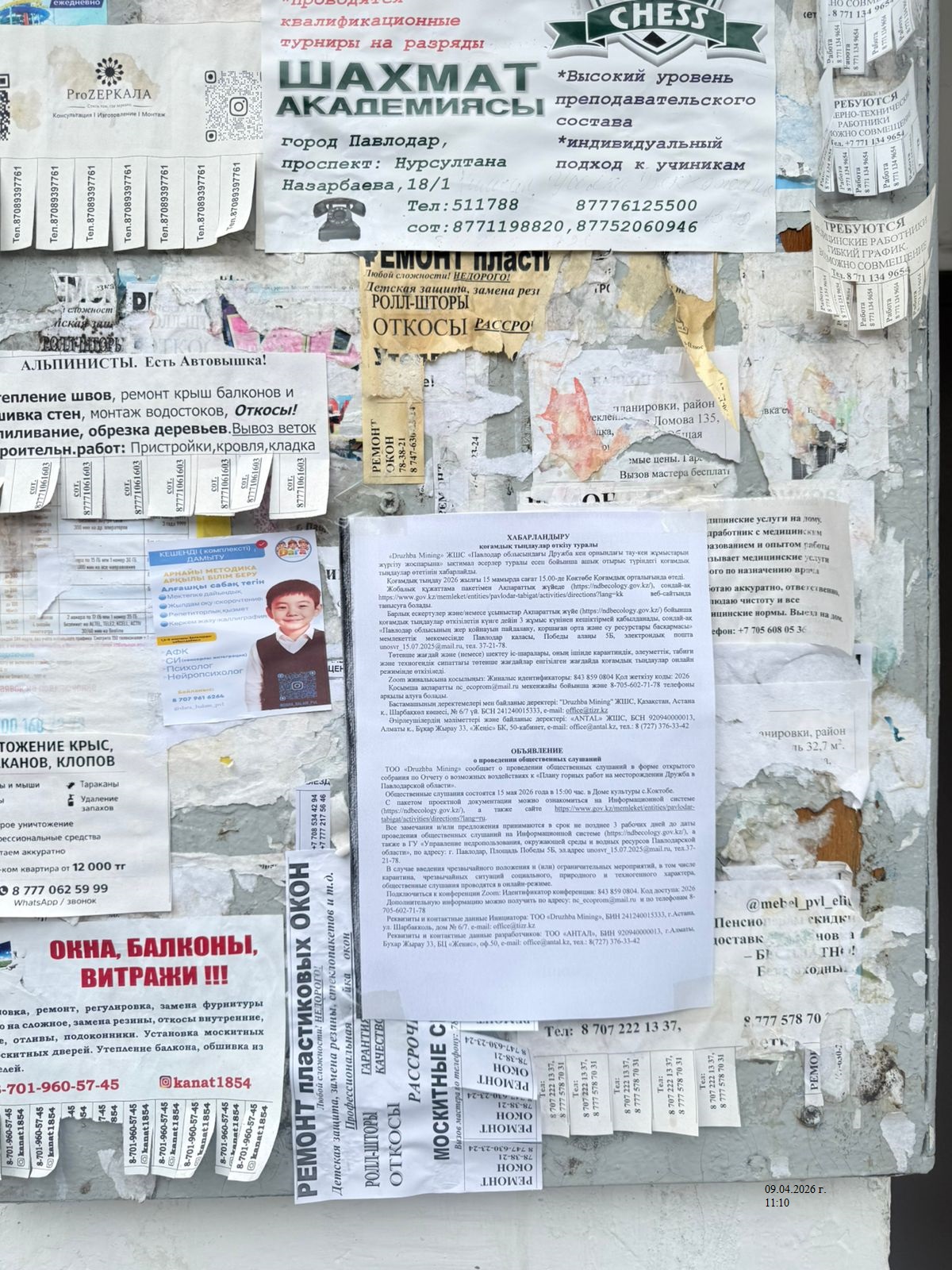 6. Объявление о проведении общественных слушаний на казахском и русском языках будет распространено следующими способами: