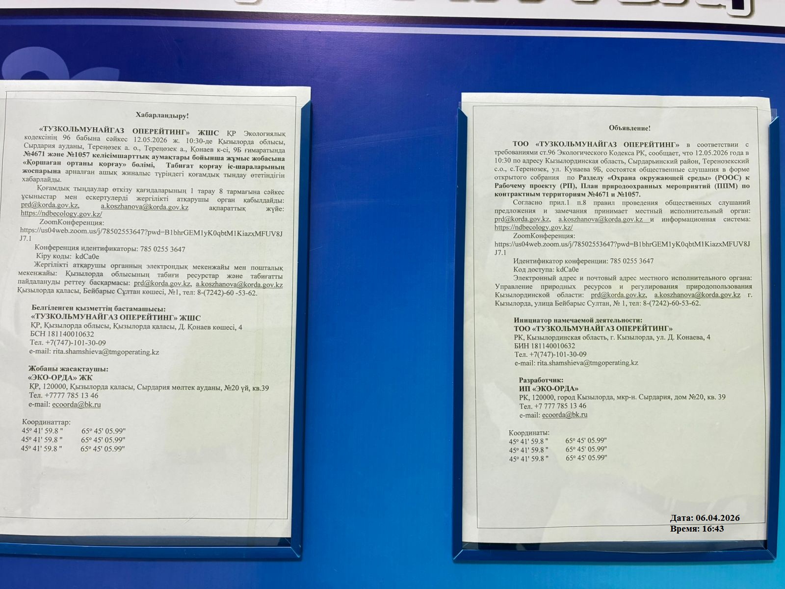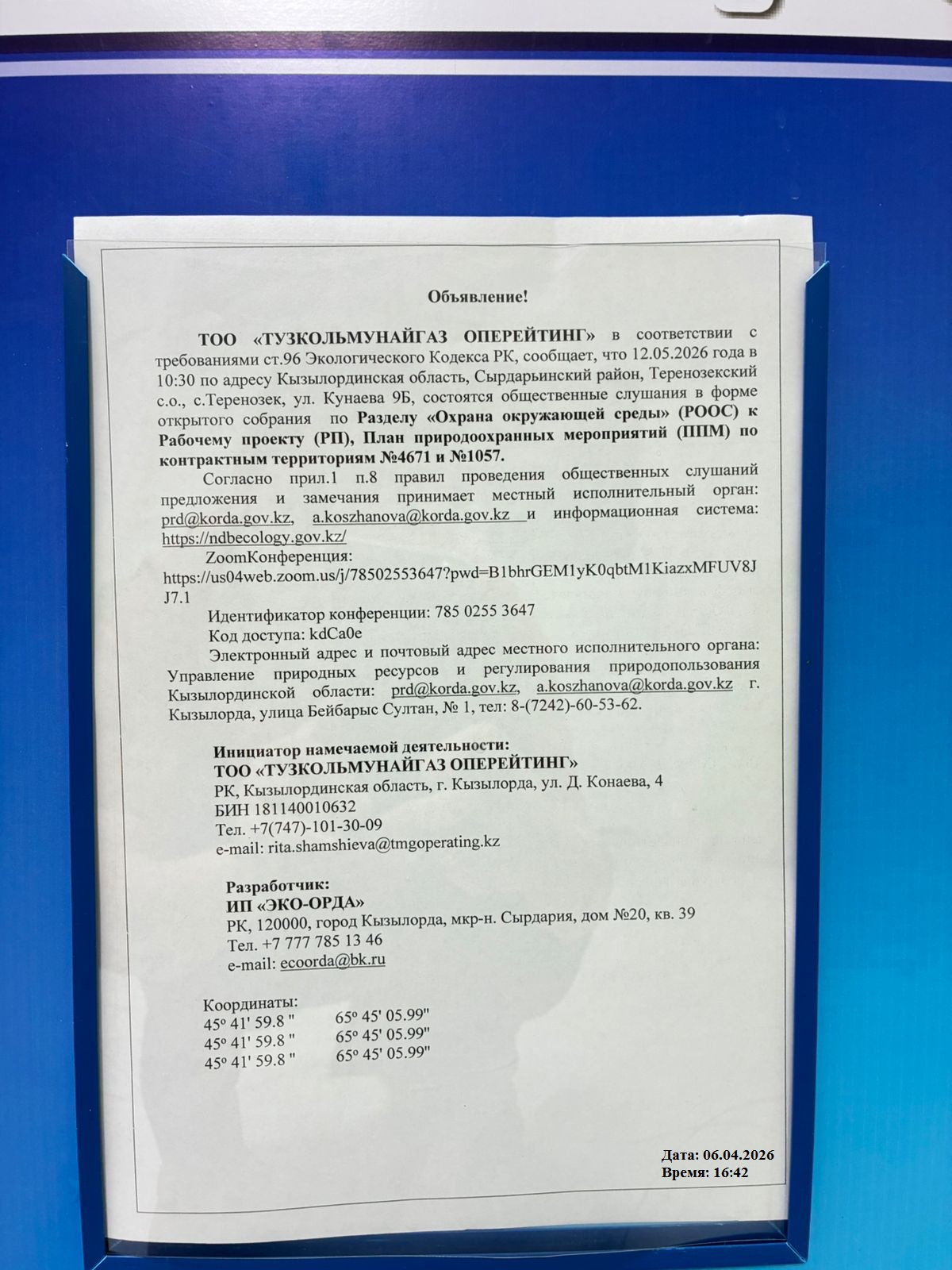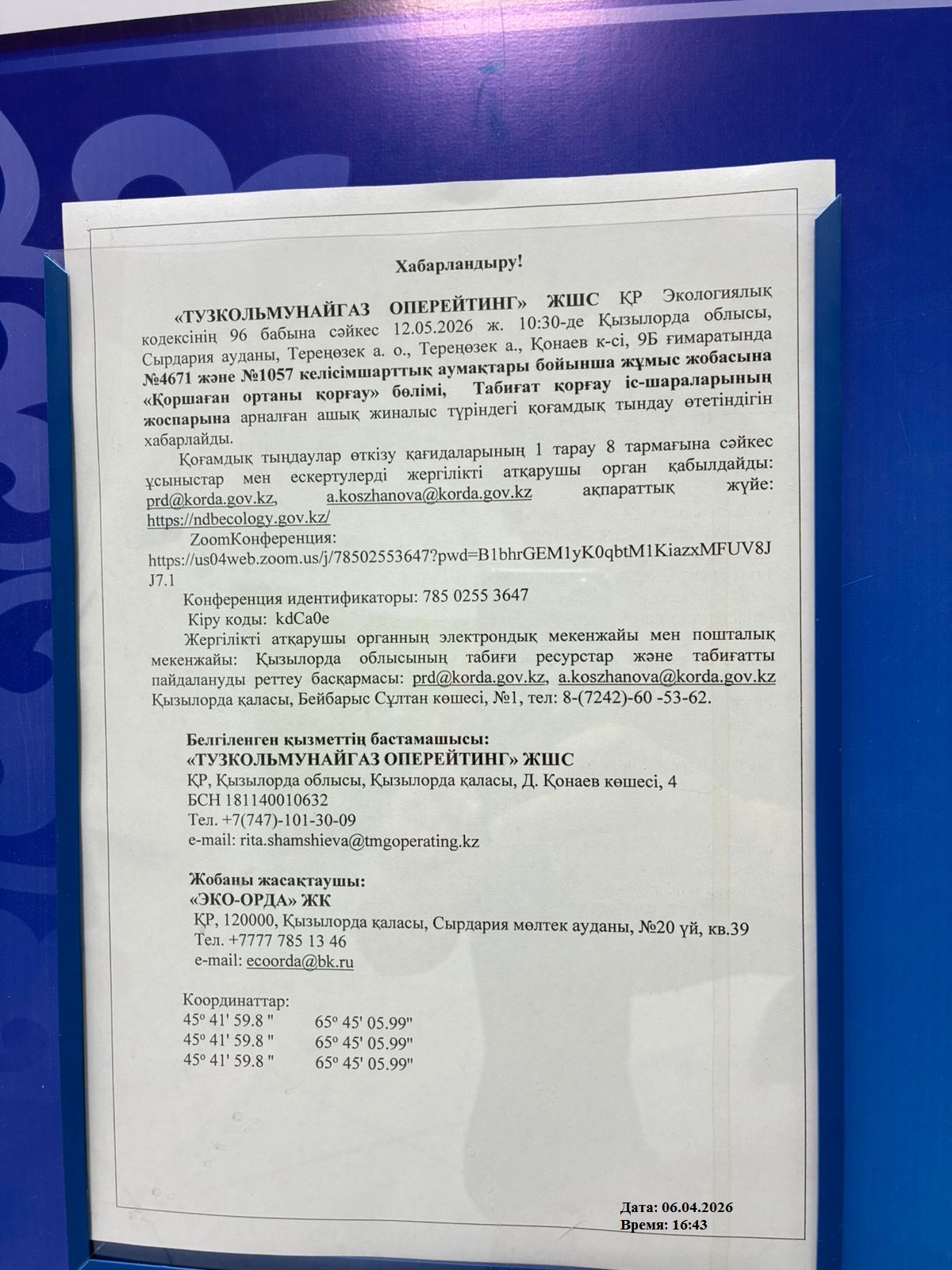 3. Общественные слушания организованны: Управление природных ресурсов и регулирования природопользования Кызылординской области, prd@korda.gov.kz 87242605362, 605369,