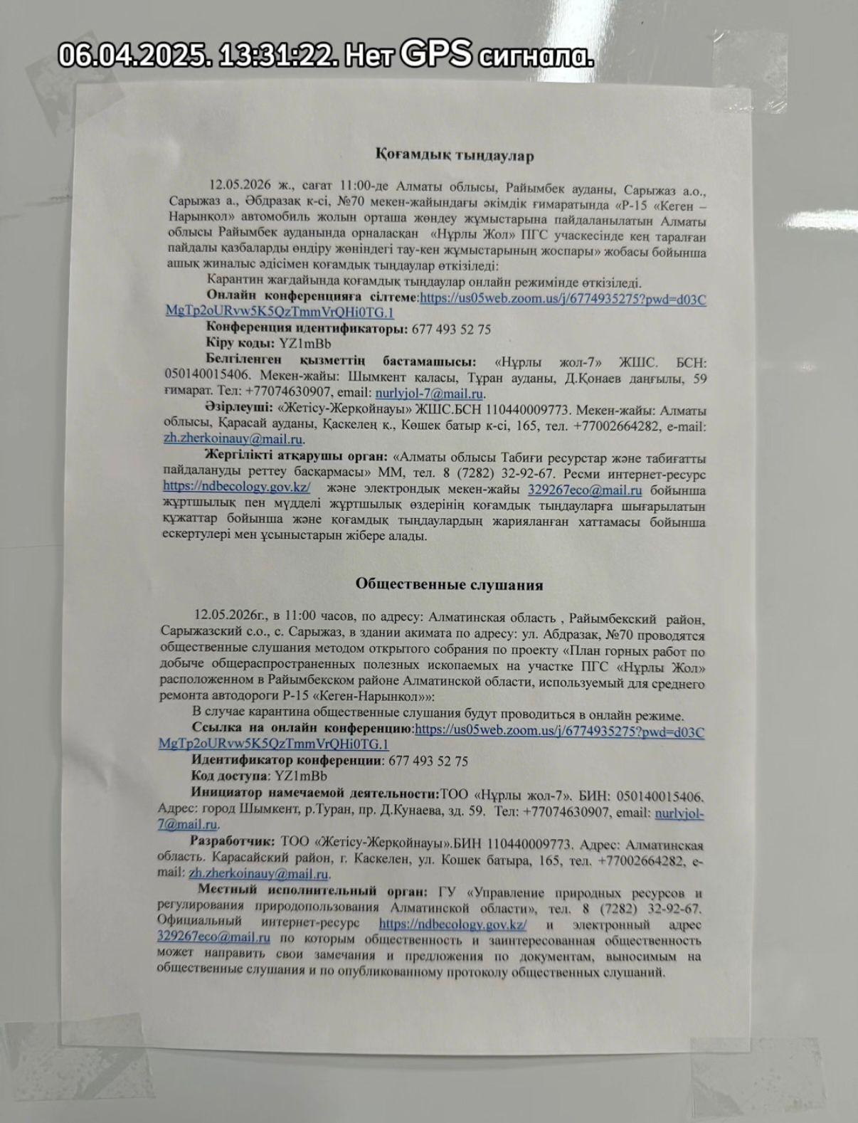 4. Повестка дня общественных слушаний: 12.05.2026 ж., сағат 11:00-де Алматы облысы, Райымбек ауданы, Сарыжаз а.о., Сарыжаз а., Әбдразақ к-сі, №70 мекен-жайындағы әкімдік ғимаратында «Р-15 «Кеген – Нарынқол» автомобиль жолын орташа жөндеу жұмыстарына пайдаланылатын Алматы облысы Райымбек ауданында орналасқан «Нұрлы Жол» ПГС учаскесінде кең таралған пайдалы қазбаларды өндіру жөніндегі тау-кен жұмыстарының жоспары» жобасы бойынша ашық жиналыс әдісімен қоғамдық тыңдаулар өткізіледі: Карантин жағдайында қоғамдық тыңдаулар онлайн режимінде өткізіледі. Онлайн конференцияға сілтеме:https://us05web.zoom.us/j/6774935275?pwd=d03C MgTp2oURvw5K5QzTmmVrQHi0TG.1 Конференция идентификаторы: 677 493 52 75 Кіру коды: YZ1mBb Белгіленген қызметтің бастамашысы: «Нұрлы жол-7» ЖШС. БСН: 050140015406. Мекен-жайы: Шымкент қаласы, Тұран ауданы, Д.Қонаев даңғылы, 59 ғимарат. Тел: +77074630907, email: nurlyjol-7@mail.ru. Әзірлеуші: «Жетісу-Жерқойнауы» ЖШС.БСН 110440009773. Мекен-жайы: Алматы облысы, Қарасай ауданы, Қаскелең қ., Көшек батыр к-сі, 165, тел. +77002664282, e-mail: zh.zherkoinauy@mail.ru. Жергілікті атқарушы орган: «Алматы облысы Табиғи ресурстар және табиғатты пайдалануды реттеу басқармасы» ММ, тел. 8 (7282) 32-92-67. Ресми интернет-ресурс https://ndbecology.gov.kz/ және электрондық мекен-жайы 329267eco@mail.ru бойынша жұртшылық пен мүдделі жұртшылық өздерінің қоғамдық тыңдауларға шығарылатын құжаттар бойынша және қоғамдық тыңдаулардың жарияланған хаттамасы бойынша ескертулері мен ұсыныстарын жібере алады. 12.05.2026г., в 11:00 часов, по адресу: Алматинская область , Райымбекский район, Сарыжазский с.о., с. Сарыжаз, в здании акимата по адресу: ул. Абдразак, №70 проводятся общественные слушания методом открытого собрания по проекту «План горных работ по добыче общераспространенных полезных ископаемых на участке ПГС «Нұрлы Жол» расположенном в Райымбекском районе Алматинской области, используемый для среднего ремонта автодороги Р-15 «Кеген-Нарынкол»»: В случае карантина общественные слушания будут проводиться в онлайн режиме. Ссылка на онлайн конференцию:https://us05web.zoom.us/j/6774935275?pwd=d03C MgTp2oURvw5K5QzTmmVrQHi0TG.1 Идентификатор конференции: 677 493 52 75 Код доступа: YZ1mBb Инициатор намечаемой деятельности:ТОО «Нұрлы жол-7». БИН: 050140015406. Адрес: город Шымкент, р.Туран, пр. Д.Кунаева, зд. 59. Тел: +77074630907, email: nurlyjol-7@mail.ru. Разработчик: ТОО «Жетісу-Жерқойнауы».БИН 110440009773. Адрес: Алматинская область. Карасайский район, г. Каскелен, ул. Кошек батыра, 165, тел. +77002664282, e-mail: zh.zherkoinauy@mail.ru. Местный исполнительный орган: ГУ «Управление природных ресурсов и регулирования природопользования Алматинской области», тел. 8 (7282) 32-92-67. Официальный интернет-ресурс https://ndbecology.gov.kz/ и электронный адрес 329267eco@mail.ru по которым общественность и заинтересованная общественность может направить свои замечания и предложения по документам, выносимым на общественные слушания и по опубликованному протоколу общественных слушаний.