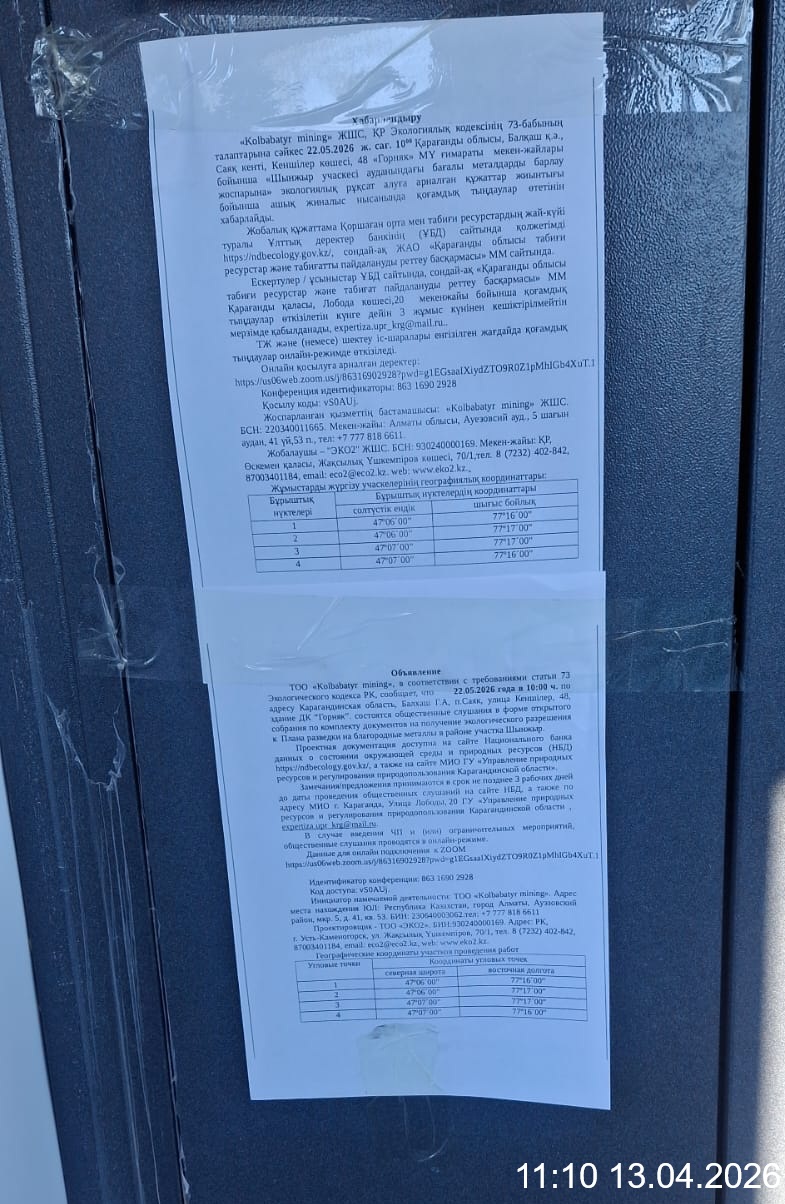 3. Общественные слушания организованны: Управление природных ресурсов и регулирования природопользования Карагандинской области, expertiza.upr_krg@mail.ru,