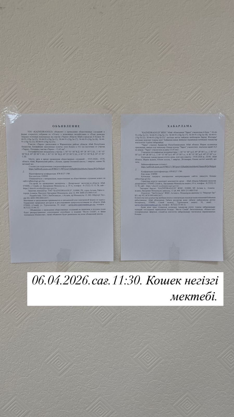 3. Общественные слушания организованны: Главный специалист УПР и ПР область Абай, prirodnyye_resursy_obl.abay@mail.ru,