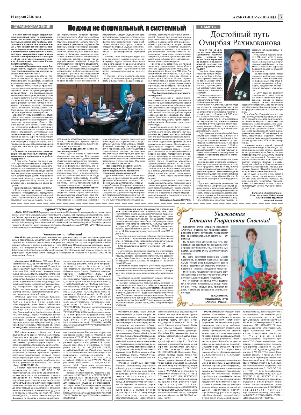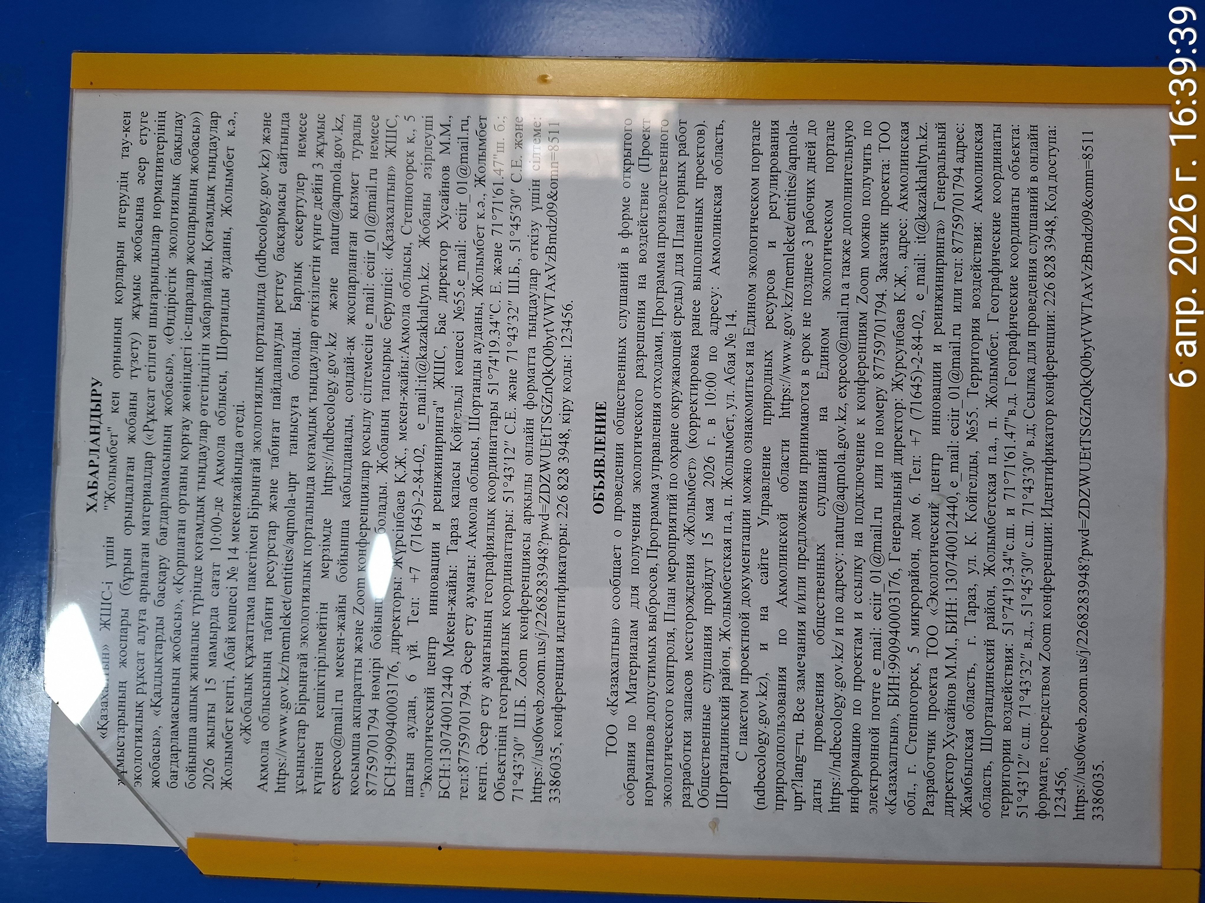 3. Общественные слушания организованны: Управление природных ресурсов и регулирования природопользования Акмолинской области, expeco@mail.ru,
