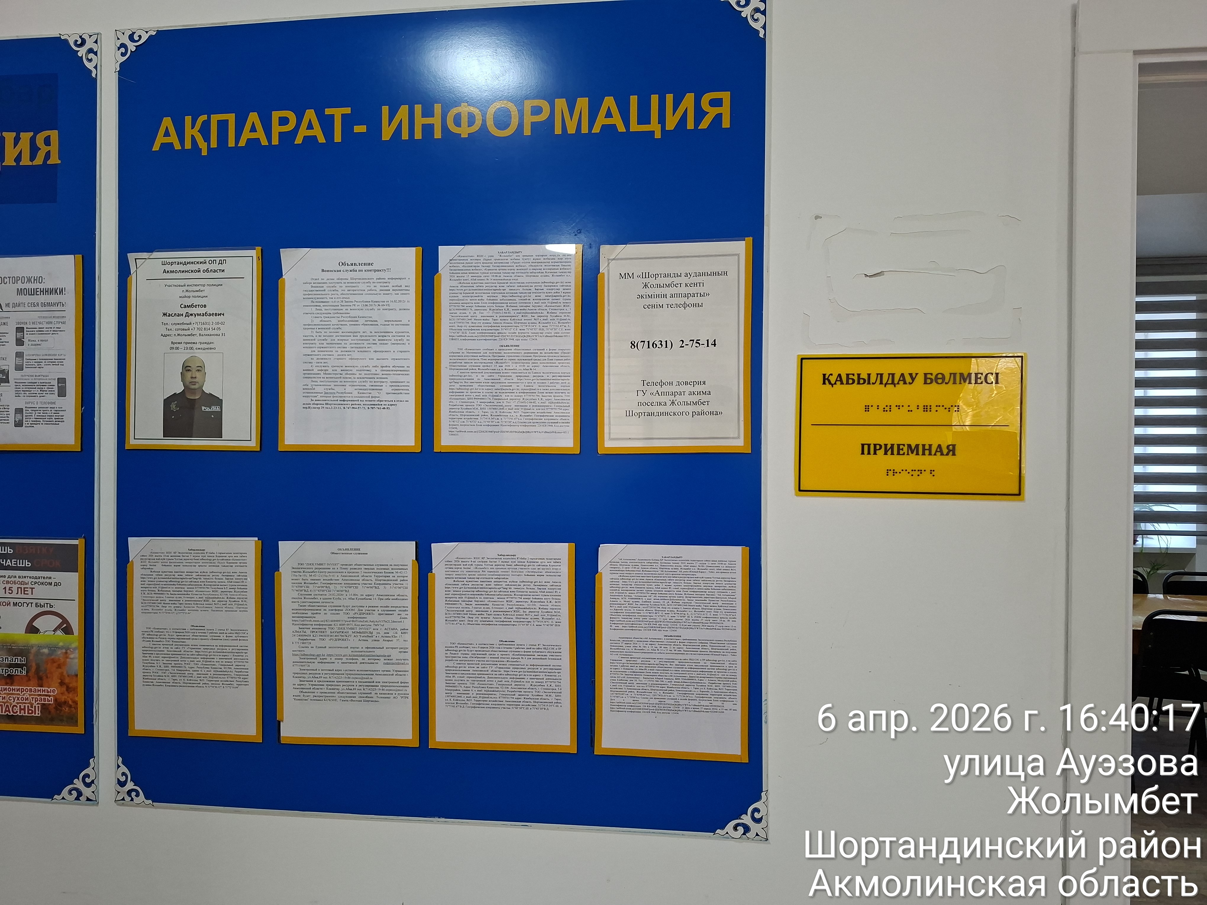 6.3. расположение мест, специально предназначенных для Размещения печатных объявлений (доски объявлений): Доска объявлений Акимата п.Жолымбет