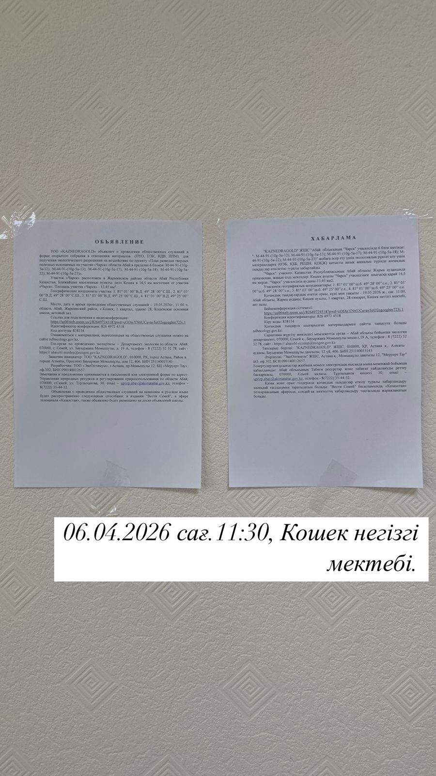 4. Повестка дня общественных слушаний: Проектируемый объект « План разведки твердых полезных ископаемых на участке «Чарск» в области Абай в пределах 6-блоков: M-44-91-(10g-5a-12); M-44-91-(10g-5a-13); M-44-91-(10g-5a-17); M-44-91-(10g-5a-18); M-44-91-(10g-5a-22); M-44-91-(10g-5a-23) Раздел 2 подпункт 2.3. разведка твердых полезных ископаемых с извлечением горной массы и перемещением почвы для целей оценки ресурсов твердых полезных ископаемых; Основные виды работ: 1. Подготовительный период (сбор и систематизация фондовых материалов). 2. Топогеодезические работы: выноска и привязка скважин и выработок, топосъёмка в масштабе 1: 1000–1: 5000 с сечением рельефа через 2 м; по итогам — схема привязки, каталог координат и высот, топосъёмка с отображением всех элементов рельефа и объектов. 3. Геохимические работы: литогеохимическая съёмка (80 %площади, до 1000 проб на глубине 15–20 см) с анализом на золото (пробирный) и 32 элемента (ICP AES). 4. Буровые работы: колонковое бурение (25 скважин по 100-200м, общий объём — 4000 п. м.); начальная плотность сети 400м по простиранию и 300 м вкрест, далее — сгущение до 40–80 м и менее. 5. Горные работы: проходка шурфов при обнаружении минерализации/рудопроявлений, определения валунистости песков и опробования пород. 6. Опробование (общий вес проб — 46,75 т, объём —18,4 м³): керновое, бороздовое, технологические пробы. Опробование проводят после фотографирования и детального геологического и геотехнического документирования. 7. Рекультивация: при проходке шурфов плодородный слой (ПРС) снимают по всей длине канав и складируют в непосредственной близости от места работ — для последующей рекультивации нарушенных земель; площадь рекультивации равна площади нарушенных земель; при ликвидации скважин извлекают обсадные трубы, устья тампонируют глинистым раствором, площадки выравнивают, очищают от мусора и возвращают на место ранее снятый почвенный слой. Общий объём снимаемого ПРС составляет 420 м³: с одной канавы (размеры: 150м × 1,4 м × 0,2 м) — 42м³; с 10 канав — 420 м³. 8. Цель работ — изучить горно геологические условия и вещественный состав пород, выполнить подсчёт запасов по стандартам KazRC. Задачи: выявить мощность торфов и песков, содержание золота (г/м³; изучить вещественный состав и технологические свойства руд и песков для выбора методов обогащения. Участок находится за пределами государственного лесного фонда и ООПТ. По данным АО «Национальная геологическая служба», на участке отсутствуют месторождения подземных вод. По информации Район работ расположен Жарминского района Абайской области. за пределами государственного лесного фонда и ООПТ. Животные из Красной книги РК отсутствуют.Химические, геохимические и иные анализы проб будут выполнены в аккредитованных лабораториях (например, ALS Усть Каменогорск или ALS Караганда) по выбору недропользователя.Проект включает меры по минимизации негативного воздействия на окружающую среду в соответствии с Экологическим кодексом РК. 9. Проект включает меры по минимизации негативного воздействия на окружающую среду в соответствии с Экологическим кодексом РК. Участок «Чарск» в административном отношении площадь геологического отвода находиться на территории Жарминского района Абайской области, ближайшими населёнными пунктами к участку являются село Кошек, расположенная в 14,5 к востоку от границы участка, а также город Чарск. Координаты угловых т