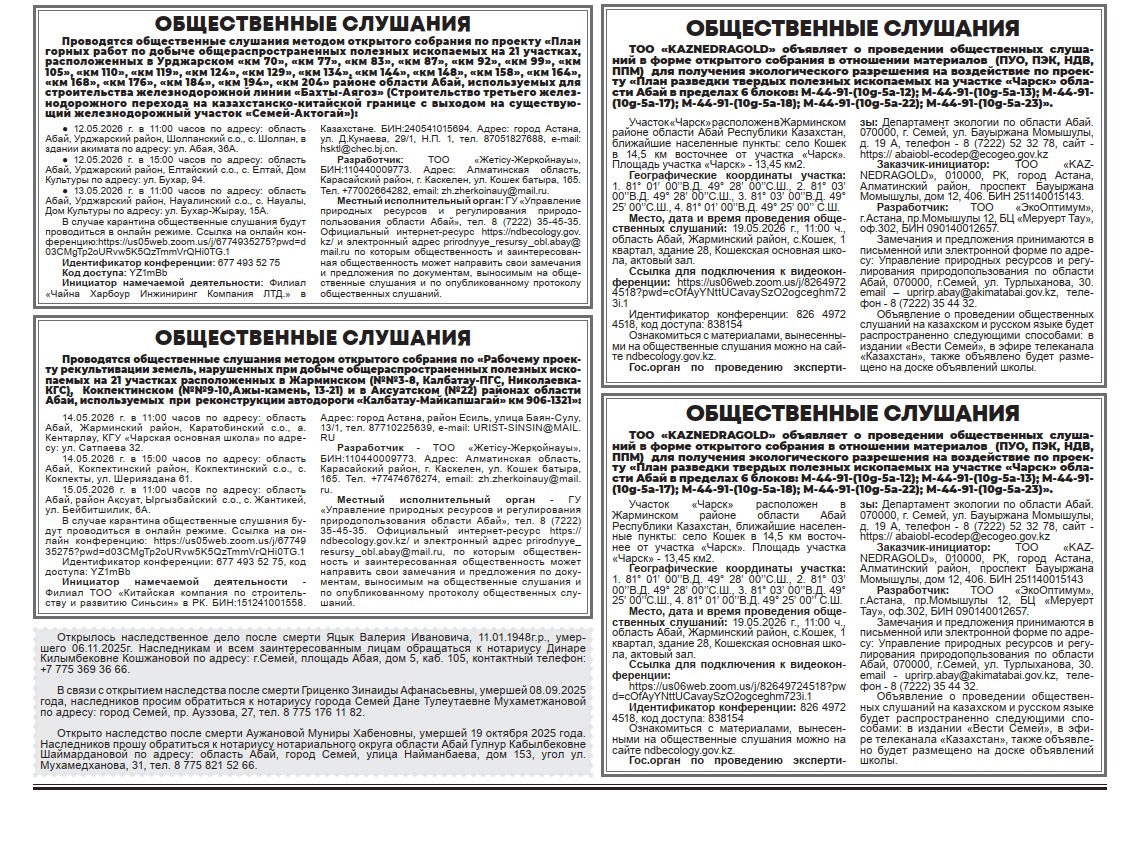 3. Общественные слушания организованны: Главный специалист УПР и ПР область Абай, prirodnyye_resursy_obl.abay@mail.ru,