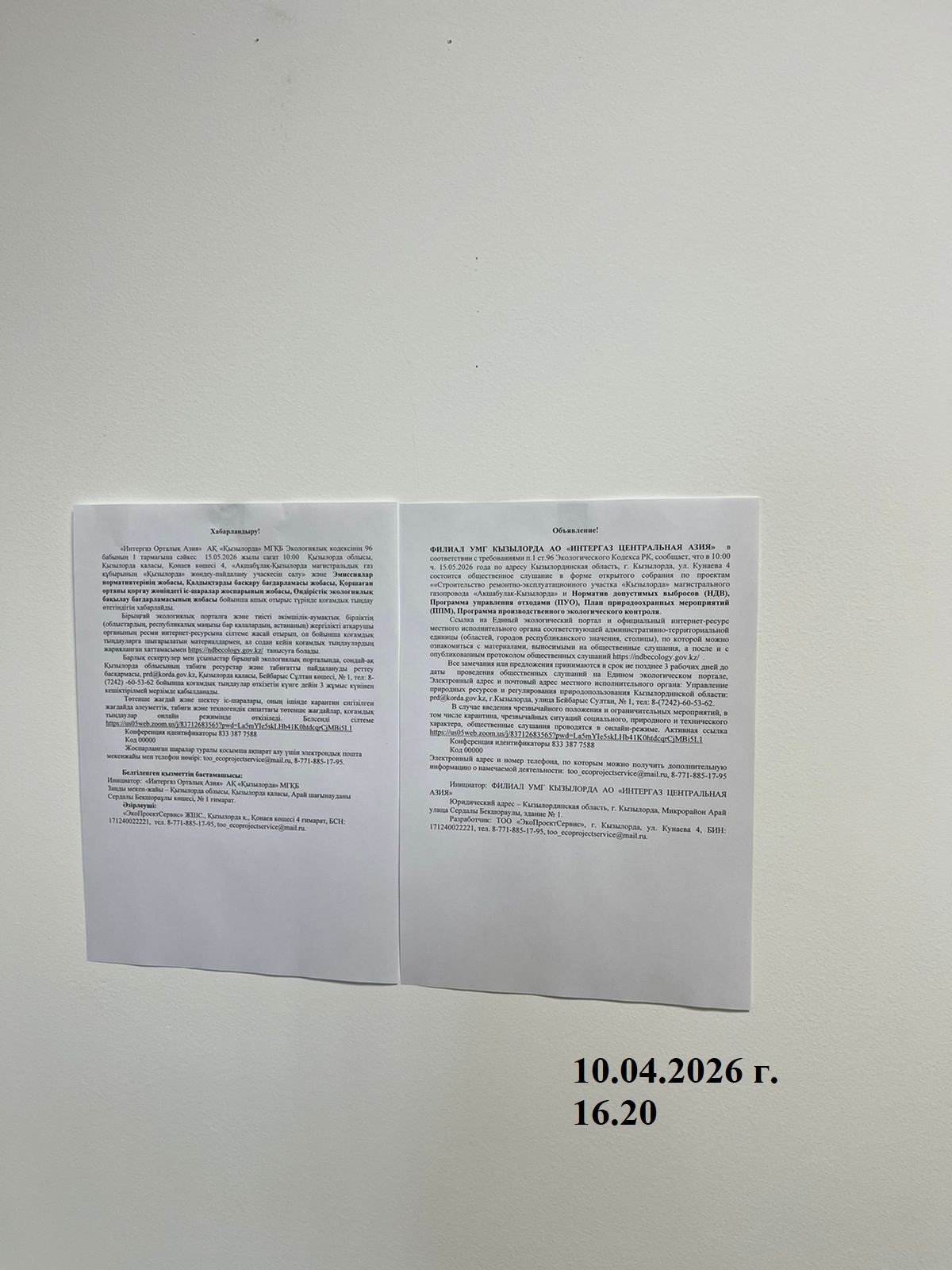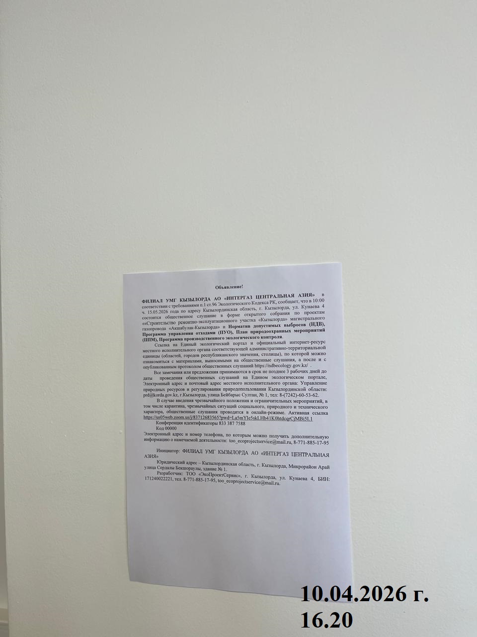 4. Повестка дня общественных слушаний: Хабарландыру! «Интергаз Орталық Азия» АҚ «Қызылорда» МГҚБ Экологиялық кодексінің 96 бабының 1 тармағына сәйкес 15.05.2026 жылы сағат 10:00 Қызылорда облысы, Қызылорда қаласы, Қонаев көшесі 4, «Ақшабұлақ-Қызылорда магистральдық газ құбырының «Қызылорда» жөндеу-пайдалану учаскесін салу» және Эмиссиялар нормативтерінің жобасы, Қалдықтарды басқару бағдарламасы жобасы, Қоршаған ортаны қорғау жөніндегі іс-шаралар жоспарының жобасы, Өндірістік экологиялық бақылау бағдарламасының жобасы бойынша ашық отырыс түрінде қоғамдық тыңдау өтетіндігін хабарлайды. Бірыңғай экологиялық порталға және тиісті әкімшілік-аумақтық бірліктің (облыстардың, республикалық маңызы бар қалалардың, астананың) жергілікті атқарушы органының ресми интернет-ресурсына сілтеме жасай отырып, ол бойынша қоғамдық тыңдауларға шығарылатын материалдармен, ал содан кейін қоғамдық тыңдаулардың жарияланған хаттамасымен https://ndbecology.gov.kz/ танысуға болады. Барлық ескертулер мен ұсыныстар бірыңғай экологиялық порталында, сондай-ақ Қызылорда облысының табиғи ресурстар және табиғатты пайдалануды реттеу басқармасы, prd@korda.gov.kz, Қызылорда қаласы, Бейбарыс Сұлтан көшесі, № 1, тел: 8- (7242) -60-53-62 бойынша қоғамдық тыңдаулар өткізетін күнге дейін 3 жұмыс күнінен кешіктірілмей мерзімде қабылданады. Төтенше жағдай және шектеу іс-шаралары, оның ішінде карантин енгізілген жағдайда әлеуметтік, табиғи және техногендік сипаттағы төтенше жағдайлар, қоғамдық тыңдаулар онлайн режимінде өткізіледі. Белсенді сілтеме https://us05web.zoom.us/j/83712683565?pwd=La5mYIe5skLHb41K0htdcqrCjMBi5I.1 Конференция идентификаторы 833 387 7588 Код 00000 Жоспарланған шаралар туралы қосымша ақпарат алу үшін электрондық пошта мекенжайы мен телефон нөмірі: too_ecoprojectservice@mail.ru, 8-771-885-17-95. Белгіленген қызметтің бастамашысы: Инициатор: «Интергаз Орталық Азия» АҚ «Қызылорда» МГҚБ Заңды мекен-жайы – Қызылорда облысы, Қызылорда қаласы, Арай шағынауданы Сердалы Бекшораұлы көшесі, № 1 ғимарат. Әзірлеуші: «ЭкоПроектСервис» ЖШС., Қызылорда қ., Қонаев көшесі 4 ғимарат, БСН: 171240022221, тел. 8-771-885-17-95, too_ecoprojectservice@mail.ru. Объявление! ФИЛИАЛ УМГ КЫЗЫЛОРДА АО «ИНТЕРГАЗ ЦЕНТРАЛЬНАЯ АЗИЯ» в соответствии с требованиями п.1 ст.96 Экологического Кодекса РК, сообщает, что в 10:00 ч. 15.05.2026 года по адресу Кызылординская область, г. Кызылорда, ул. Кунаева 4 состоится общественное слушание в форме открытого собрания по проектам ««Строительство ремонтно-эксплуатационного участка «Кызылорда» магистрального газопровода «Акшабулак-Кызылорда» и Норматив допустимых выбросов (НДВ), Программа управления отходами (ПУО), План природоохранных мероприятий (ППМ), Программа производственного экологического контроля. Ссылка на Единый экологический портал и официальный интернет-ресурс местного исполнительного органа соответствующей административно-территориальной единицы (областей, городов республиканского значения, столицы), по которой можно ознакомиться с материалами, выносимыми на общественные слушания, а после и с опубликованным протоколом общественных слушаний https://ndbecology.gov.kz/ . Все замечания или предложения принимаются в срок не позднее 3 рабочих дней до даты проведения общественных слушаний на Едином экологическом портале, Электронный адрес и почтовый адрес местного исполнительного органа: Управление природных ресурсов и регулирования природо