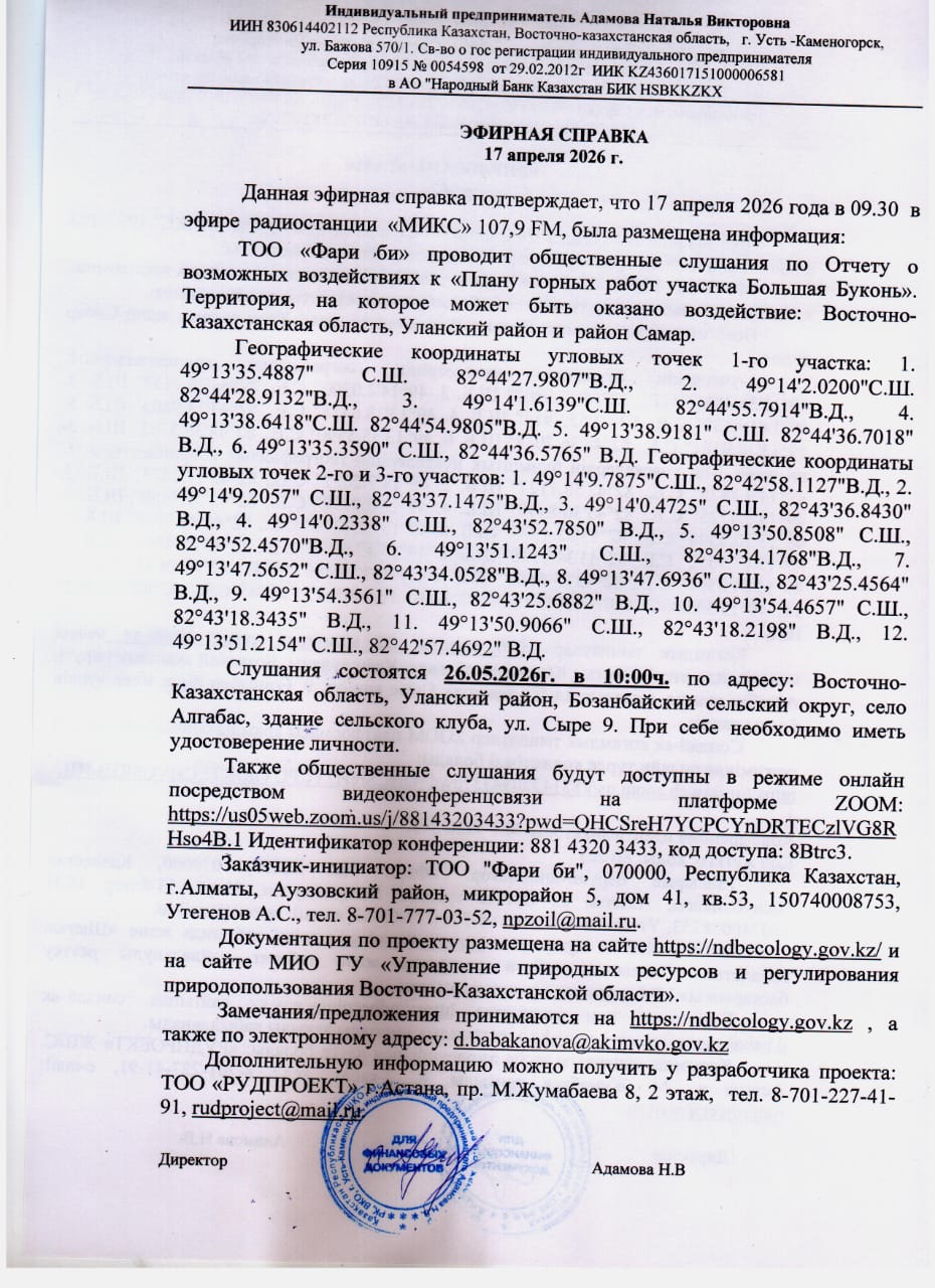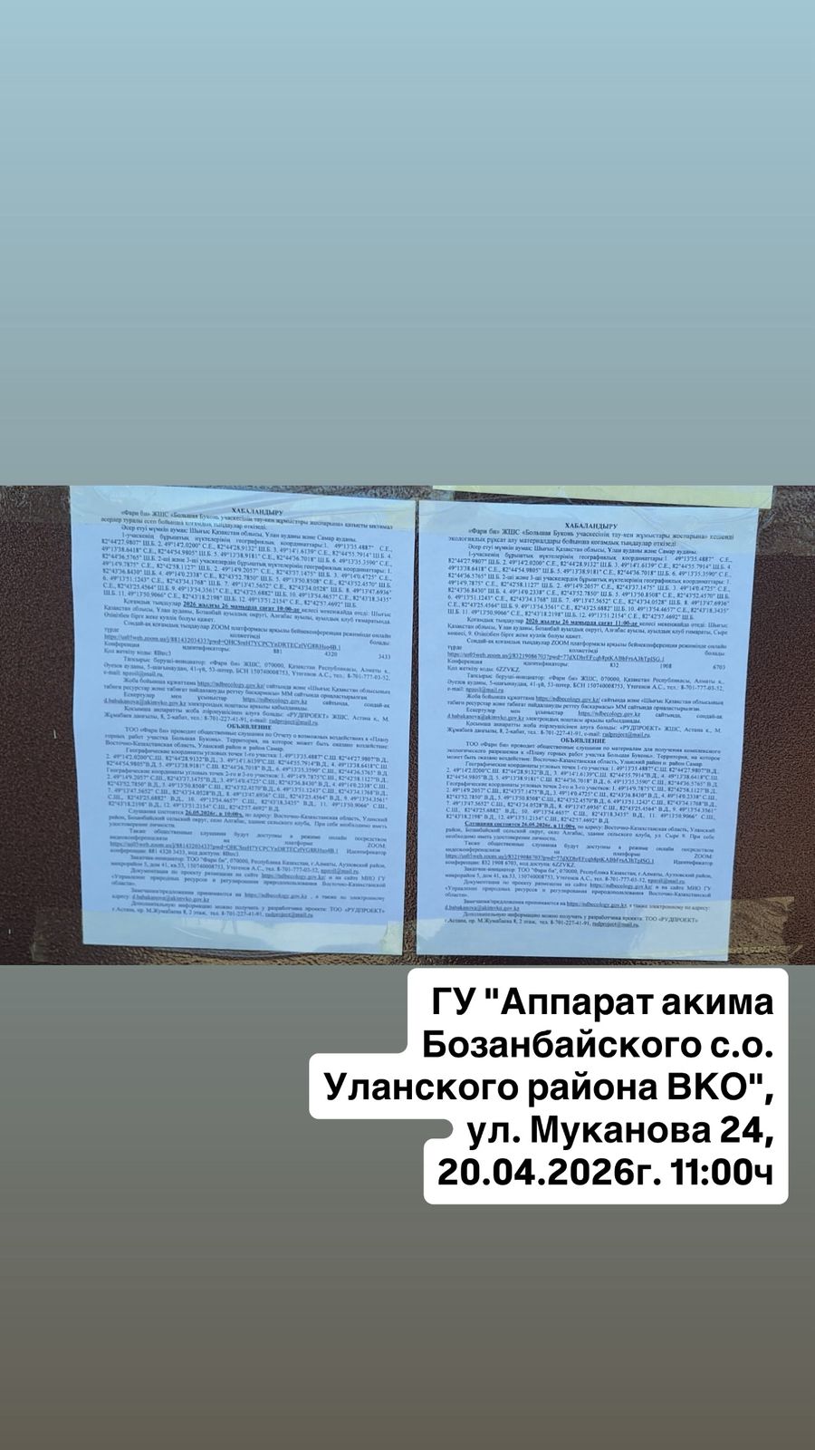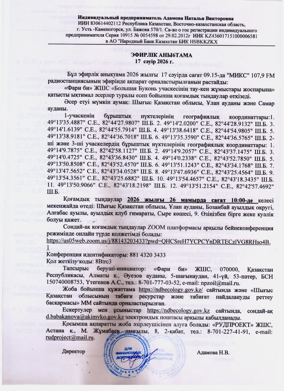 3. Общественные слушания организованны: Управление природных ресурсов и регулирования природопользования Восточно-Казахстанской области, d.babakanova@akimvko.gov.kz,