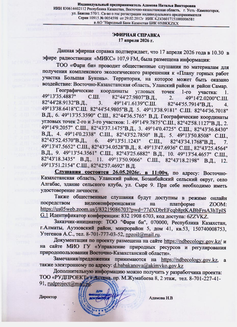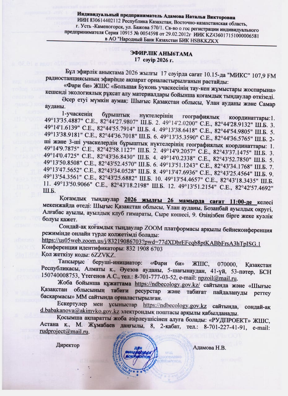 3. Общественные слушания организованны: Управление природных ресурсов и регулирования природопользования Восточно-Казахстанской области, d.babakanova@akimvko.gov.kz,