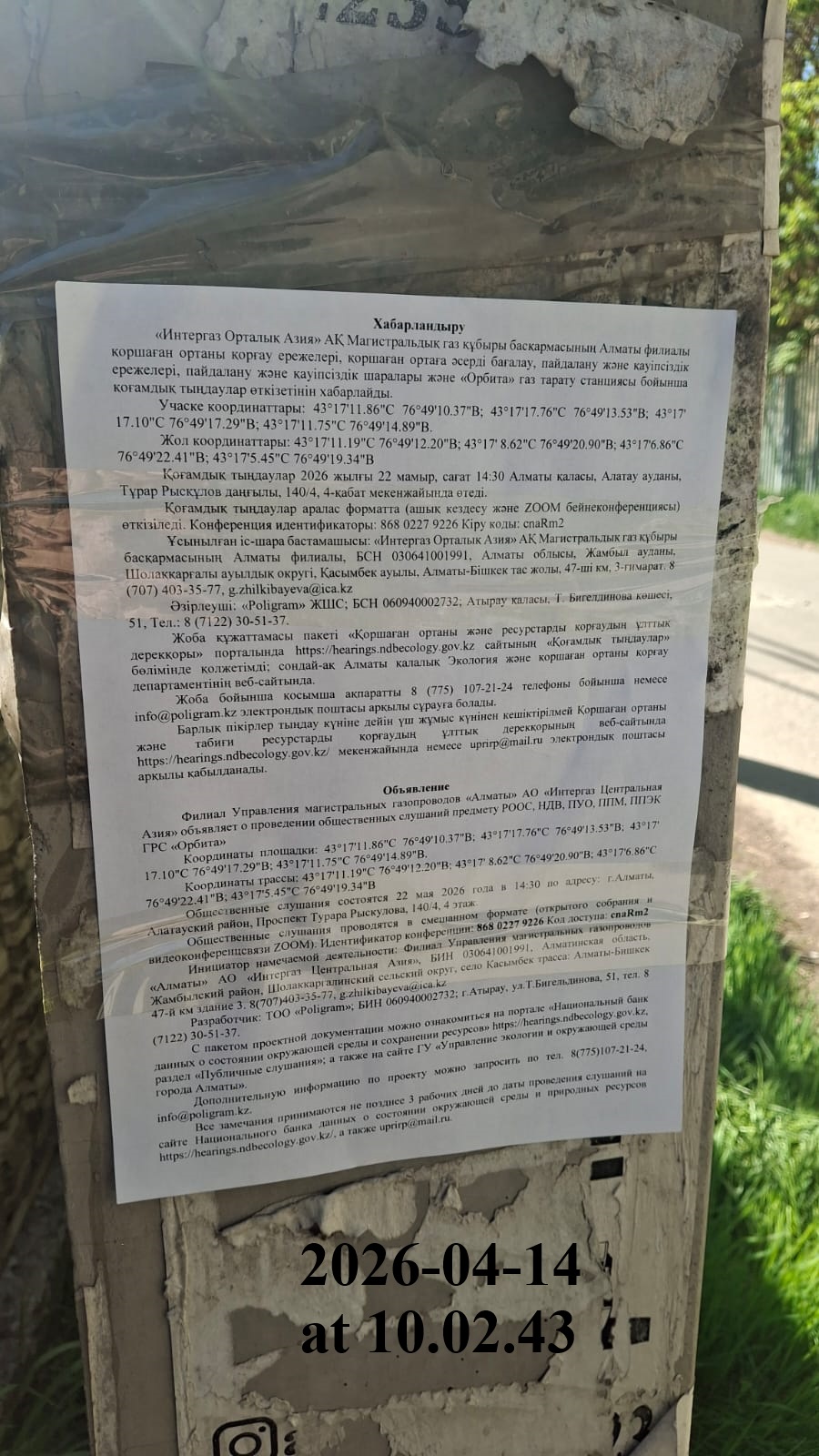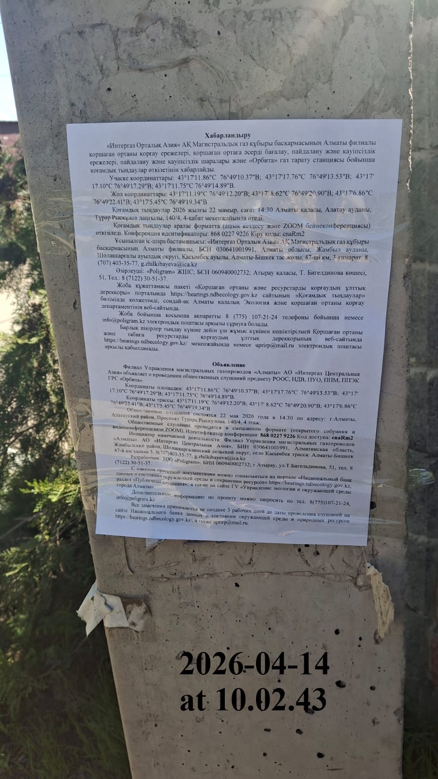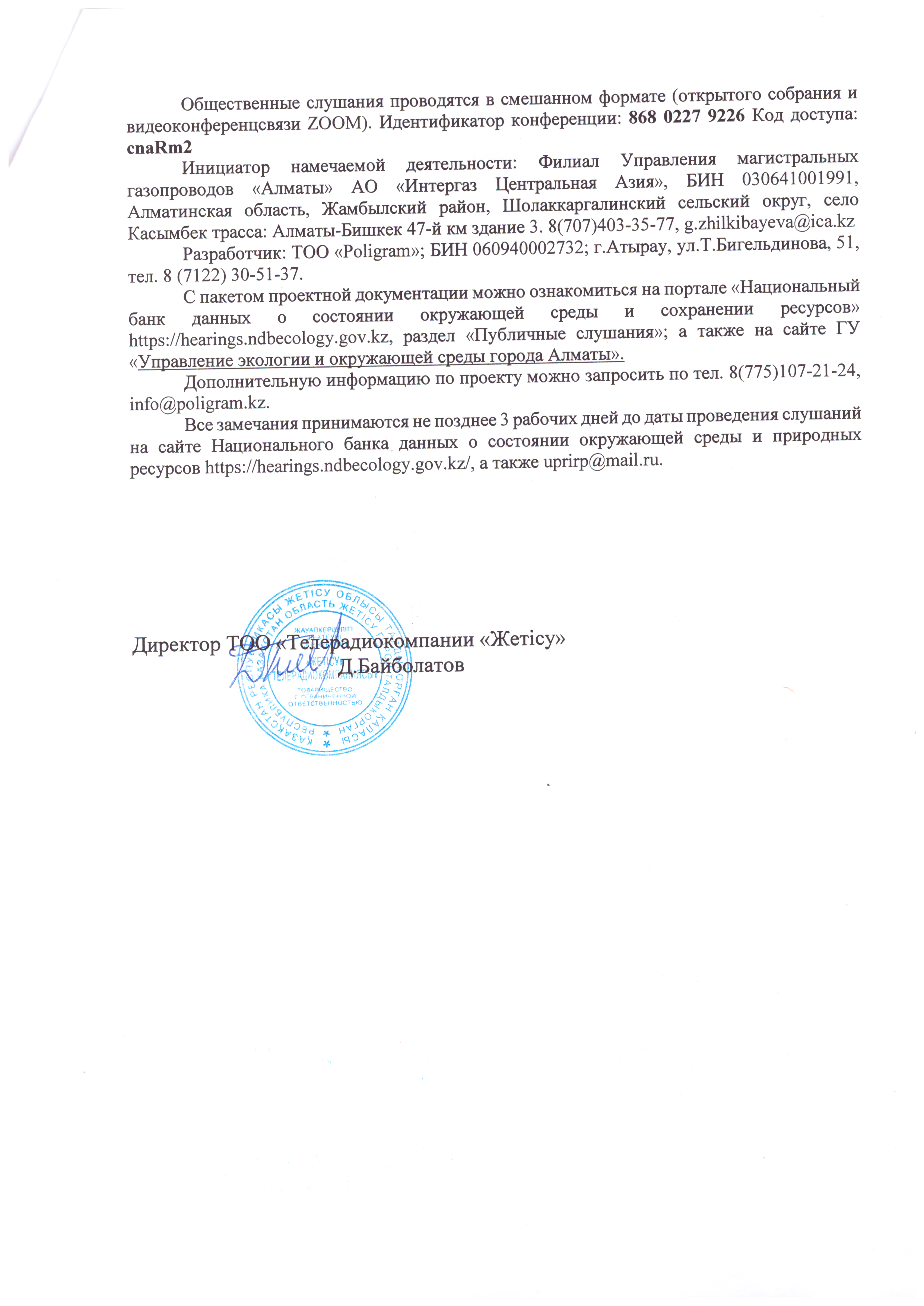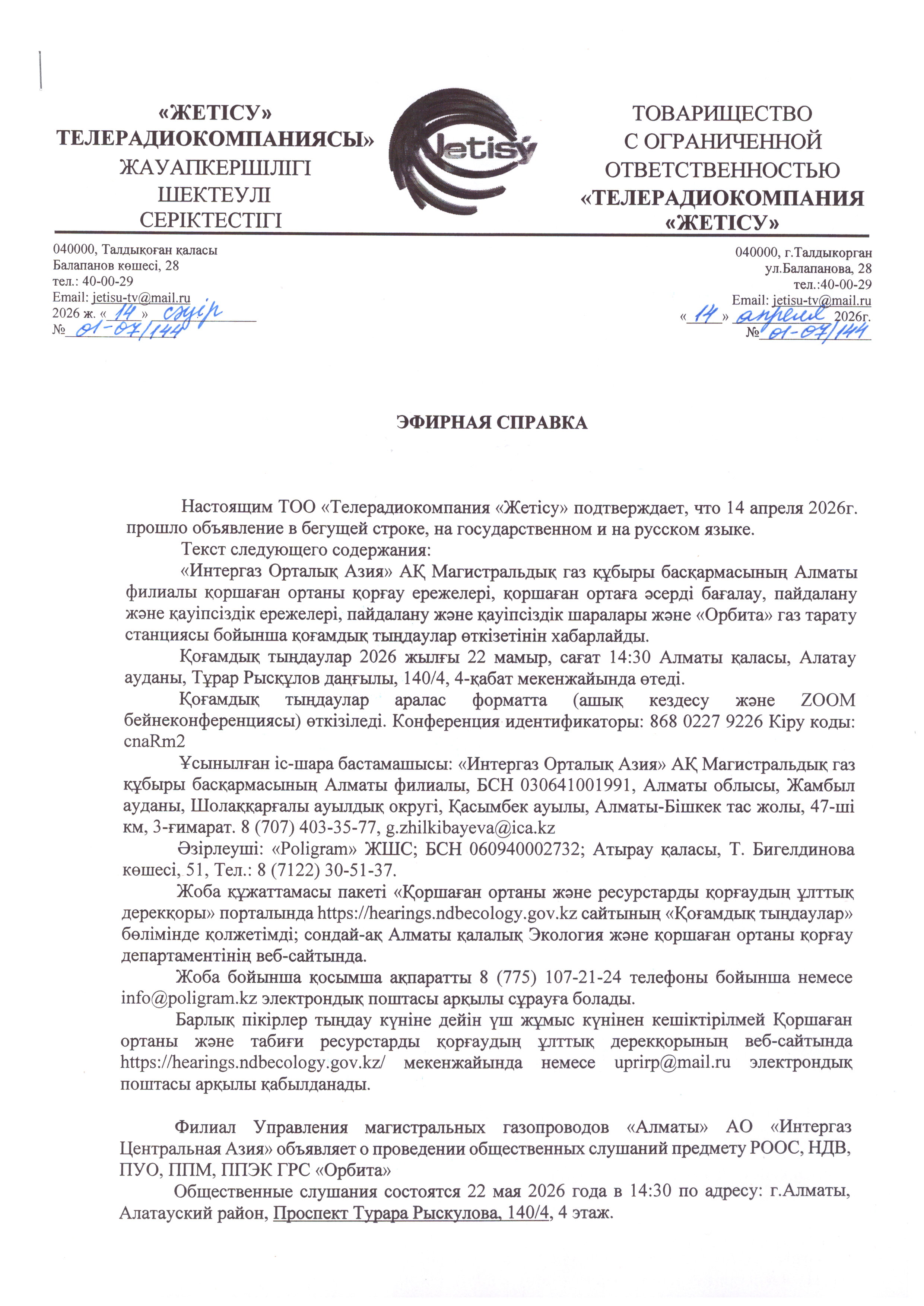 4. Повестка дня общественных слушаний: Хабарландыру «Интергаз Орталық Азия» АҚ Магистральдық газ құбыры басқармасының Алматы филиалы қоршаған ортаны қорғау ережелері, қоршаған ортаға әсерді бағалау, пайдалану және қауіпсіздік ережелері, пайдалану және қауіпсіздік шаралары және «Орбита» газ тарату станциясы бойынша қоғамдық тыңдаулар өткізетінін хабарлайды. Қоғамдық тыңдаулар 2026 жылғы 22 мамыр, сағат 14:30 Алматы қаласы, Алатау ауданы, Тұрар Рысқұлов даңғылы, 140/4, 4-қабат мекенжайында өтеді. Қоғамдық тыңдаулар аралас форматта (ашық кездесу және ZOOM бейнеконференциясы) өткізіледі. Конференция идентификаторы: 814 4487 0725 Кіру коды: 2wsP0e Ұсынылған іс-шара бастамашысы: «Интергаз Орталық Азия» АҚ Магистральдық газ құбыры басқармасының Алматы филиалы, БСН 030641001991, Алматы облысы, Жамбыл ауданы, Шолаққарғалы ауылдық округі, Қасымбек ауылы, Алматы-Бішкек тас жолы, 47-ші км, 3-ғимарат. 8 (707) 403-35-77, g.zhilkibayeva@ica.kz Әзірлеуші: «Poligram» ЖШС; БСН 060940002732; Атырау қаласы, Т. Бигелдинова көшесі, 51, Тел.: 8 (7122) 30-51-37. Жоба құжаттамасы пакеті «Қоршаған ортаны және ресурстарды қорғаудың ұлттық дерекқоры» порталында https://hearings.ndbecology.gov.kz сайтының «Қоғамдық тыңдаулар» бөлімінде қолжетімді; сондай-ақ Алматы қалалық Экология және қоршаған ортаны қорғау департаментінің веб-сайтында. Жоба бойынша қосымша ақпаратты 8 (775) 107-21-24 телефоны бойынша немесе info@poligram.kz электрондық поштасы арқылы сұрауға болады. Барлық пікірлер тыңдау күніне дейін үш жұмыс күнінен кешіктірілмей Қоршаған ортаны және табиғи ресурстарды қорғаудың ұлттық дерекқорының веб-сайтында https://hearings.ndbecology.gov.kz/ мекенжайында немесе uprirp@mail.ru электрондық поштасы арқылы қабылданады. Объявление Филиал Управления магистральных газопроводов «Алматы» АО «Интергаз Центральная Азия» объявляет о проведении общественных слушаний предмету РООС, НДВ, ПУО, ППМ, ППЭК ГРС «Орбита» Общественные слушания состоятся 22 мая 2026 года в 14:30 по адресу: г.Алматы, Алатауский район, Проспект Турара Рыскулова, 140/4, 4 этаж. Общественные слушания проводятся в смешанном формате (открытого собрания и видеоконференцсвязи ZOOM). Идентификатор конференции: 814 4487 0725 Код доступа: 2wsP0e Инициатор намечаемой деятельности: Филиал Управления магистральных газопроводов «Алматы» АО «Интергаз Центральная Азия», БИН 030641001991, Алматинская область, Жамбылский район, Шолаккаргалинский сельский округ, село Касымбек трасса: Алматы-Бишкек 47-й км здание 3. 8(707)403-35-77, g.zhilkibayeva@ica.kz Разработчик: ТОО «Poligram»; БИН 060940002732; г.Атырау, ул.Т.Бигельдинова, 51, тел. 8 (7122) 30-51-37. С пакетом проектной документации можно ознакомиться на портале «Национальный банк данных о состоянии окружающей среды и сохранении ресурсов» https://hearings.ndbecology.gov.kz, раздел «Публичные слушания»; а также на сайте ГУ «Управление экологии и окружающей среды города Алматы». Дополнительную информацию по проекту можно запросить по тел. 8(775)107-21-24, info@poligram.kz. Все замечания принимаются не позднее 3 рабочих дней до даты проведения слушаний на сайте Национального банка данных о состоянии окружающей среды и природных ресурсов https://hearings.ndbecology.gov.kz/, а также uprirp@mail.ru.