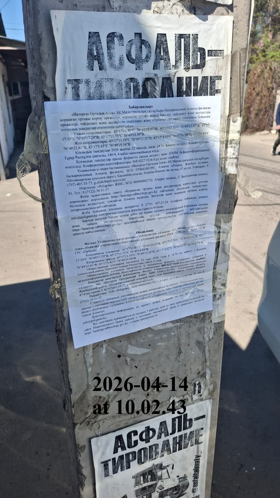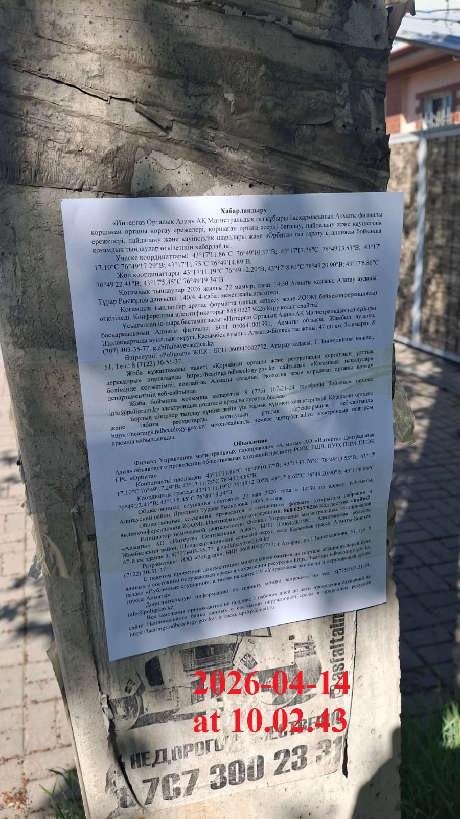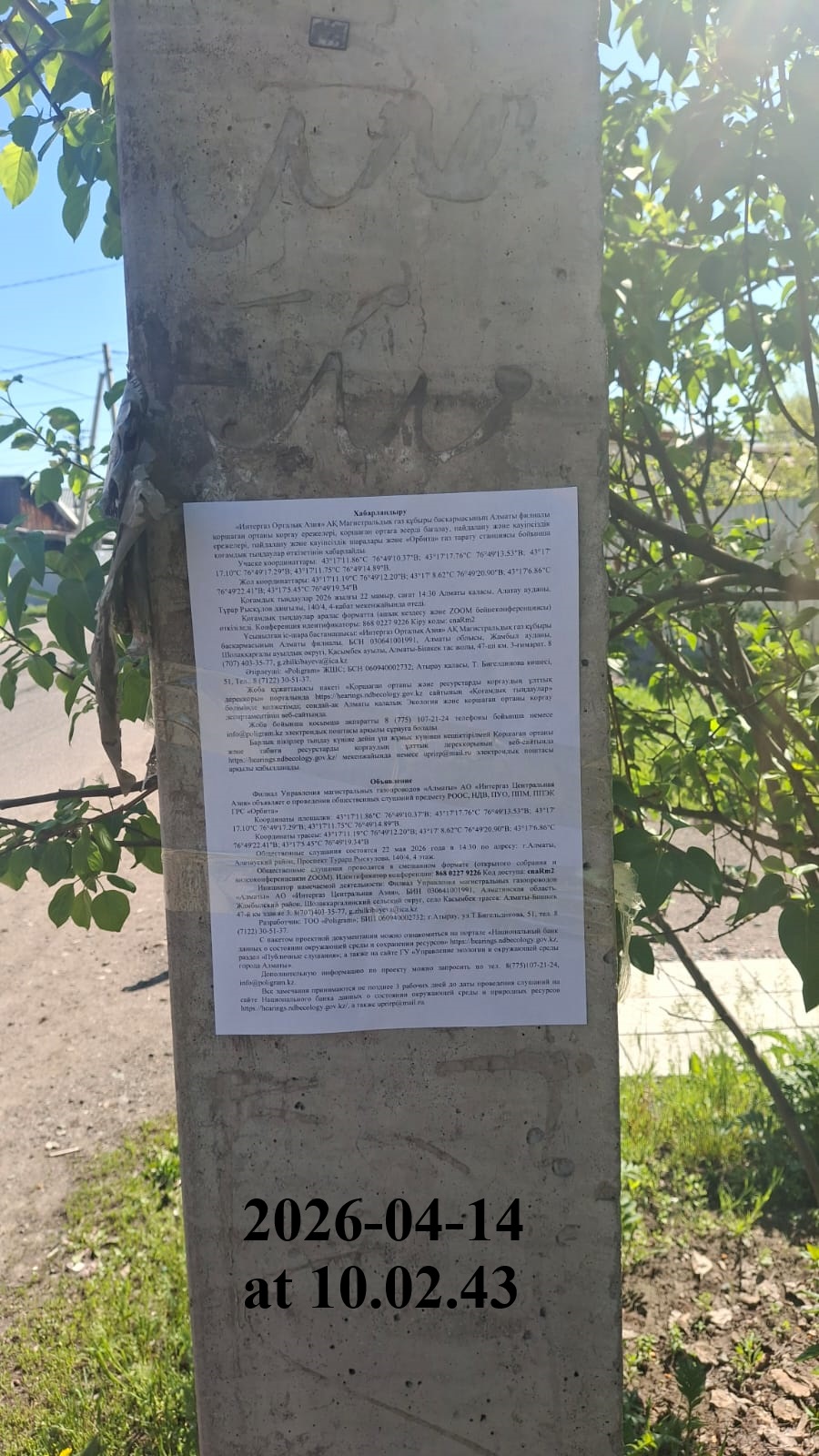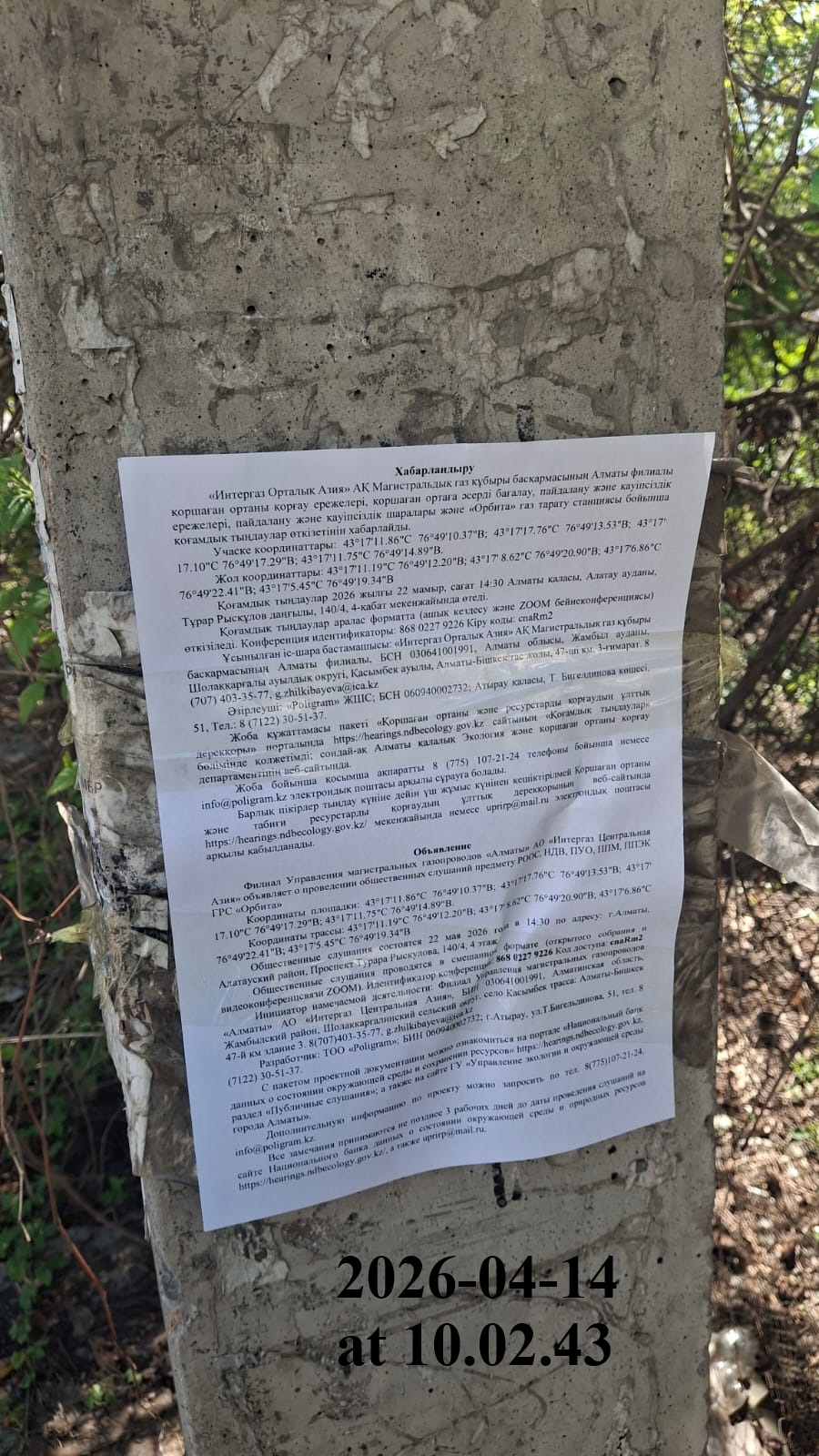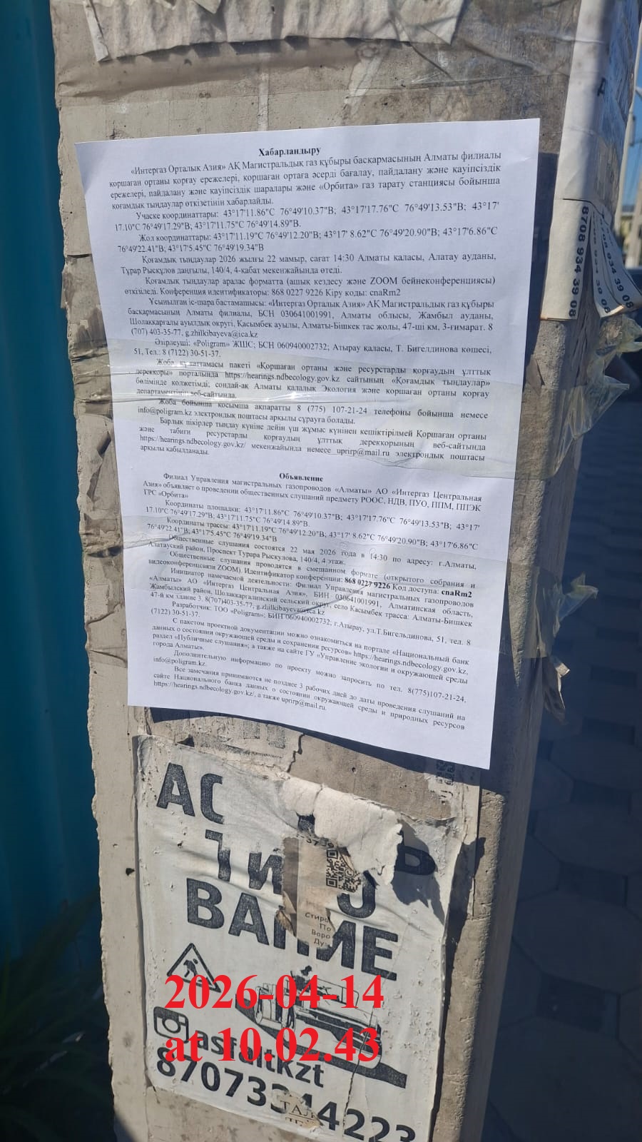 4. Повестка дня общественных слушаний: Хабарландыру «Интергаз Орталық Азия» АҚ Магистральдық газ құбыры басқармасының Алматы филиалы қоршаған ортаны қорғау ережелері, қоршаған ортаға әсерді бағалау, пайдалану және қауіпсіздік ережелері, пайдалану және қауіпсіздік шаралары және «Орбита» газ тарату станциясы бойынша қоғамдық тыңдаулар өткізетінін хабарлайды. Қоғамдық тыңдаулар 2026 жылғы 22 мамыр, сағат 14:30 Алматы қаласы, Алатау ауданы, Тұрар Рысқұлов даңғылы, 140/4, 4-қабат мекенжайында өтеді. Қоғамдық тыңдаулар аралас форматта (ашық кездесу және ZOOM бейнеконференциясы) өткізіледі. Конференция идентификаторы: 814 4487 0725 Кіру коды: 2wsP0e Ұсынылған іс-шара бастамашысы: «Интергаз Орталық Азия» АҚ Магистральдық газ құбыры басқармасының Алматы филиалы, БСН 030641001991, Алматы облысы, Жамбыл ауданы, Шолаққарғалы ауылдық округі, Қасымбек ауылы, Алматы-Бішкек тас жолы, 47-ші км, 3-ғимарат. 8 (707) 403-35-77, g.zhilkibayeva@ica.kz Әзірлеуші: «Poligram» ЖШС; БСН 060940002732; Атырау қаласы, Т. Бигелдинова көшесі, 51, Тел.: 8 (7122) 30-51-37. Жоба құжаттамасы пакеті «Қоршаған ортаны және ресурстарды қорғаудың ұлттық дерекқоры» порталында https://hearings.ndbecology.gov.kz сайтының «Қоғамдық тыңдаулар» бөлімінде қолжетімді; сондай-ақ Алматы қалалық Экология және қоршаған ортаны қорғау департаментінің веб-сайтында. Жоба бойынша қосымша ақпаратты 8 (775) 107-21-24 телефоны бойынша немесе info@poligram.kz электрондық поштасы арқылы сұрауға болады. Барлық пікірлер тыңдау күніне дейін үш жұмыс күнінен кешіктірілмей Қоршаған ортаны және табиғи ресурстарды қорғаудың ұлттық дерекқорының веб-сайтында https://hearings.ndbecology.gov.kz/ мекенжайында немесе uprirp@mail.ru электрондық поштасы арқылы қабылданады. Объявление Филиал Управления магистральных газопроводов «Алматы» АО «Интергаз Центральная Азия» объявляет о проведении общественных слушаний предмету РООС, НДВ, ПУО, ППМ, ППЭК ГРС «Орбита» Общественные слушания состоятся 22 мая 2026 года в 14:30 по адресу: г.Алматы, Алатауский район, Проспект Турара Рыскулова, 140/4, 4 этаж. Общественные слушания проводятся в смешанном формате (открытого собрания и видеоконференцсвязи ZOOM). Идентификатор конференции: 814 4487 0725 Код доступа: 2wsP0e Инициатор намечаемой деятельности: Филиал Управления магистральных газопроводов «Алматы» АО «Интергаз Центральная Азия», БИН 030641001991, Алматинская область, Жамбылский район, Шолаккаргалинский сельский округ, село Касымбек трасса: Алматы-Бишкек 47-й км здание 3. 8(707)403-35-77, g.zhilkibayeva@ica.kz Разработчик: ТОО «Poligram»; БИН 060940002732; г.Атырау, ул.Т.Бигельдинова, 51, тел. 8 (7122) 30-51-37. С пакетом проектной документации можно ознакомиться на портале «Национальный банк данных о состоянии окружающей среды и сохранении ресурсов» https://hearings.ndbecology.gov.kz, раздел «Публичные слушания»; а также на сайте ГУ «Управление экологии и окружающей среды города Алматы». Дополнительную информацию по проекту можно запросить по тел. 8(775)107-21-24, info@poligram.kz. Все замечания принимаются не позднее 3 рабочих дней до даты проведения слушаний на сайте Национального банка данных о состоянии окружающей среды и природных ресурсов https://hearings.ndbecology.gov.kz/, а также uprirp@mail.ru.