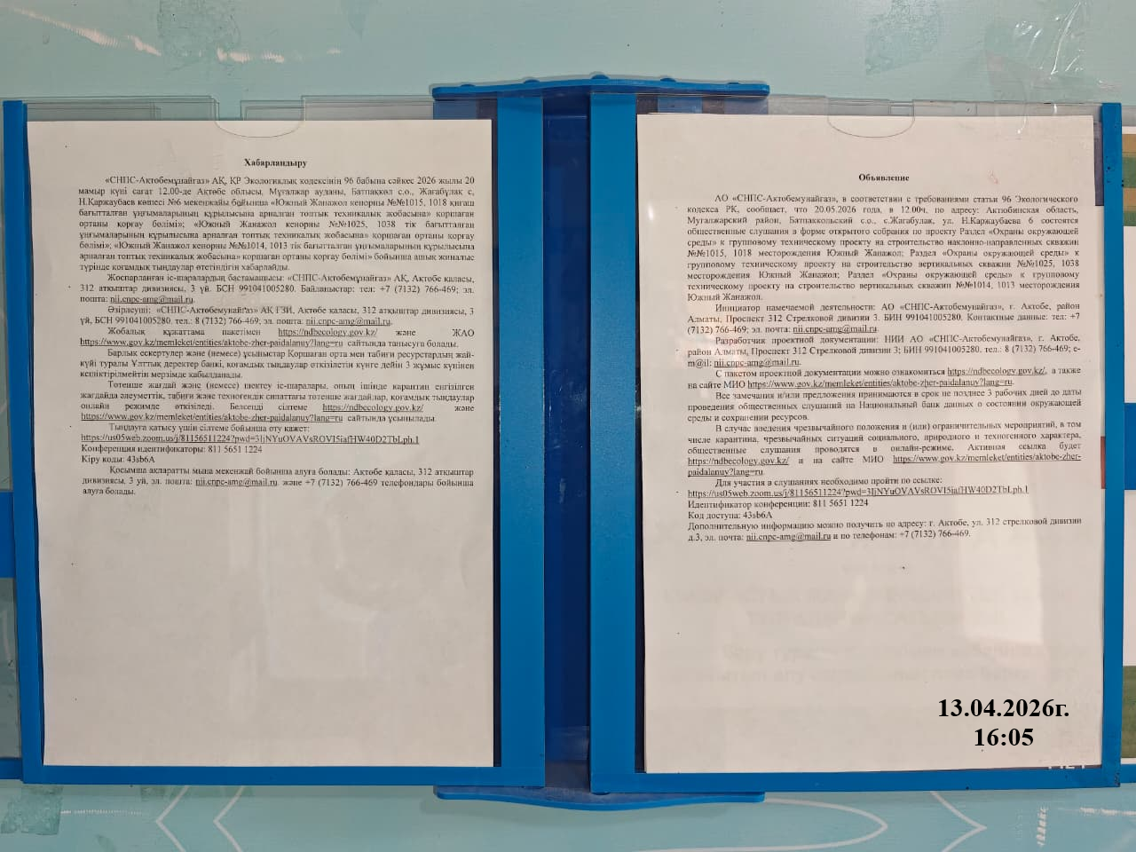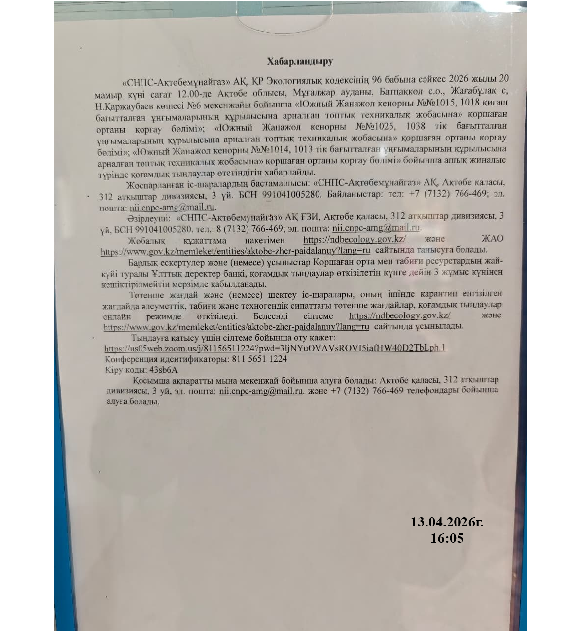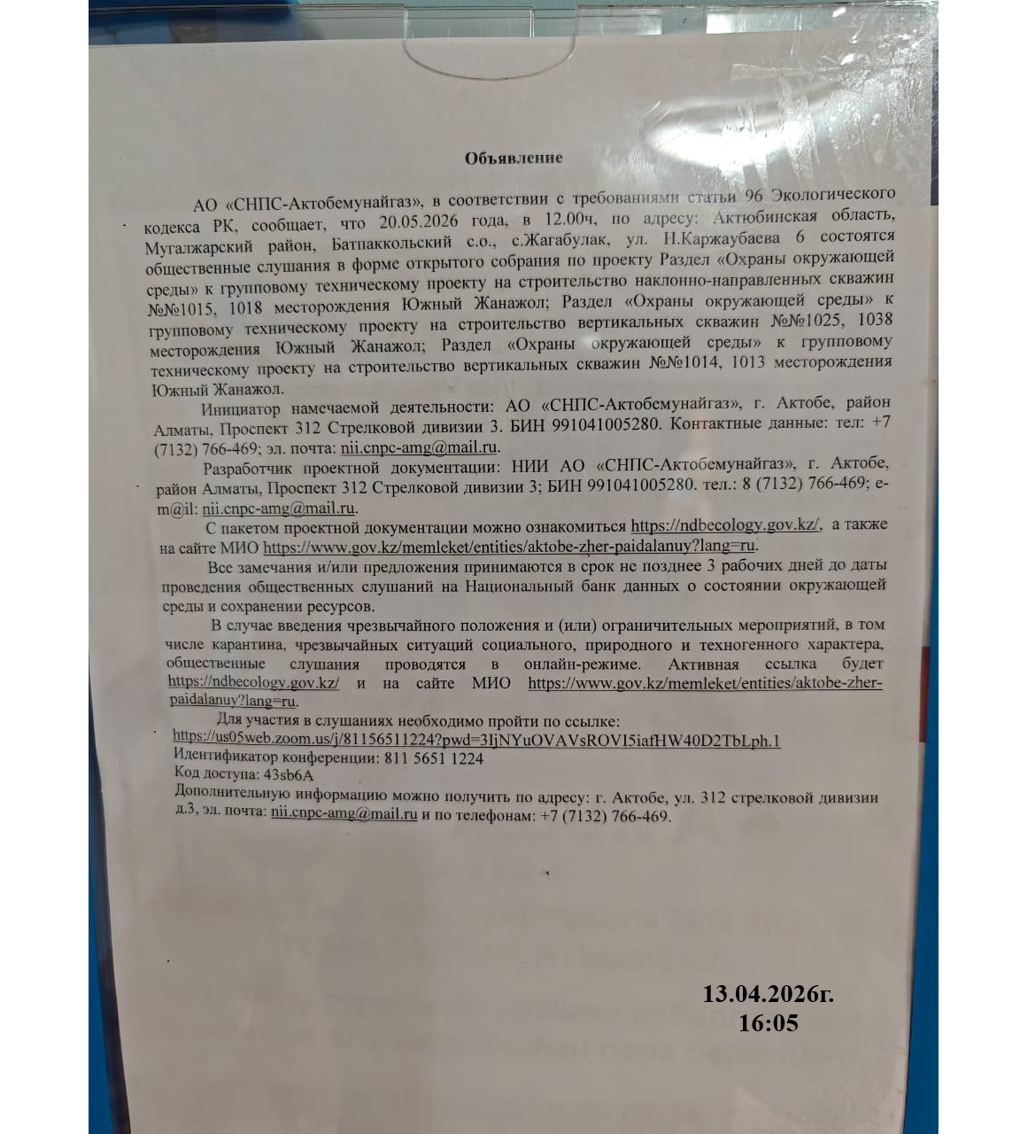 4. Повестка дня общественных слушаний: Месторождение Южный Жанажол расположено на территории Актюбинской области в Мугалжарском районе. В 2025 году выполнен «Пересчет запасов нефти, свободного и растворенного газа, конденсата и попутных компонентов месторождения Жанажол Актюбиской области Республики Казахстан» 2025г. и утвержден ГКЗ РК (протокол №2766-25-У от 30.09.2025г). На базе данного пересчета запасов был выполнен «Проект разработки месторождения Жанажол» по состоянию на 01.01.2025г в соответствии с Договором №2123Р от 21.08.2023г., ТОО «Timal Consulting Group». В рамках проекта представлены и утверждены технологические показатели разработки месторождения. На основании данного «Проекта Разработки» на месторождение Южный Жанажол планируется бурение эксплуатационных скважин. Непосредственной целью выполнения Раздела является определение характера и степени опасности всех потенциальных видов воздействия после реализации проекта. В процессе намечаемой деятельности появляются временные источники выбросов, которые прекращают свою деятельность по завершению процесса. Вовремя бурения проводятся исследовательские работы в разных интервалах: отбор шлама, геофизические исследования скважины, инклинометрия, каротаж по контролю за качеством цементирования скважины и другие работы. После бурения планируется передача скважин в эксплуатацию. Весь объем работ по бурению скважины планируется выполнить в период до конца 2027 г. Подключиться к конференции Zoom: https://us05web.zoom.us/j/81156511224?pwd=3IjNYuOVAVsROVI5iafHW40D2TbLph.1 Идентификатор конференции: 811 5651 1224 Код доступа: 43sb6A