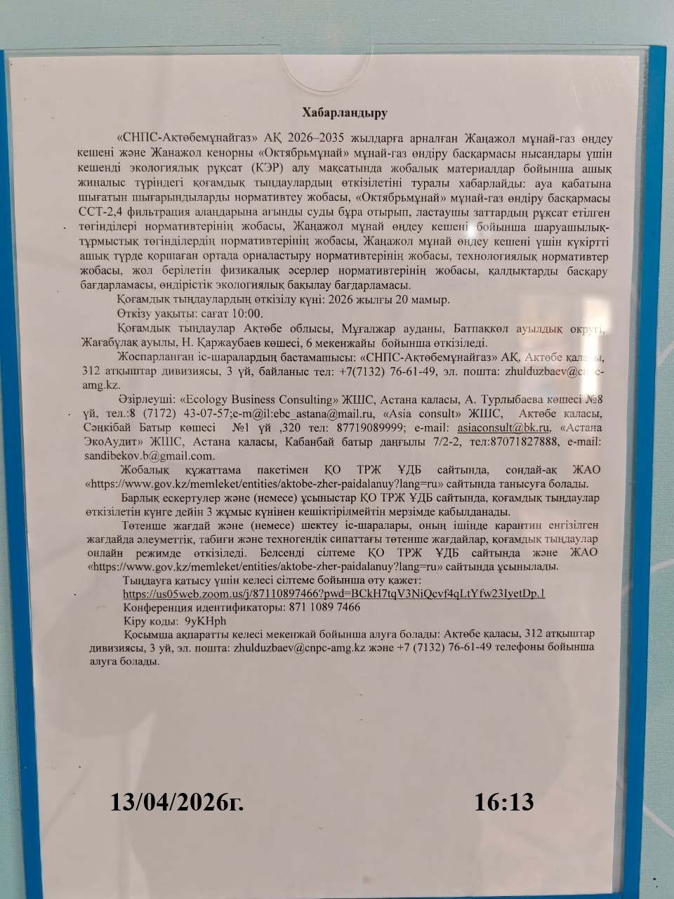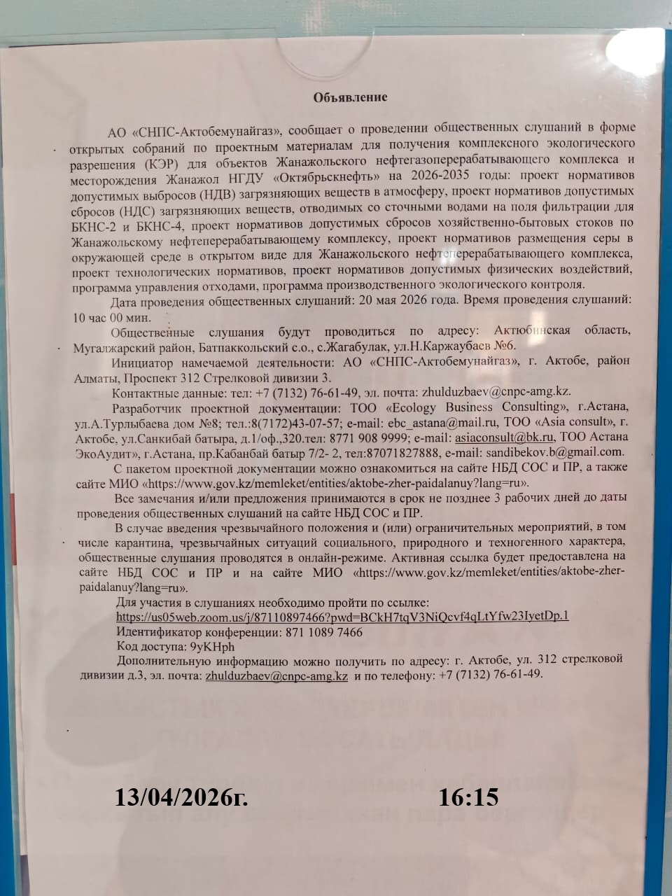 4. Повестка дня общественных слушаний: Работа выполнена для получения комплексного экологического разрешения (КЭР) в соответствии со ст.111 Экологическим Кодексом Республики Казахстан от 2 января 2021 года № 400-VI ЗРК . Проектная документация разработана для объектов Жанажольского нефтегазоперерабатывающего комплекса и месторождения Жанажол НГДУ «Октябрьскнефть» АО «СНПС-Актобемунайгаз» на 2026-2035 годы: проект нормативов допустимых выбросов (НДВ) загрязняющих веществ в атмосферу, проект нормативов допустимых сбросов (НДС) загрязняющих веществ, отводимых со сточными водами на поля фильтрации для БКНС-2 и БКНС-4, проект нормативов допустимых сбросов хозяйственно-бытовых стоков по Жанажольскому нефтеперерабатывающему комплексу, проект нормативов размещения серы в окружающей среде в открытом виде для Жанажольского нефтеперерабатывающего комплекса, проект технологических нормативов, проект нормативов допустимых физических воздействий, программа управления отходами, программа производственного экологического контроля. Ссылка на онлайн подключение: https://us05web.zoom.us/j/87110897466?pwd=BCkH7tqV3NiQcvf4qLtYfw23IyetDp.1 Идентификатор конференции: 871 1089 7466 Код доступа: 9yKHph