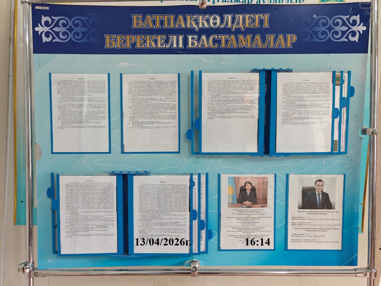 6.3. расположение мест, специально предназначенных для Размещения печатных объявлений (доски объявлений): доска объявлений Акимат Батпаккольского с.о, ул. Н. Каржаубаева 7
