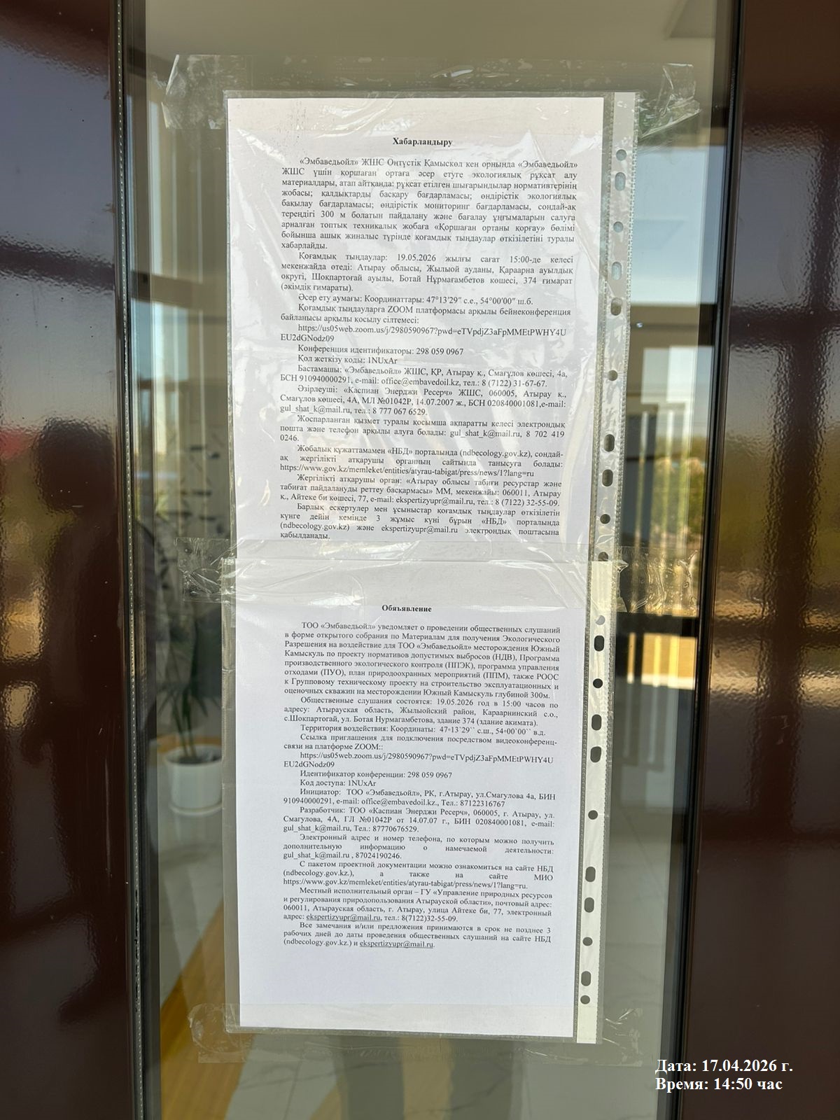 3. Общественные слушания организованны: Управление природных ресурсов и регулирования природопользования Атырауской области, ekspertizyupr@mail.ru,