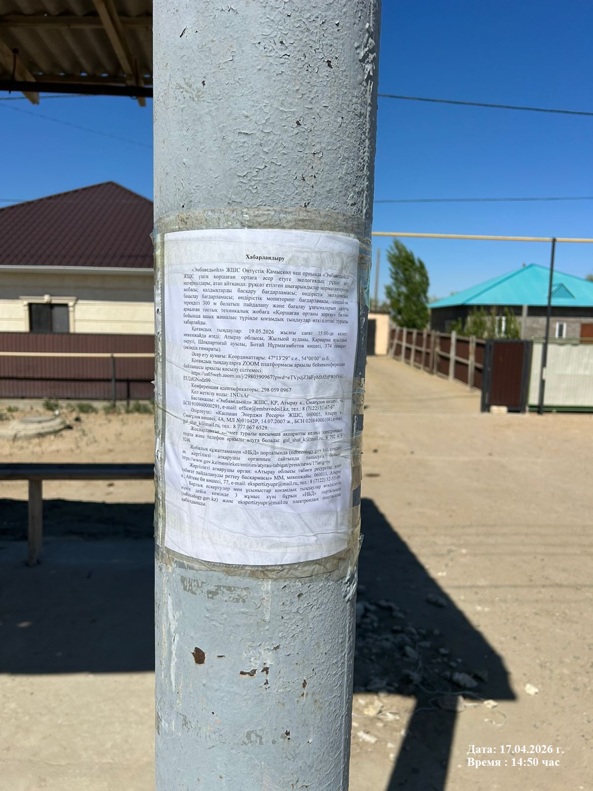 6. Объявление о проведении общественных слушаний на казахском и русском языках будет распространено следующими способами: