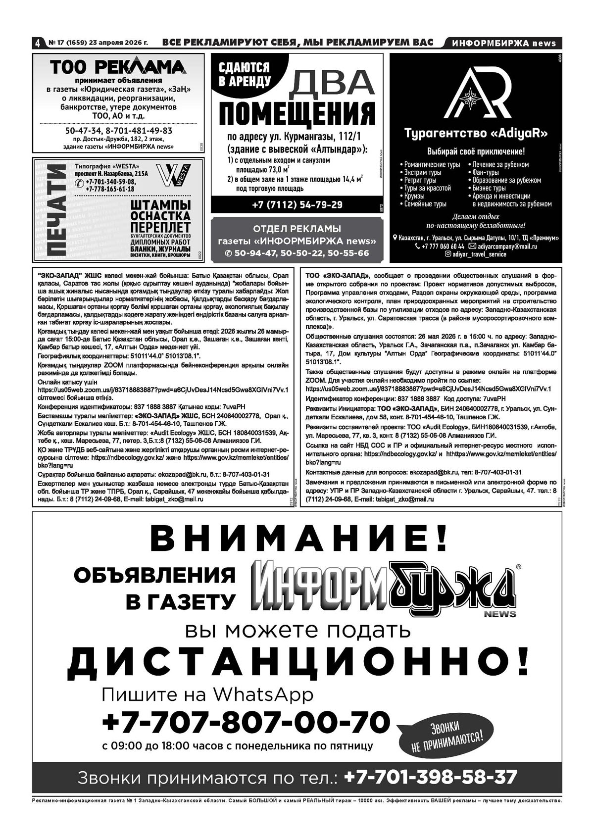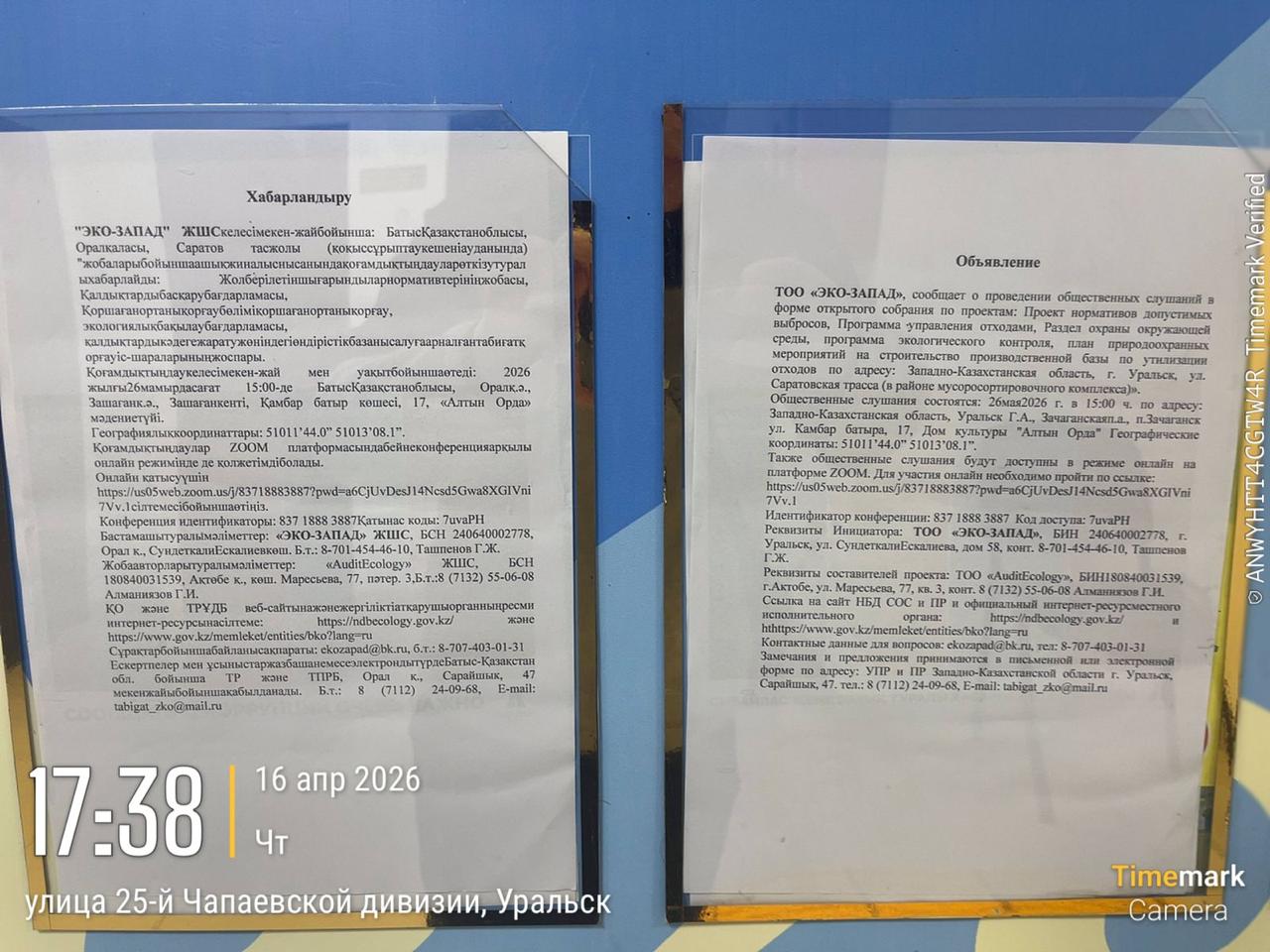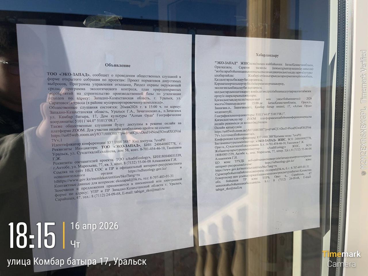 4. Повестка дня общественных слушаний: Намечаемой деятельностью ТОО «ЭКО-ЗАПАД» является прием, сортировка, переработка, утилизация, стабилизация и захоронение опасных и неопасных отходов. Реализация данного проекта позволит безопасно утилизировать переработать и восстанавливать образуемые в Западно-Казахстанской области и за ее пределами отходы. Многие перечисленные в проекте отходы, образуемые в области, передавались организациям на переработку в другие области, что нежелательно так увеличивается расстояние перевозимых отходов от источника образования что противоречит ст.330 ЭК о минимальном перемещении отходов, а так же влияет на здоровья населения в случае не правильного обращения с отходами. Планируемая мощность (производительность) объекта: 1.Участок Термической деструкции и инсинерации отходов (Установка термодестукции ДС -4000: производительность установки - 26 800 тн/г., Установка по сжиганию отходов "Форсаж-2": производительность установки - 1206 тн/г.) 2.Участок утилизации ртутьсодержащих отходов (Годовая производительность составляет 1 075 200 шт. ртутьсодержащих ламп, или 215.04 т/год ртутьсодержащих отходов.) 3.Участок по отчистке и восстановлению отработанных масел и СОЖ 9 Общая максимальная производительность – 2300 т/год) 4.Участок дробления (Максимальная производительность участка дробления «Аэролит» - 2 880 тн/год) 5.Участок механической разборки отходов (Максимальная мощность участка механического разбора оборудования 1576 тн/год.) 6.Участок стерилизации медицинских отходов (Максимальная производительность установок: Установка Шредер – 2880тн/год. Установка стерилизации мед. Отходов - WS-200YDA – 240тн/год.) Участок находится вдоль трассы Уральск -Саратов по соседству с полигоном ТБО г.Уральск и компанией по сортировке и переработке ТБО. Ближайщая жилая зона находится на расстоянии 3.42км на восток микрорайон Кен дала. С южной стороны на расстоянии 500м находится мусоросортировочный комплекс. С северной стороны на расстоянии 680 м находится полигон ТБО С восточной стороны на расстоянии 1520м находится городские очистные сооружения ЖБО С западной стороны на расстоянии 14км находится поселок Белес. Координаты земельного участка 51011’44.0” 51013’08.1”. Режим работы – непрерывный, круглосуточный с технологическими остановками. ЕкоЗапад приглашает вас на запланированную конференцию: Zoom. Тема: Конференция Zoom ЕкоЗапад Время: 26 мая 2026 02:00 PM Исламабад, Карачи, Ташкент Подключиться к конференции Zoom https://us05web.zoom.us/j/83718883887?pwd=a6CjUvDesJ14Ncsd5Gwa8XGIVni7Vv.1 Идентификатор конференции: 837 1888 3887 Код доступа: 7uvaPH