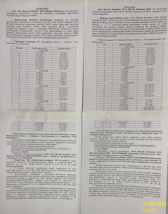 3. Общественные слушания организованны: УПРАВЛЕНИЕ НЕДРОПОЛЬЗОВАНИЯ, ОКРУЖАЮЩЕЙ СРЕДЫ И ВОДНЫХ РЕСУРСОВ ПАВЛОДАРСКОЙ ОБЛАСТИ, buhina.raushan@pavlodar.gov.kz, unosvr_15.07.2025@mail.ru, +77055403051, 8 7182 372178,