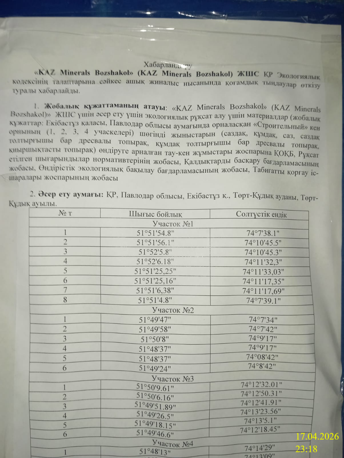 4. Повестка дня общественных слушаний: В качестве намечаемой деятельности рассматривается план горных работ (ПГР) на добычу осадочных пород (суглинков, супесей, глины, дресвяного грунта с суглинистым заполнителем, дресвяного грунта с супесчаным заполнителем, щебенистого грунта) месторождения «Строительный» (участки 1,2,3,4), расположенных на землях города Экибастуз Павлодарской области. ТОО «ТОО «KAZ Minerals Bozshakol» производит работы по добыче осадочных пород (суглинков, супесей, глины, дресвяного грунта с суглинистым заполнителем, дресвяного грунта с супесчаным заполнителем, щебенистого грунта) месторождения «Строительный» (участки 1,2,3,4) с целью выполнения работ по реконструкции и ремонта гидротехнических сооружений на основании разрешения №9 на добычу общераспространенных полезных ископаемых от 09.02.2025г. В настоящее время месторождение «Строительный» находится в стадии промышленной разработки, ведутся добычные работы на Участке №1. Месторождение «Строительный» расположено на землях города Экибастуз Павлодарской области Республики Казахстан. Ближайший населенный пункт – пос. Торткудук, расположен в 11 км на юг от участка.