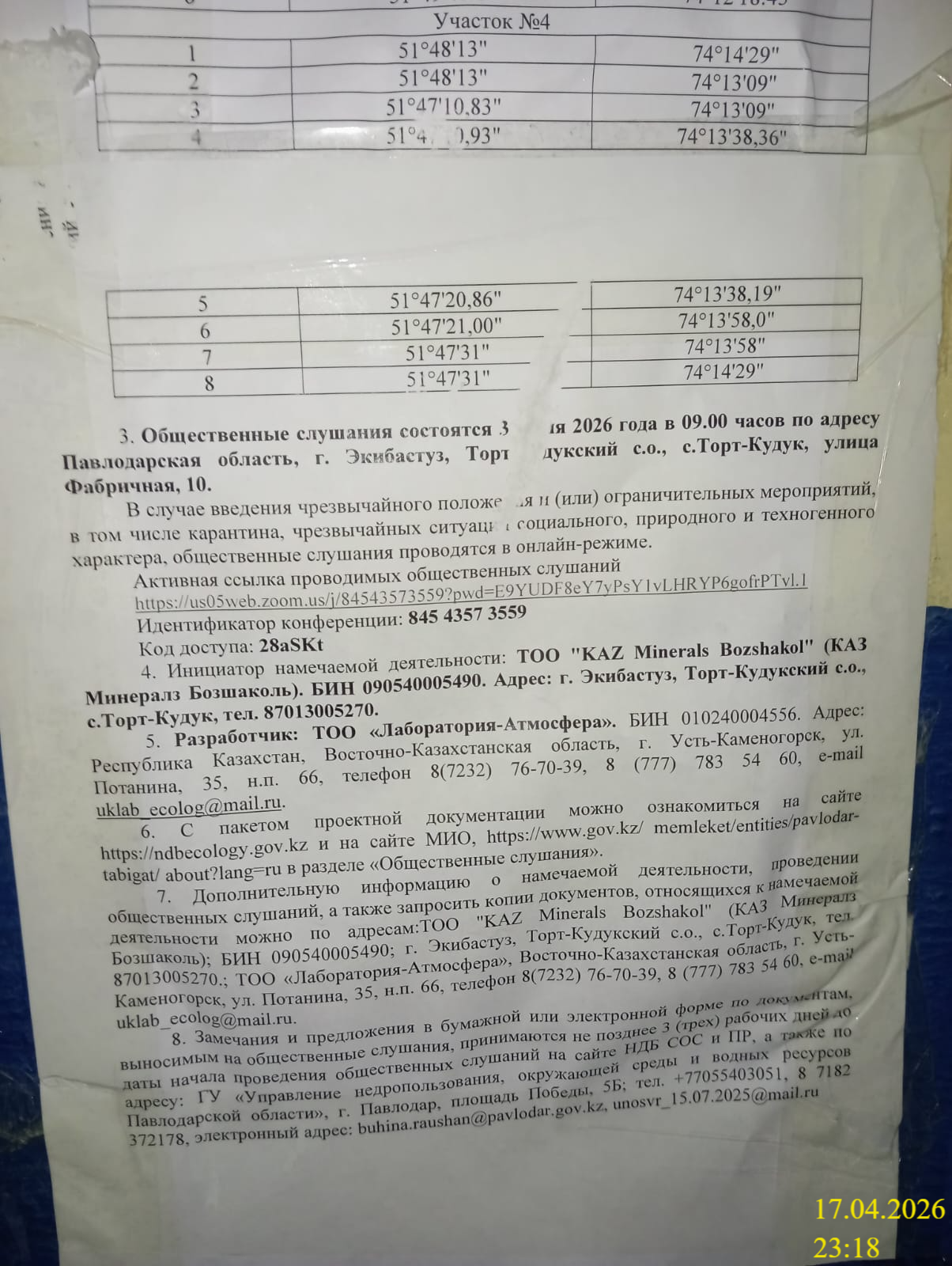 1.4. Описание для подключения к онлайн трансляции при прохождении общественного слушания: Тема: Материалы для получения экологического разрешения на воздействие для ТОО «KAZ Minerals Bozshakol» месторождение «Строительный» (участки 1,2,3,4) Время: 3 июн. 2026 09:00 AM Астана, Алматы Подключиться к конференции Zoom https://us05web.zoom.us/j/84543573559?pwd=E9YUDF8eY7yPsY1vLHRYP6gofrPTvl.1 Идентификатор конференции: 845 4357 3559 Код доступа: 28aSKt