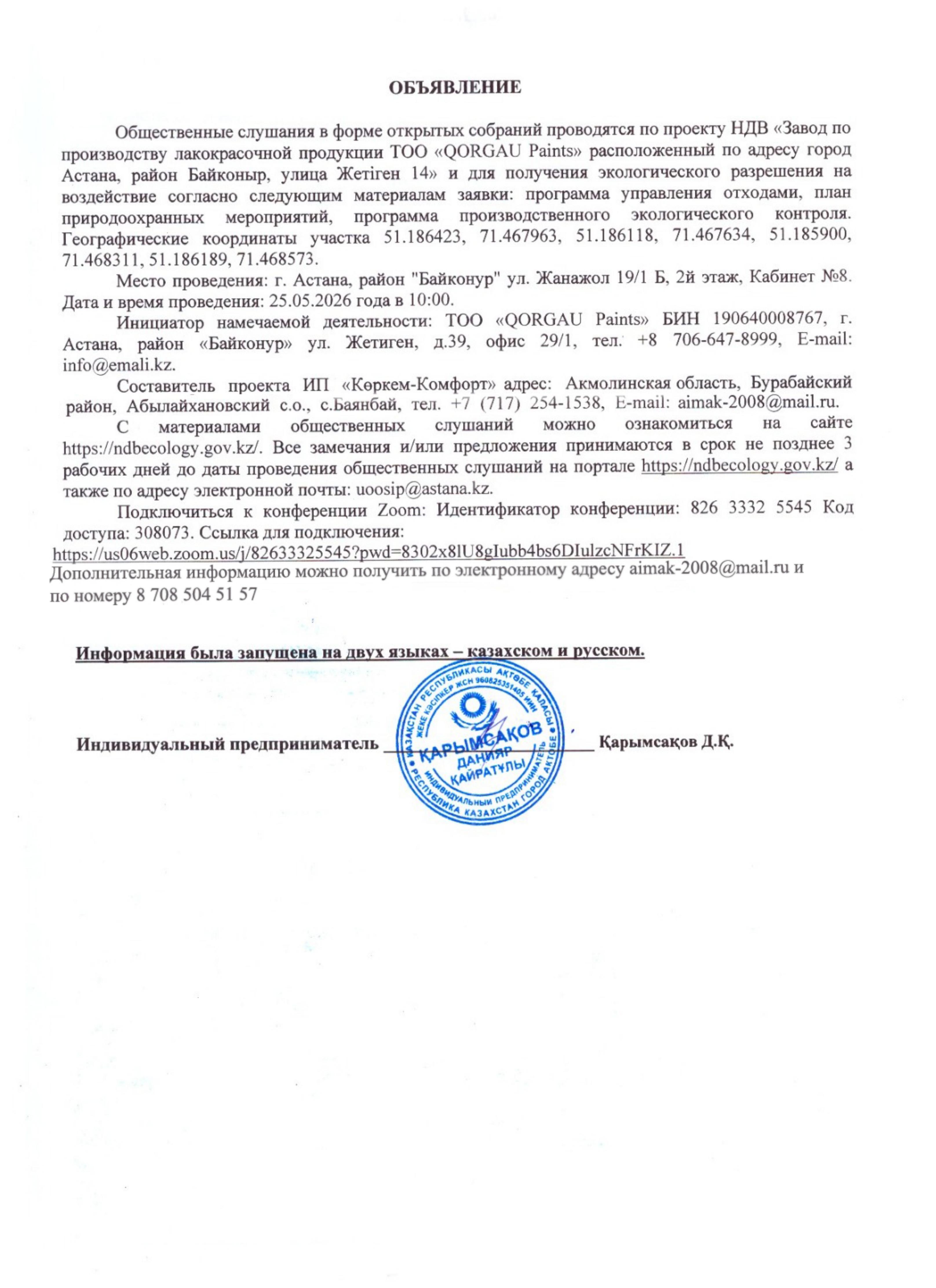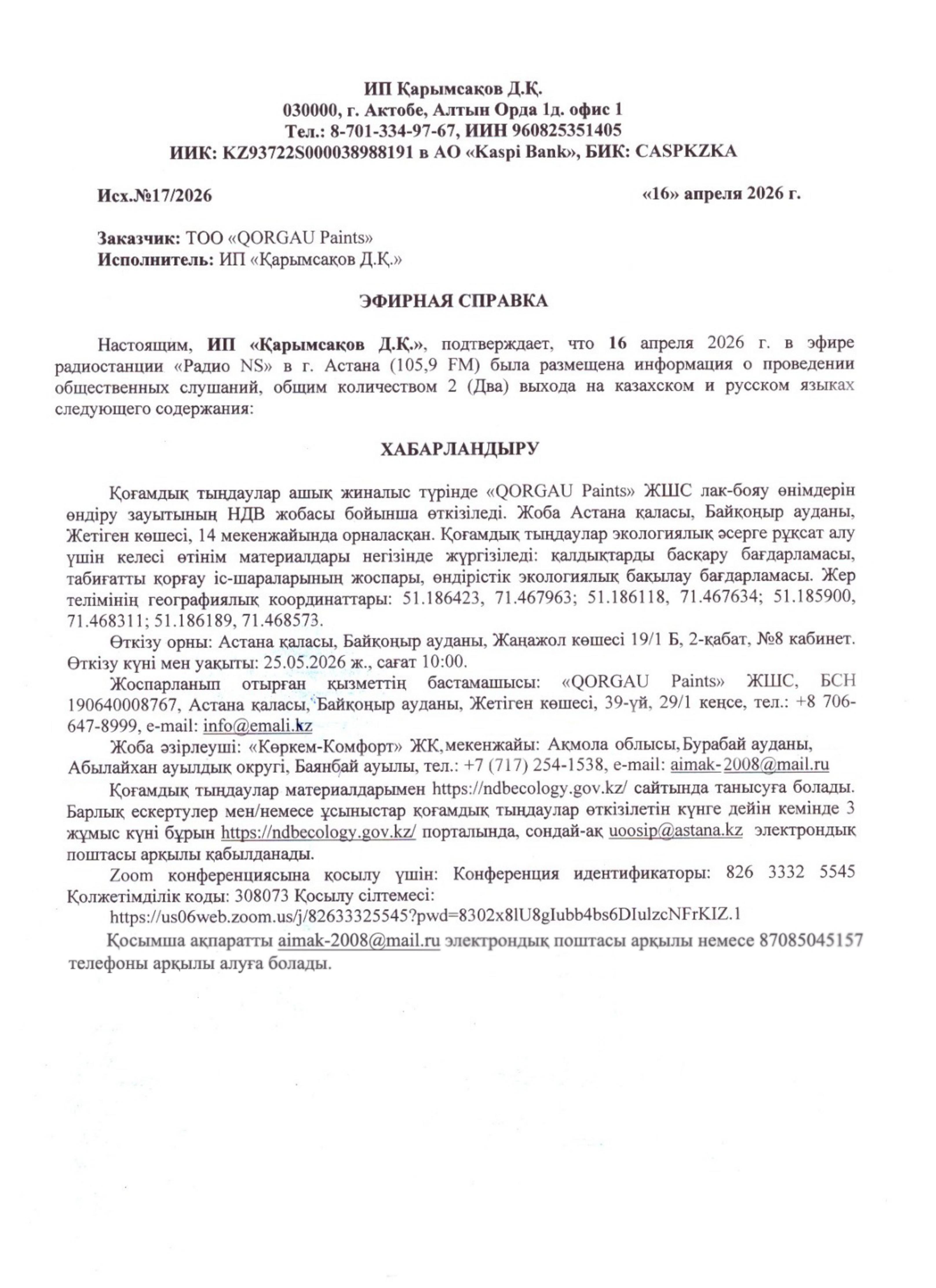 1.4. Описание для подключения к онлайн трансляции при прохождении общественного слушания: УООСП г. Астаны приглашает вас на запланированную конференцию: Zoom. Тема: Товарищество с ограниченной ответственностью ""QORGAU Paints"" Время: 25 мая 2026 10:00 Астана, Алматы Подключиться к конференции Zoom https://us06web.zoom.us/j/82633325545?pwd=8302x8lU8gIubb4bs6DIulzcNFrKIZ.1 Идентификатор конференции: 826 3332 5545 Код доступа: 308073
