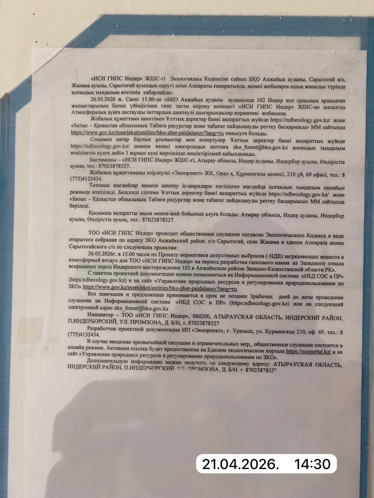 1.4. Описание для подключения к онлайн трансляции при прохождении общественного слушания: Тема: НДВ ИСИ ГИПС ИНДЕР Время: 26 мая 2026 03:00 PM Asia/Oral Подключиться к конференции Zoom https://us05web.zoom.us/j/87986821760?pwd=ZDgusK7wB5sSLKusbr14aGpbZcjwPy.1 Идентификатор конференции: 879 8682 1760 Код доступа: 5xt08x