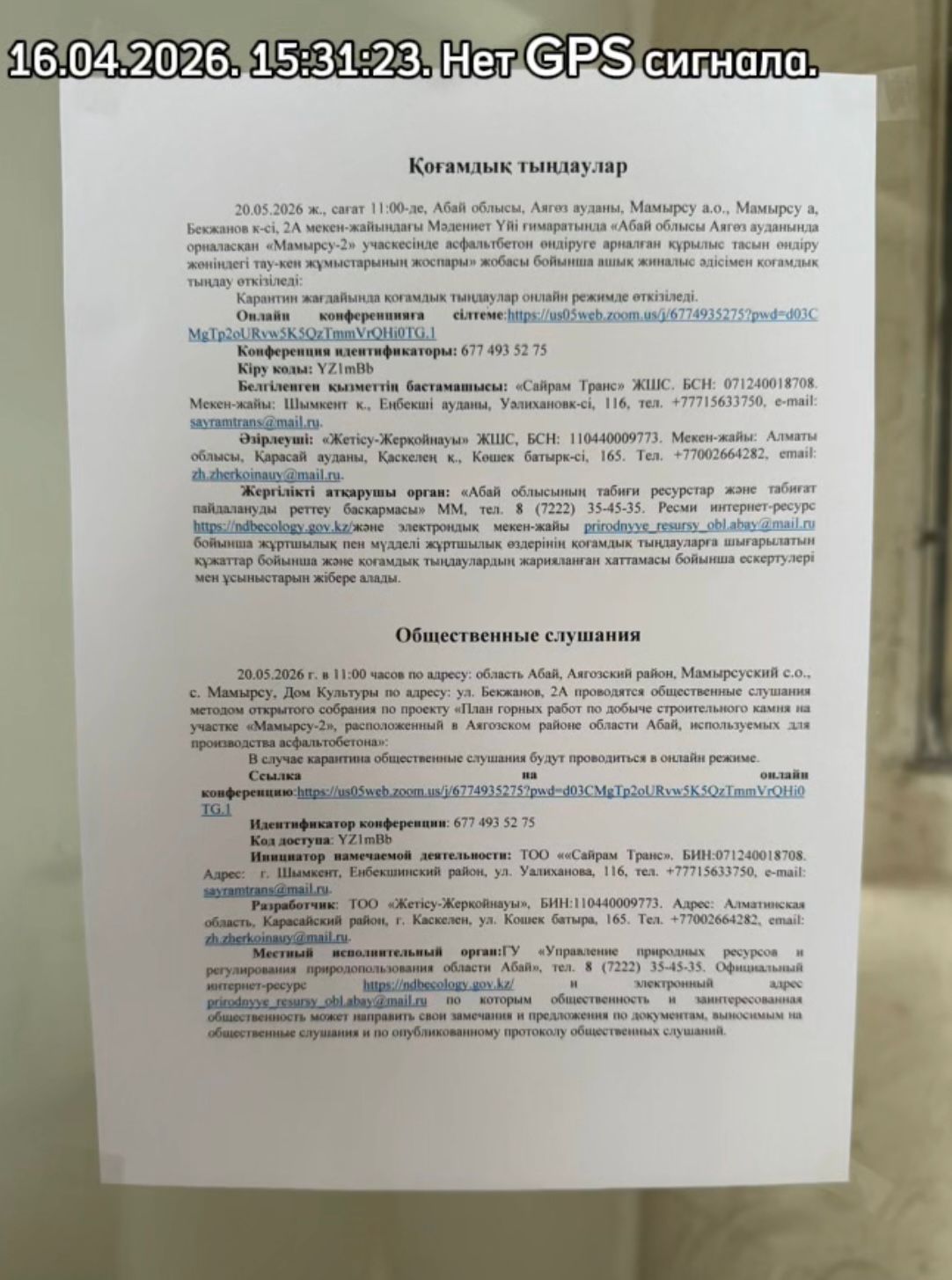 4. Повестка дня общественных слушаний: 20.05.2026 ж., сағат 15:00-де, Абай облысы, Аягөз ауданы, Мамырсу а.о., Мамырсу а, Бекжанов к-сі, 2А мекен-жайындағы Мәдениет Үйі ғимаратында «Абай облысы Аягөз ауданында орналасқан «Мамырсу-2» учаскесінде асфальтбетон өндіруге арналған құрылыс тасын өндіру жөніндегі тау-кен жұмыстарының жоспары» жобасы бойынша ашық жиналыс әдісімен қоғамдық тыңдау өткізіледі: Карантин жағдайында қоғамдық тыңдаулар онлайн режимде өткізіледі. Онлайн конференцияға сілтеме:https://us05web.zoom.us/j/6774935275?pwd=d03C MgTp2oURvw5K5QzTmmVrQHi0TG.1 Конференция идентификаторы: 677 493 52 75 Кіру коды: YZ1mBb Белгіленген қызметтің бастамашысы: «Сайрам Транс» ЖШС. БСН: 071240018708. Мекен-жайы: Шымкент қ., Еңбекші ауданы, Уәлихановк-сі, 116, тел. +77715633750, e-mail: sayramtrans@mail.ru. Әзірлеуші: «Жетісу-Жерқойнауы» ЖШС, БСН: 110440009773. Мекен-жайы: Алматы облысы, Қарасай ауданы, Қаскелең қ., Көшек батырк-сі, 165. Тел. +77002664282, email: zh.zherkoinauy@mail.ru. Жергілікті атқарушы орган: «Абай облысының табиғи ресурстар және табиғат пайдалануды реттеу басқармасы» ММ, тел. 8 (7222) 35-45-35. Ресми интернет-ресурс https://ndbecology.gov.kz/және электрондық мекен-жайы prirodnyye_resursy_obl.abay@mail.ru бойынша жұртшылық пен мүдделі жұртшылық өздерінің қоғамдық тыңдауларға шығарылатын құжаттар бойынша және қоғамдық тыңдаулардың жарияланған хаттамасы бойынша ескертулері мен ұсыныстарын жібере алады. 20.05.2026 г. в 15:00 часов по адресу: область Абай, Аягозский район, Мамырсуский с.о., с. Мамырсу, Дом Культуры по адресу: ул. Бекжанов, 2А проводятся общественные слушания методом открытого собрания по проекту «План горных работ по добыче строительного камня на участке «Мамырсу-2», расположенный в Аягозском районе области Абай, используемых для производства асфальтобетона»: В случае карантина общественные слушания будут проводиться в онлайн режиме. Ссылка на онлайн конференцию:https://us05web.zoom.us/j/6774935275?pwd=d03CMgTp2oURvw5K5QzTmmVrQHi0TG.1 Идентификатор конференции: 677 493 52 75 Код доступа: YZ1mBb Инициатор намечаемой деятельности: ТОО ««Сайрам Транс». БИН:071240018708. Адрес: г. Шымкент, Енбекшинский район, ул. Уалиханова, 116, тел. +77715633750, e-mail: sayramtrans@mail.ru. Разработчик: ТОО «Жетісу-Жерқойнауы», БИН:110440009773. Адрес: Алматинская область, Карасайский район, г. Каскелен, ул. Кошек батыра, 165. Тел. +77002664282, email: zh.zherkoinauy@mail.ru. Местный исполнительный орган:ГУ «Управление природных ресурсов и регулирования природопользования области Абай», тел. 8 (7222) 35-45-35. Официальный интернет-ресурс https://ndbecology.gov.kz/ и электронный адрес prirodnyye_resursy_obl.abay@mail.ru по которым общественность и заинтересованная общественность может направить свои замечания и предложения по документам, выносимым на общественные слушания и по опубликованному протоколу общественных слушаний.