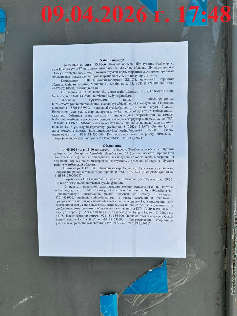 3. Общественные слушания организованны: Управление природных ресурсов и регулирования природопользования Жамбылской области, s.agabek@zhambyl.gov.kz,