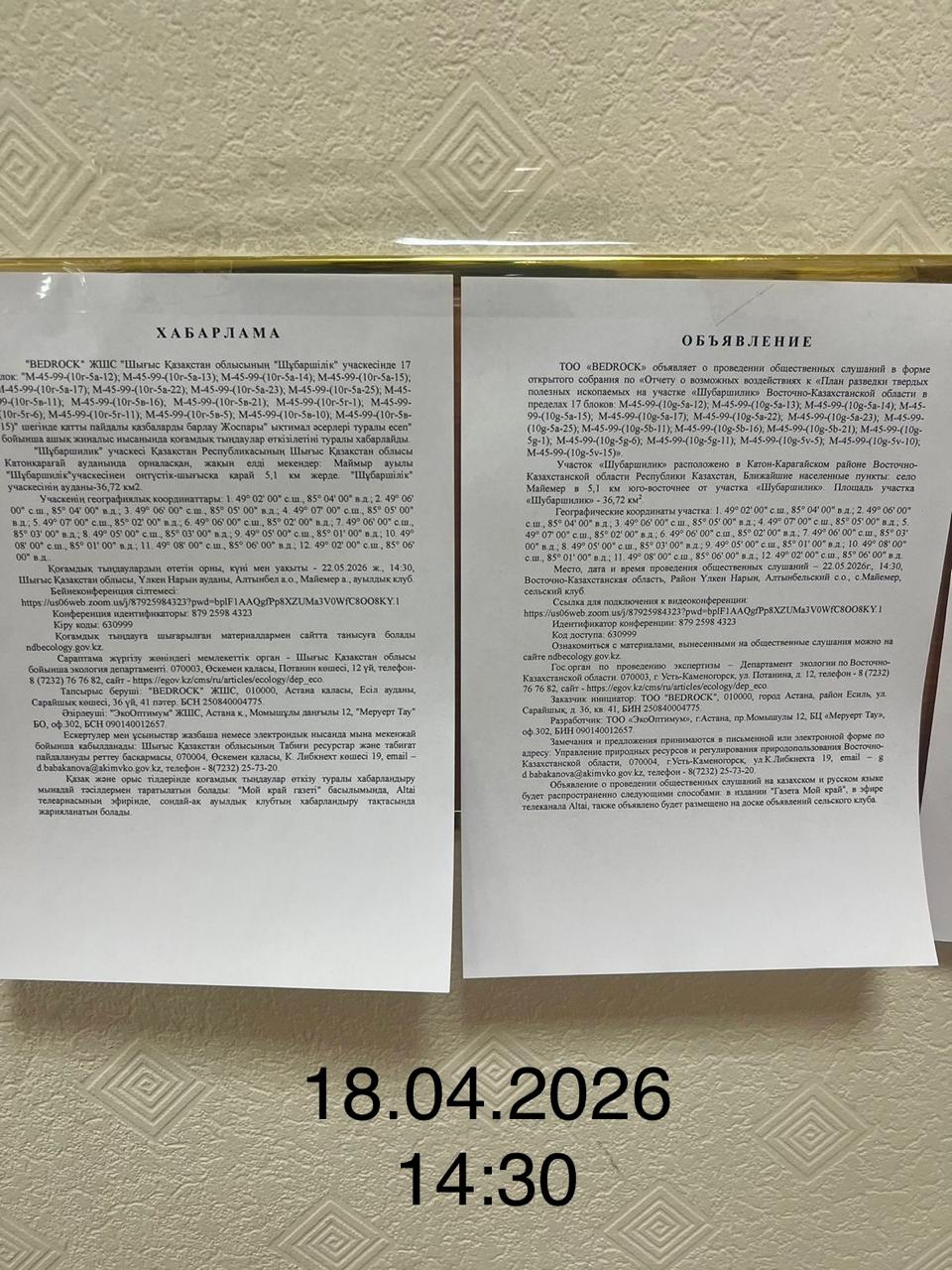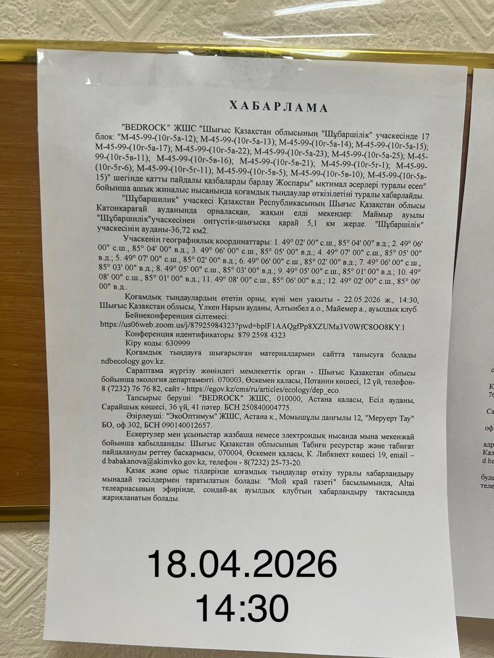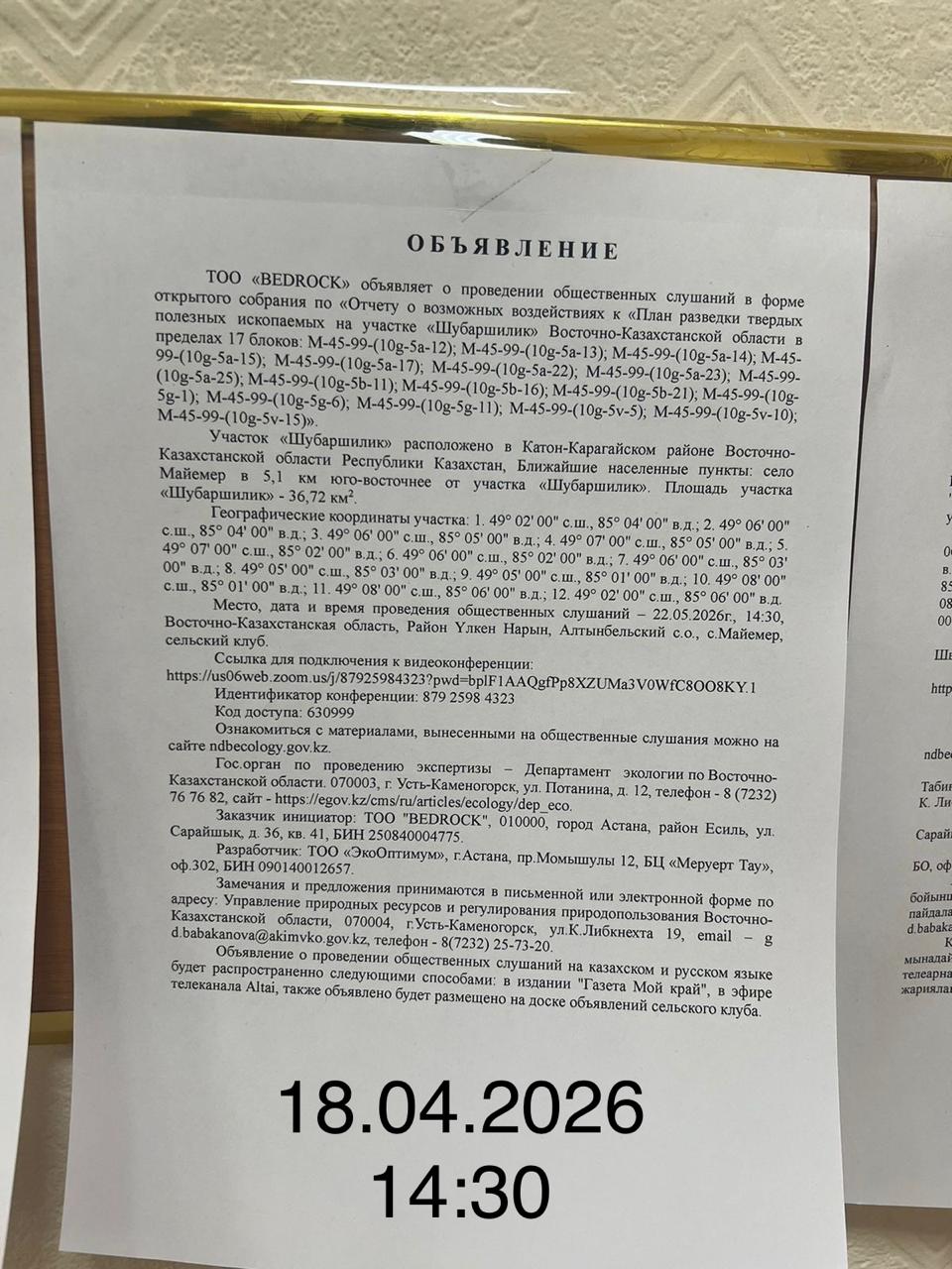 3. Общественные слушания организованны: Управление природных ресурсов и регулирования природопользования Восточно-Казахстанской области, d.babakanova@akimvko.gov.kz,