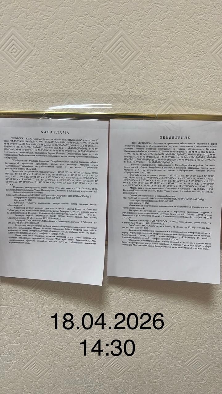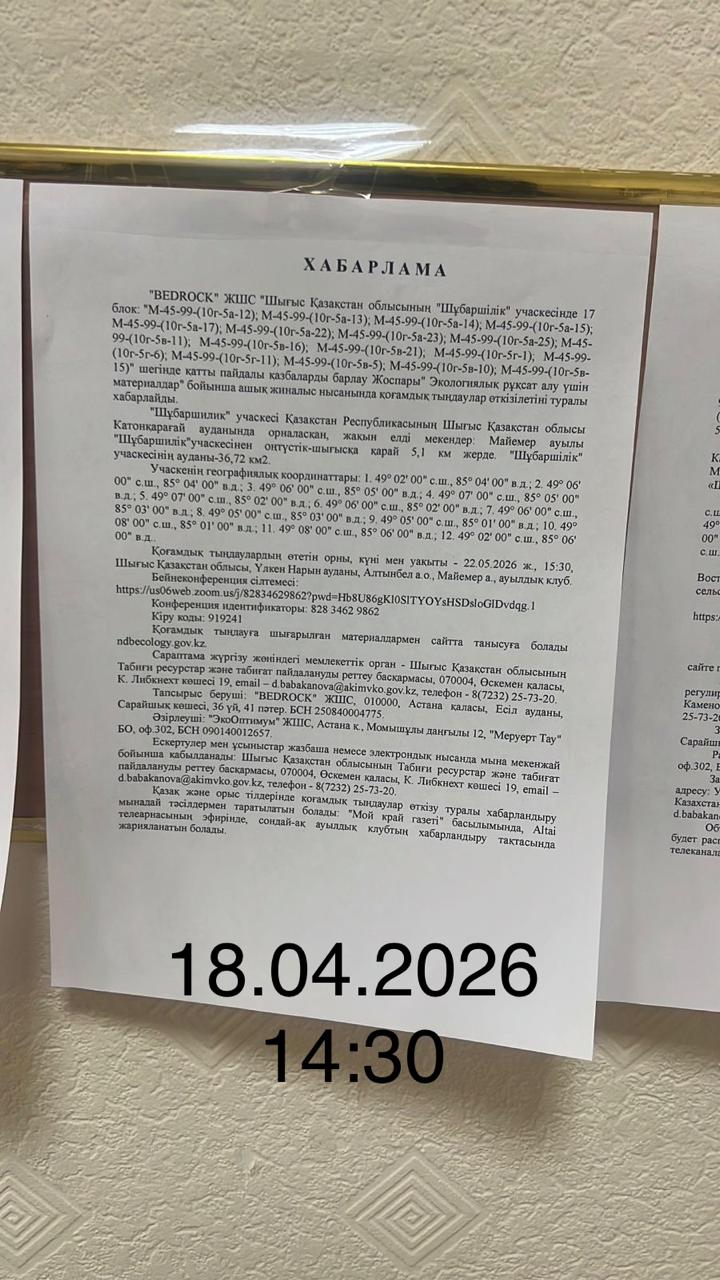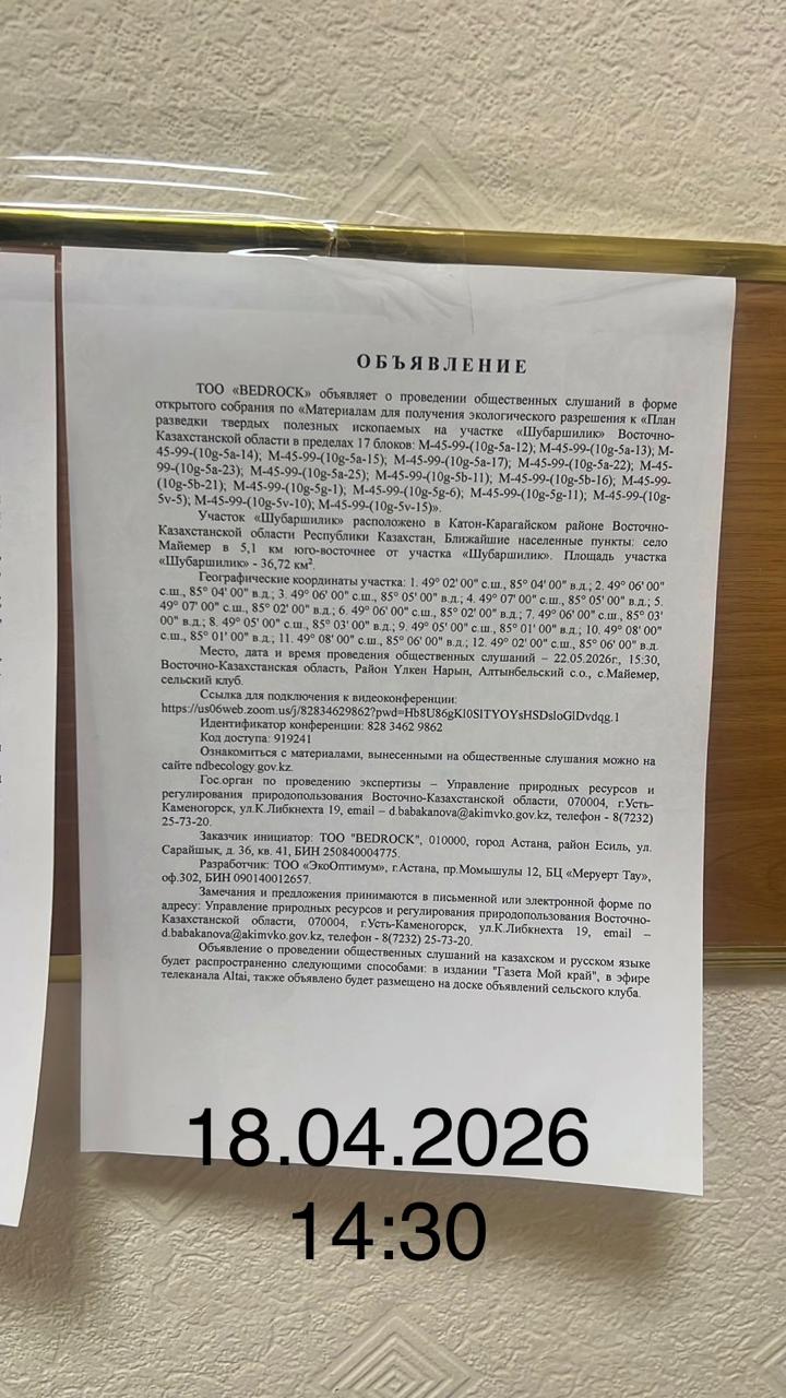 3. Общественные слушания организованны: Управление природных ресурсов и регулирования природопользования Восточно-Казахстанской области, d.babakanova@akimvko.gov.kz,
