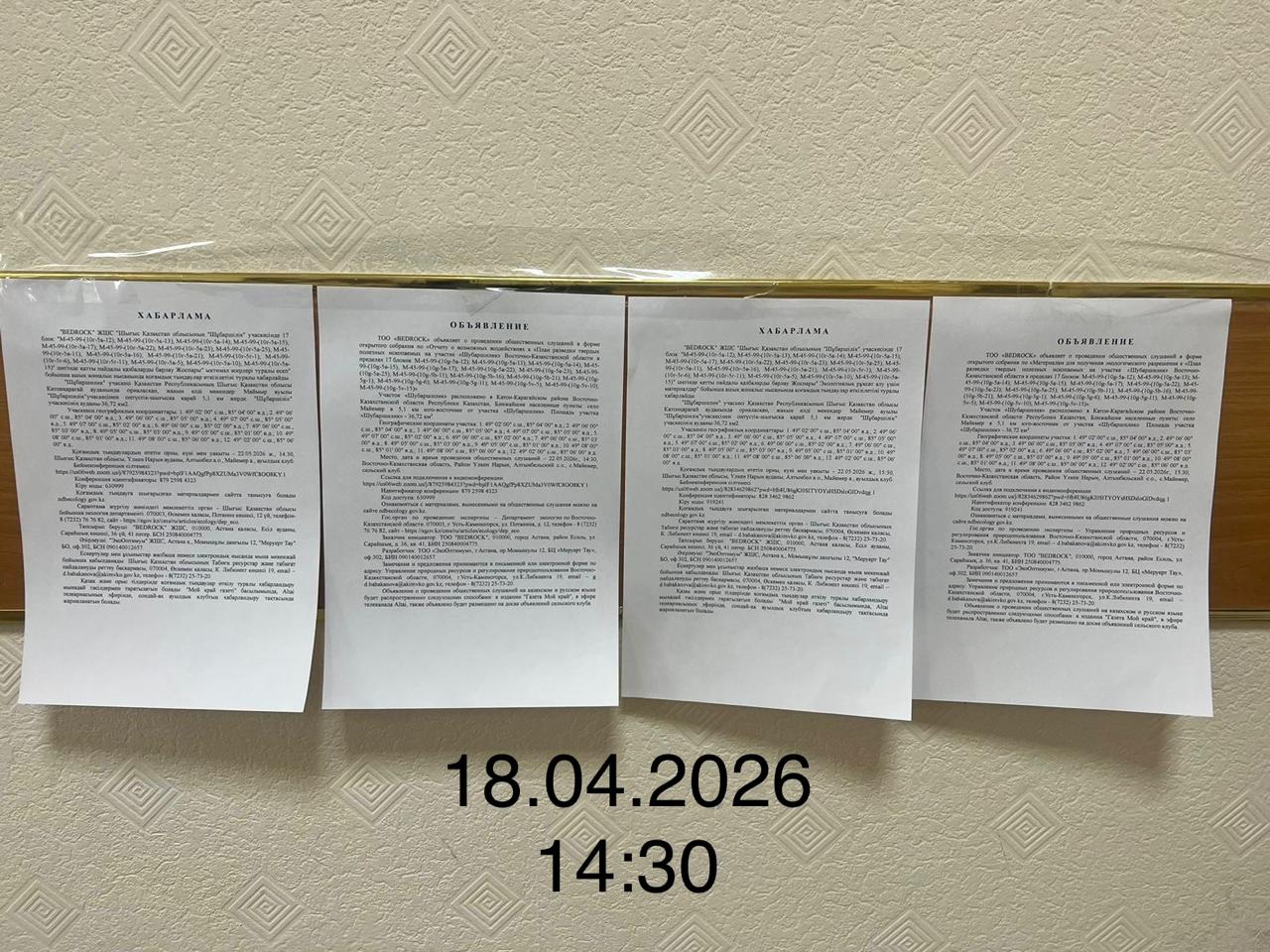6. Объявление о проведении общественных слушаний на казахском и русском языках будет распространено следующими способами: