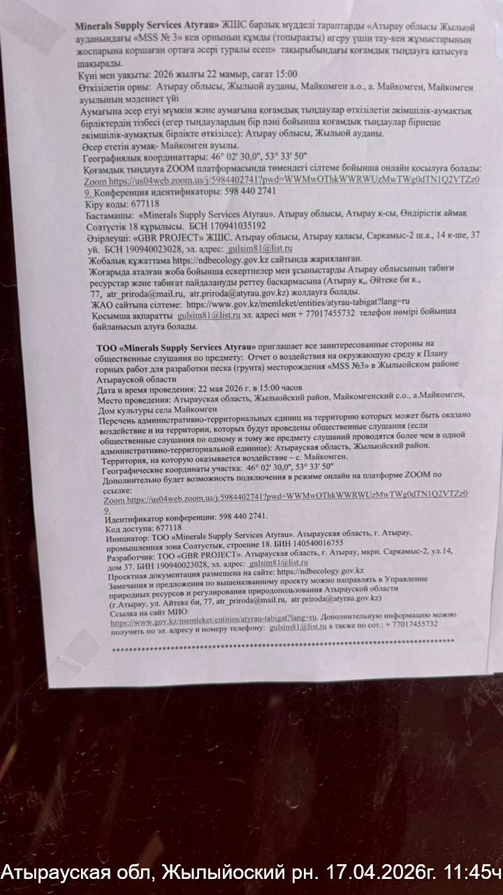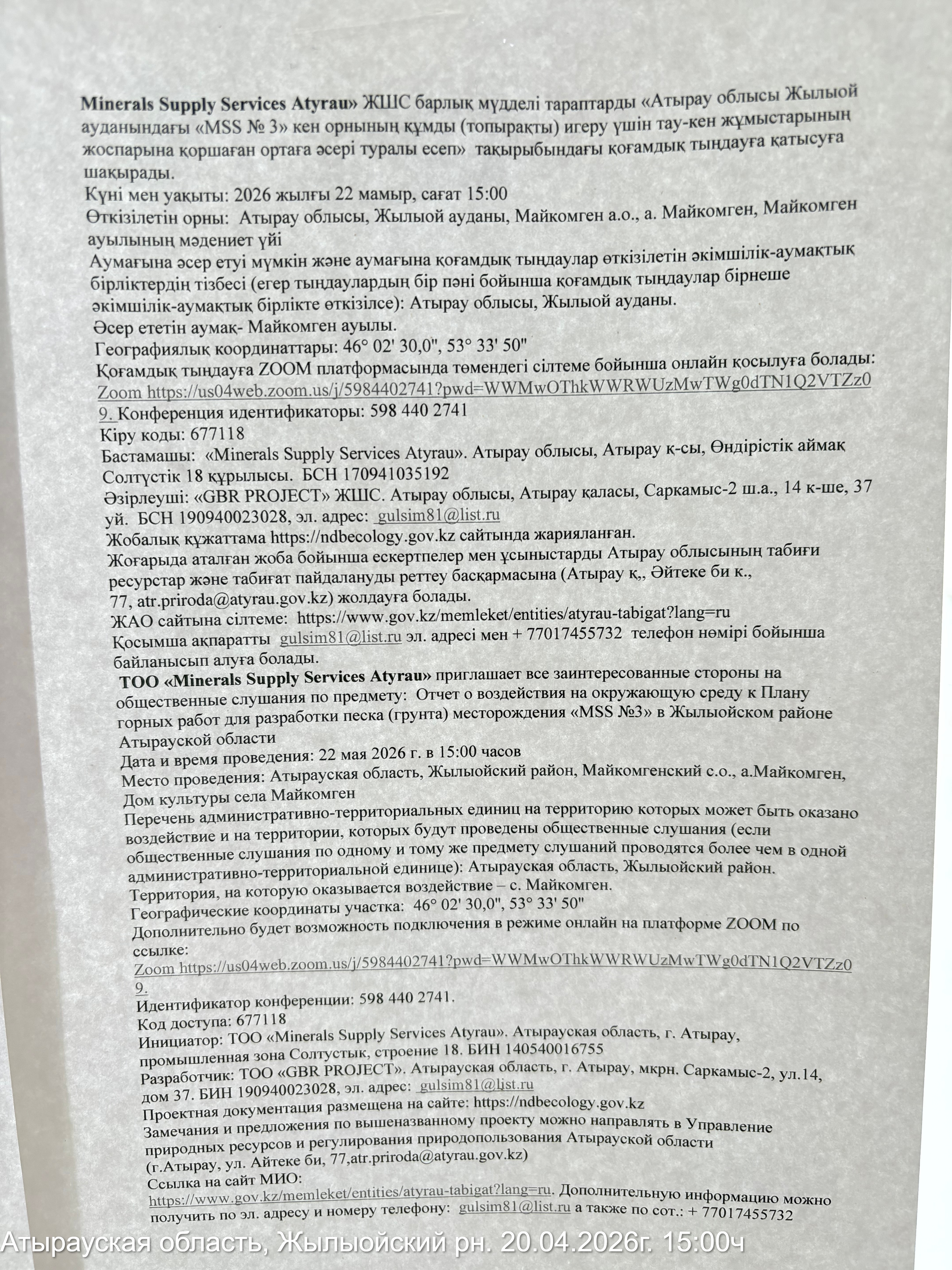 3. Общественные слушания организованны: Управление природных ресурсов и регулирования природопользования Атырауской области, atr.priroda@atyrau.gov.kz,